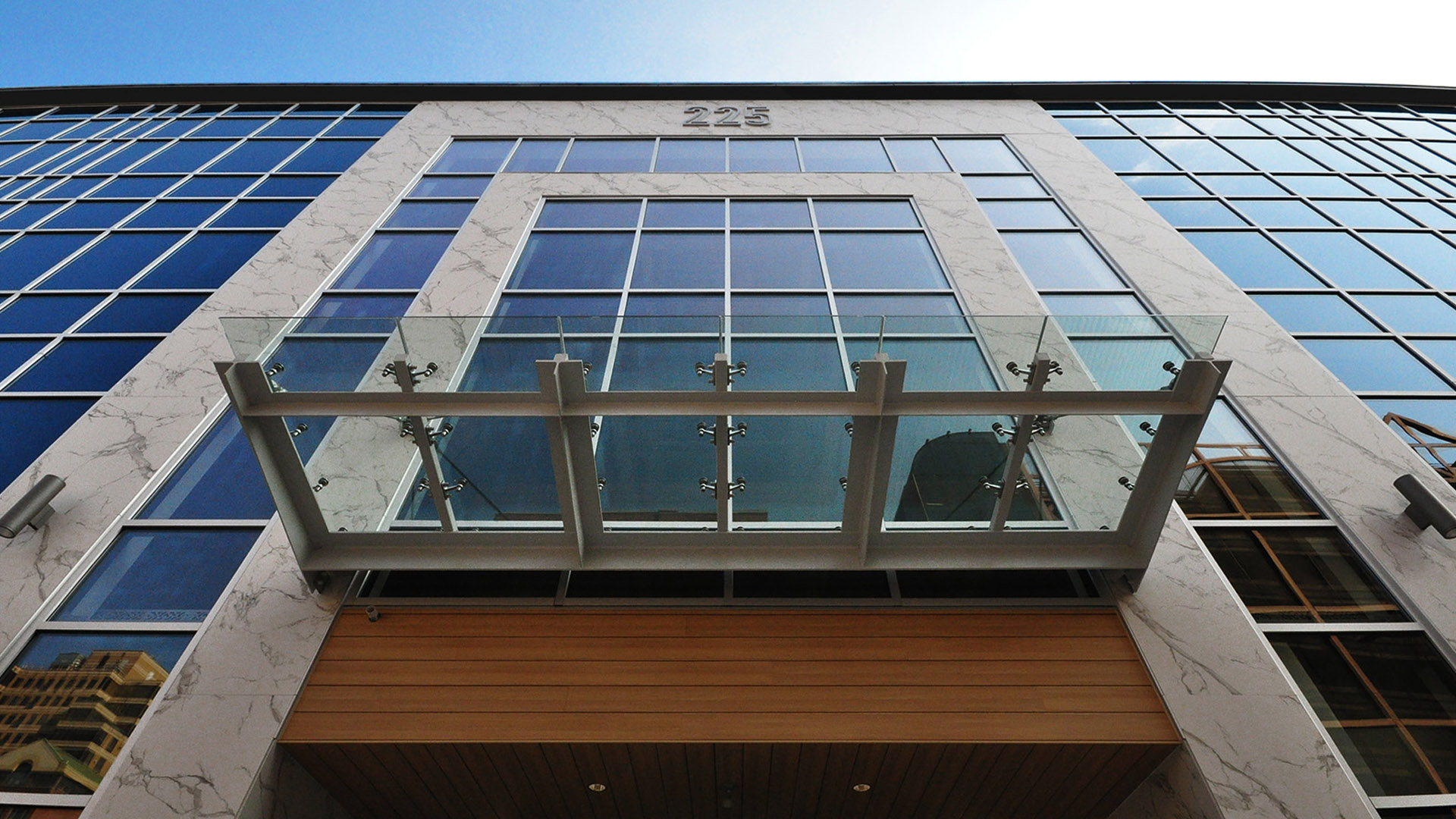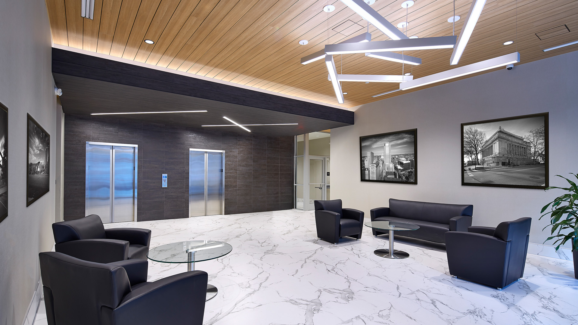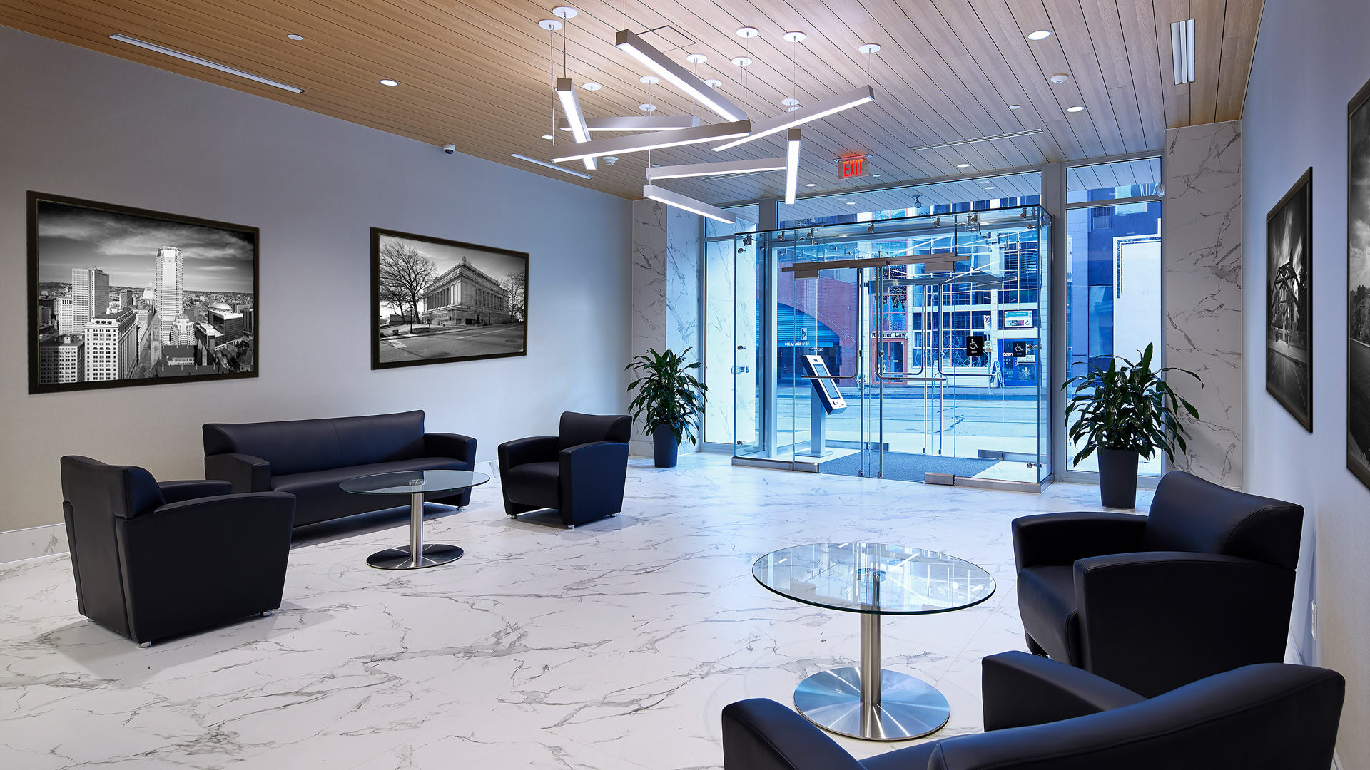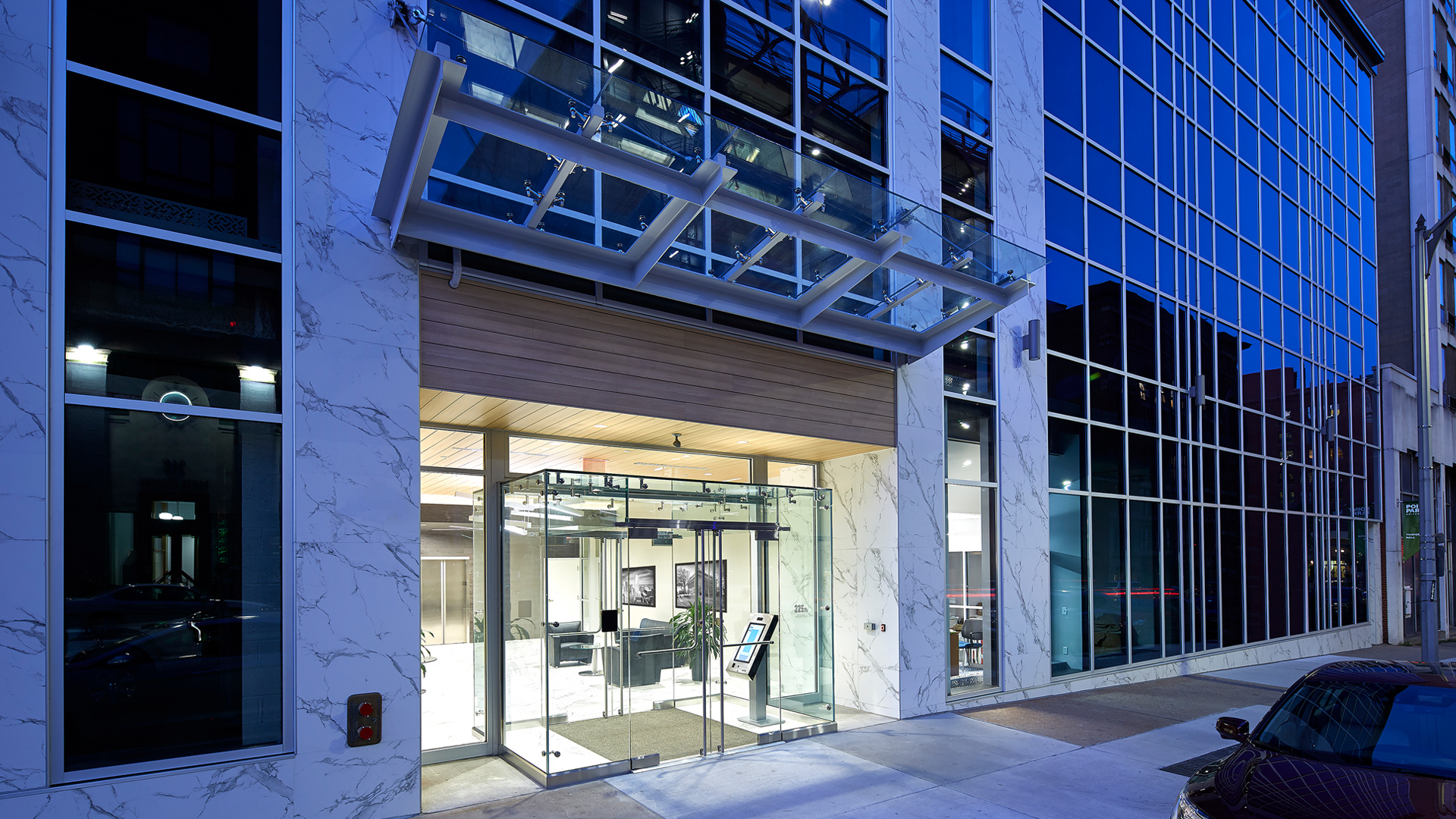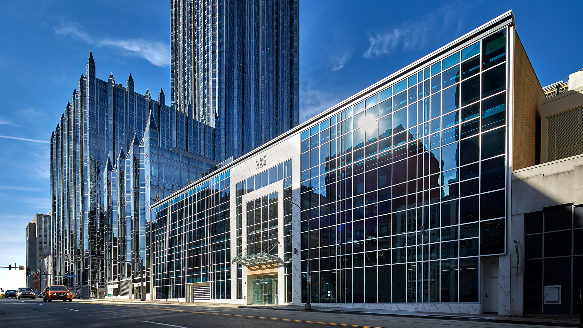 This existing 4-story office building, located in the heart of downtown Pittsburgh, was essentially a blank façade, dating back to the 1970’s. In desperate need of an upgrade, POH+W reimagined this façade as a bright and inviting space, connecting inside to out. POH+W’s new design concept replaced an uninviting mirror black glass façade and dark mullions and canopies with transparent glass, new clear anodized mullions and bright stone elements. A structural glass entrance canopy and frameless glass vestibule, sidewalk improvements and street trees round out the exterior improvements.