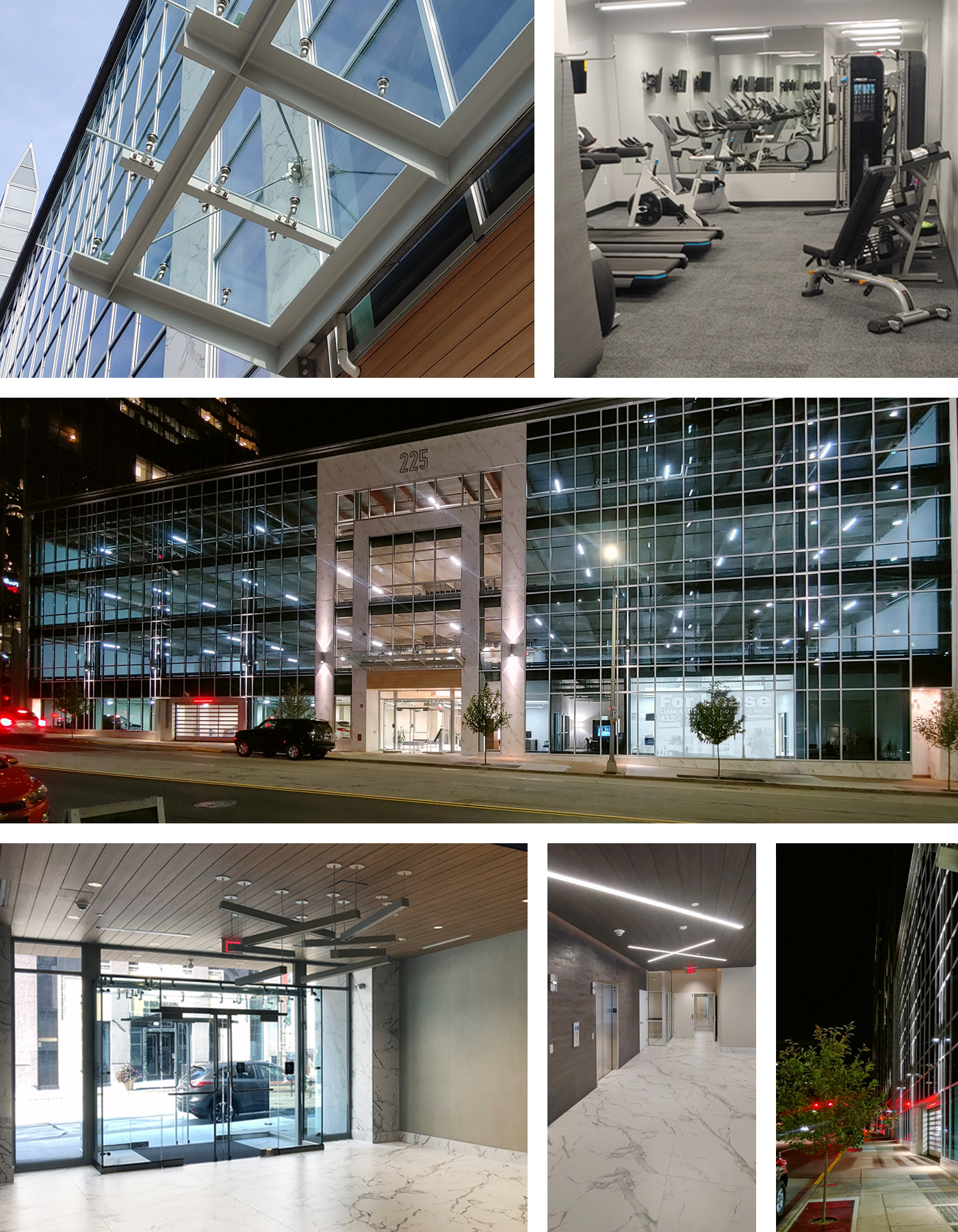 POH+W carried the same concepts of enlivening and enriching the space inside, working with the client to visualize and design a high-end entrance lobby with a high-tech data wall, incorporating stone from the façade and rich wood tones to warm the space. First floor office space tenant fit-out, upper floor elevator lobbies, complete restroom renovations, a fitness center for tenant use and updates to the parking garage round out the interior improvements POH designed. In addition to major upgrades to the thermal properties of the new glass facade, sustainability strategies include LED lighting throughout, improved plumbing efficiency and bicycle storage with a ground floor shower and changing room to encourage sustainable commuting strategies. The overall result transformed this tired structure into a truly modern and beautiful Class A Office experience, attracting higher end tenants and rental income.
