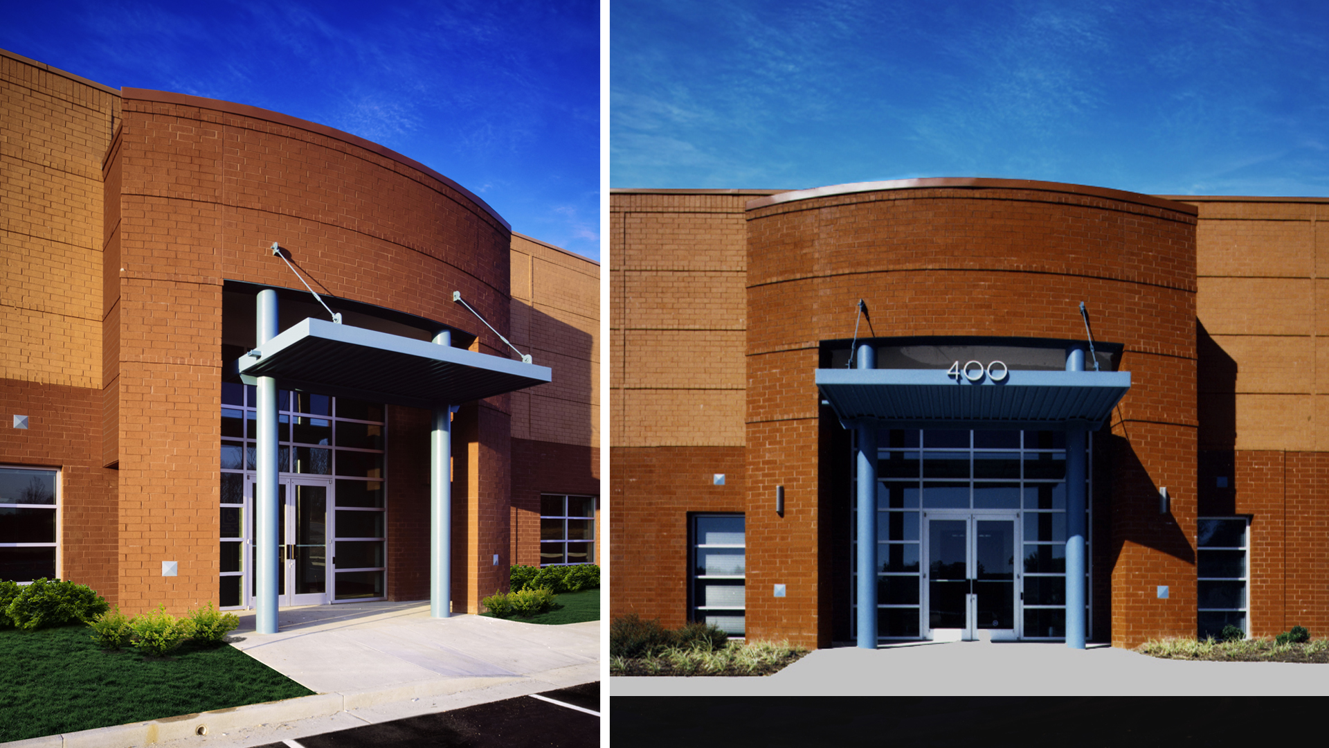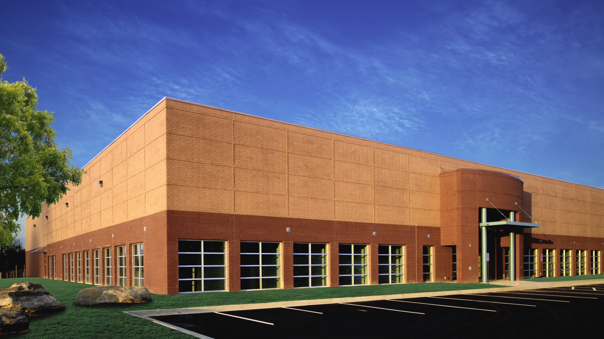 All brick design emphasizes the height of the building and meets the requirements of the office park.