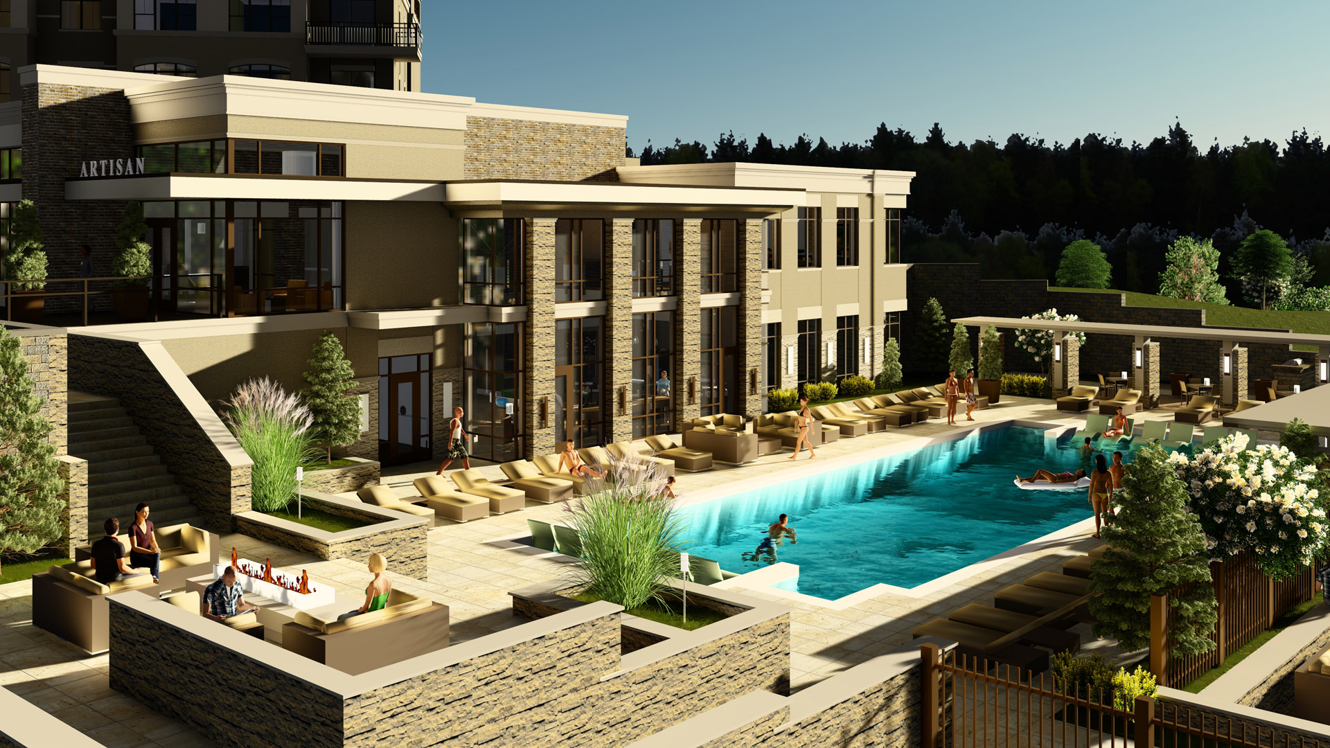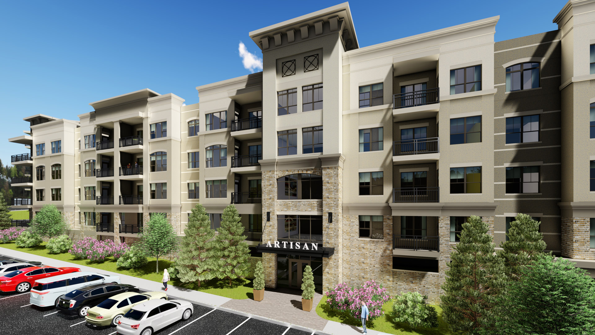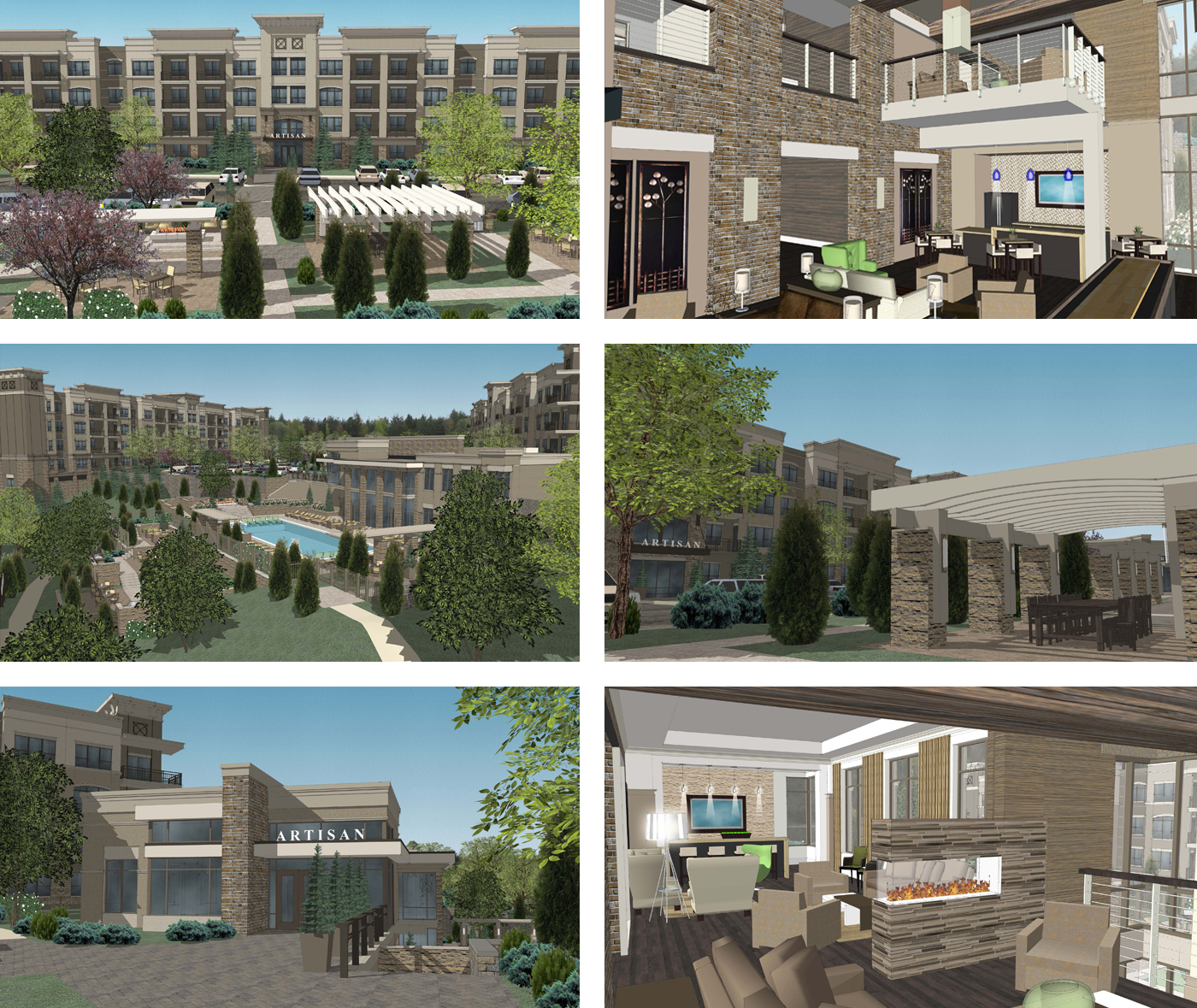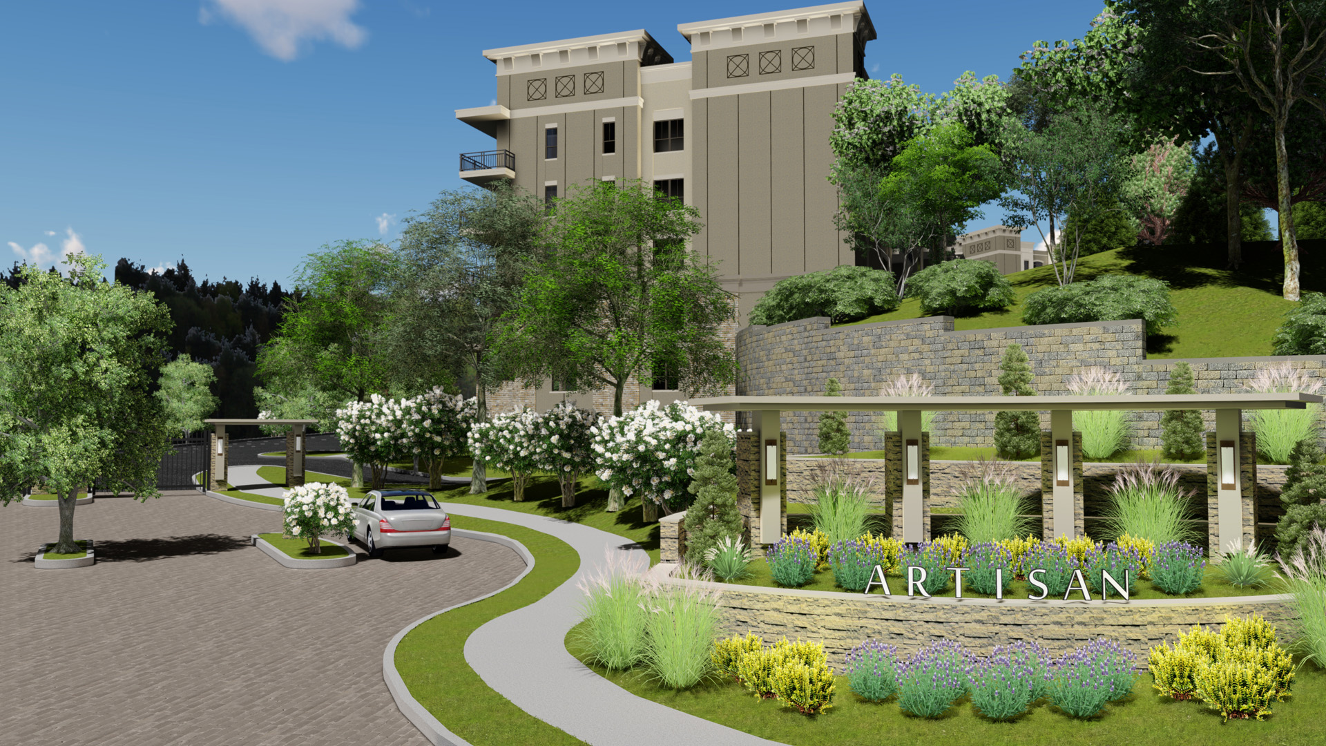 Balancing large buildings on a steeply sloping site presents a challenge. POH+W Architects sensitively positioned each building of the Artisan Apartments for efficient construction and resident convenience. The units feature granite countertop kitchens, high-end modern finishes and appliances to evoke a luxurious feel.