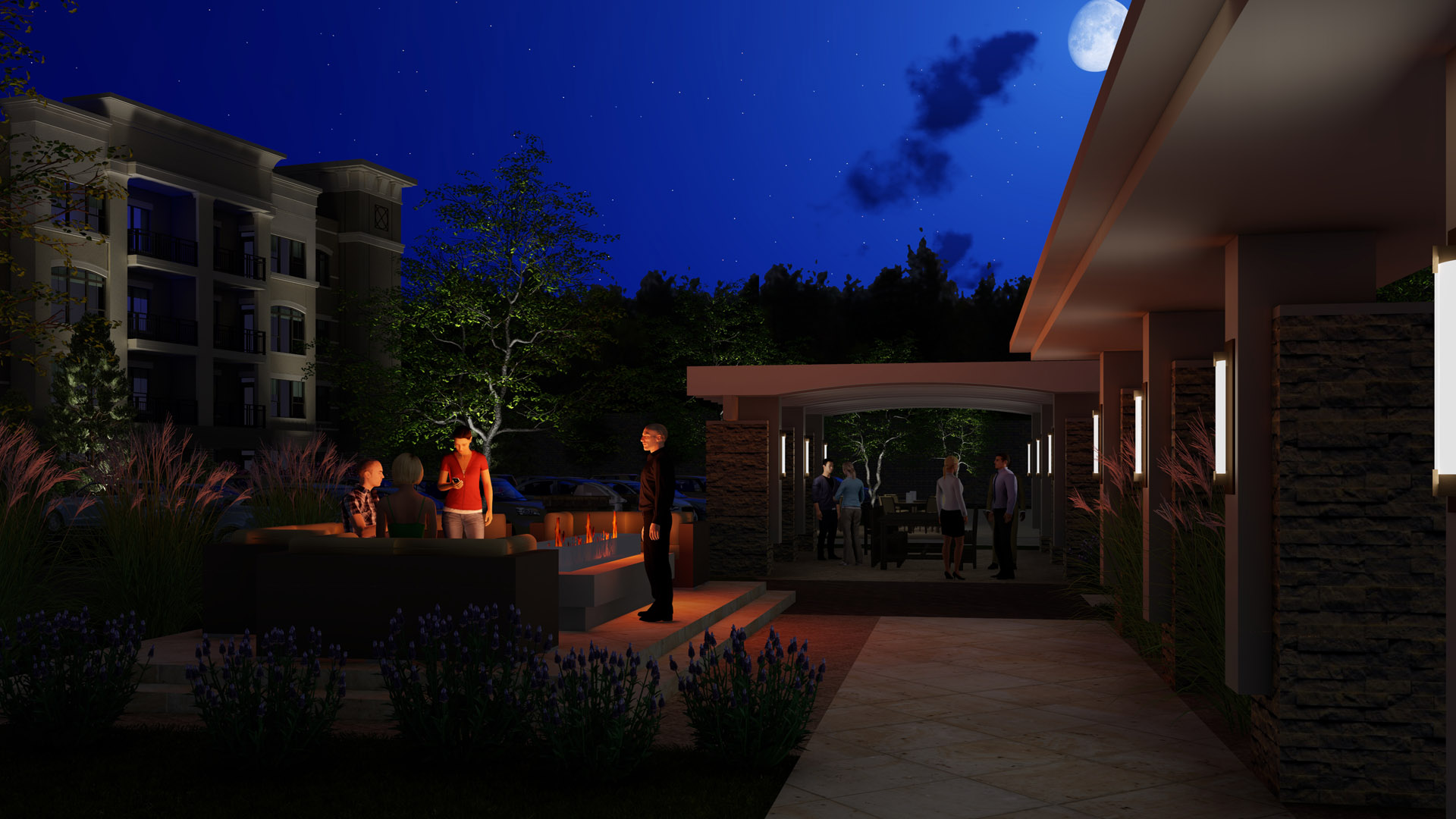 The modern clubhouse centralizes the development and offers unique pool views, cut into the hillside for an optimal lounge location. Additionally, clubhouse amenities include a movie theater and a dog-wash room. An abundance of outdoor common areas creates a unique residence, featuring a swimming pool with a firepit lounge, terraced patios with fire pits, outdoor kitchens, and intimate seating areas for a refreshing experience.