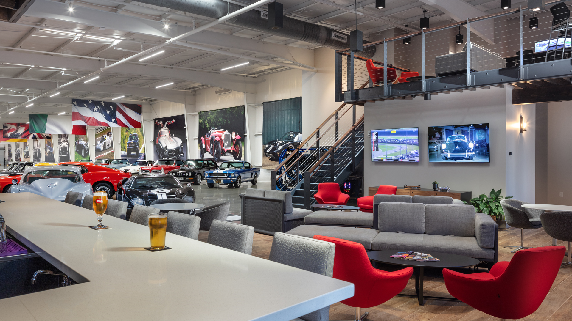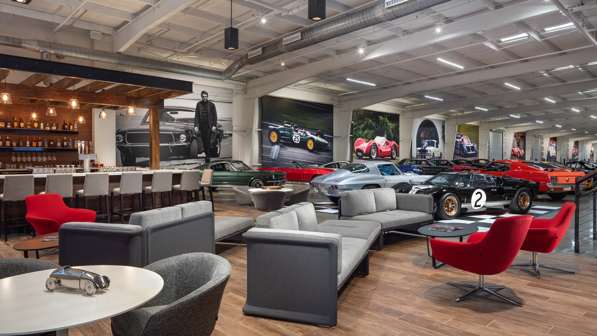 Members of the club enjoy the comfortable lounge areas, relishing the full bar and offerings from the catering kitchen. Photography platforms and detailing stations are tailored to the distinct hobby. A variety of seating presents opportunities for socialization and comradery.