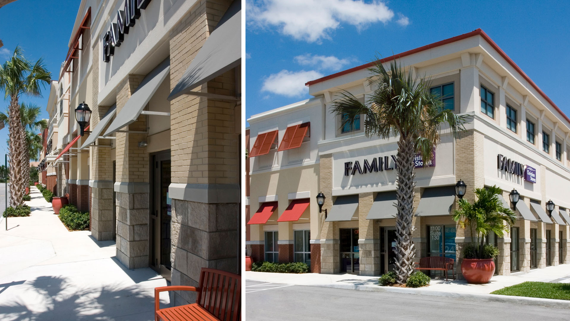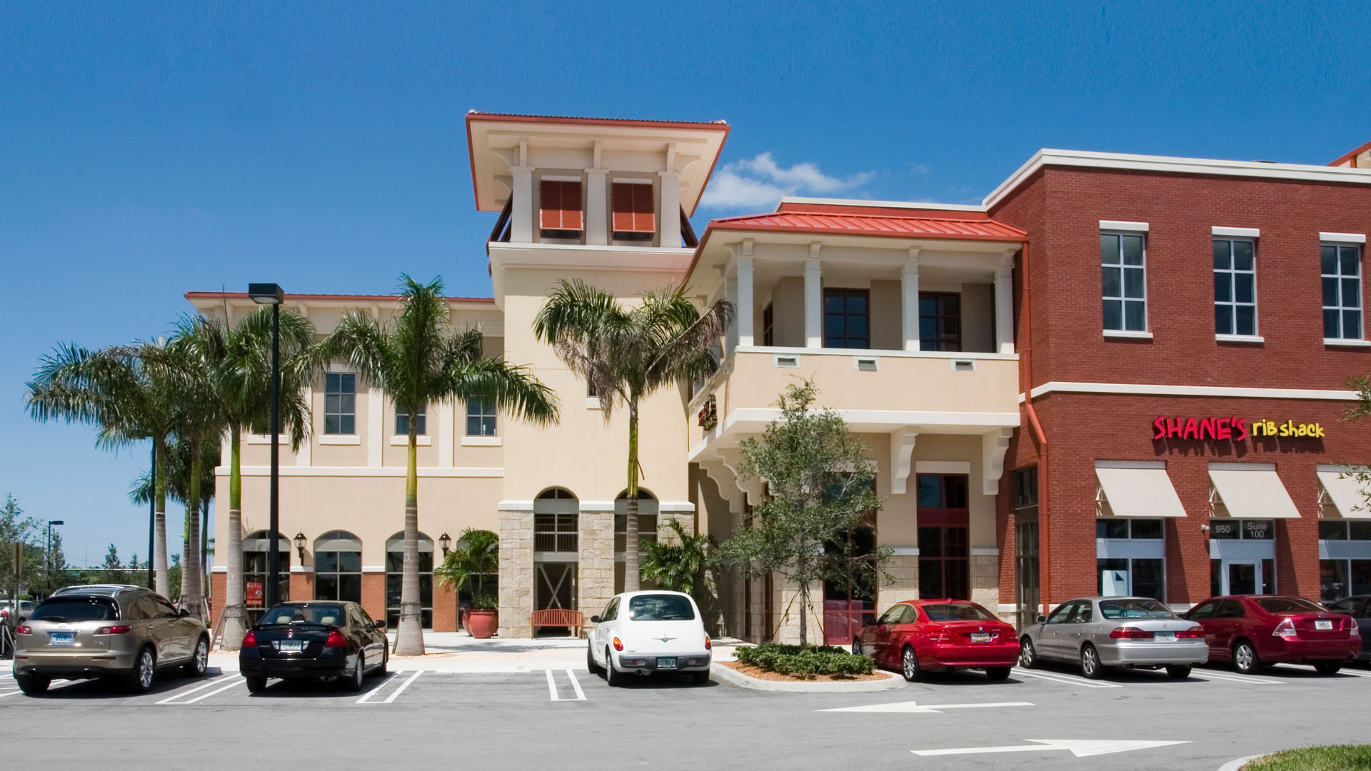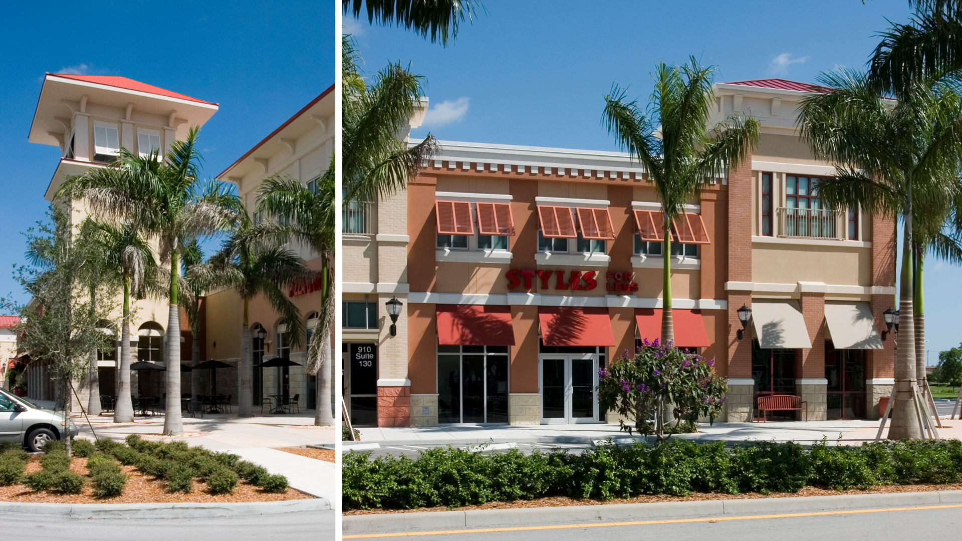 The development features an array of national tenants, offering a base to the office and residential space above. Shutters, clay roof tiles, and deep overhangs mark this development with coastal character.