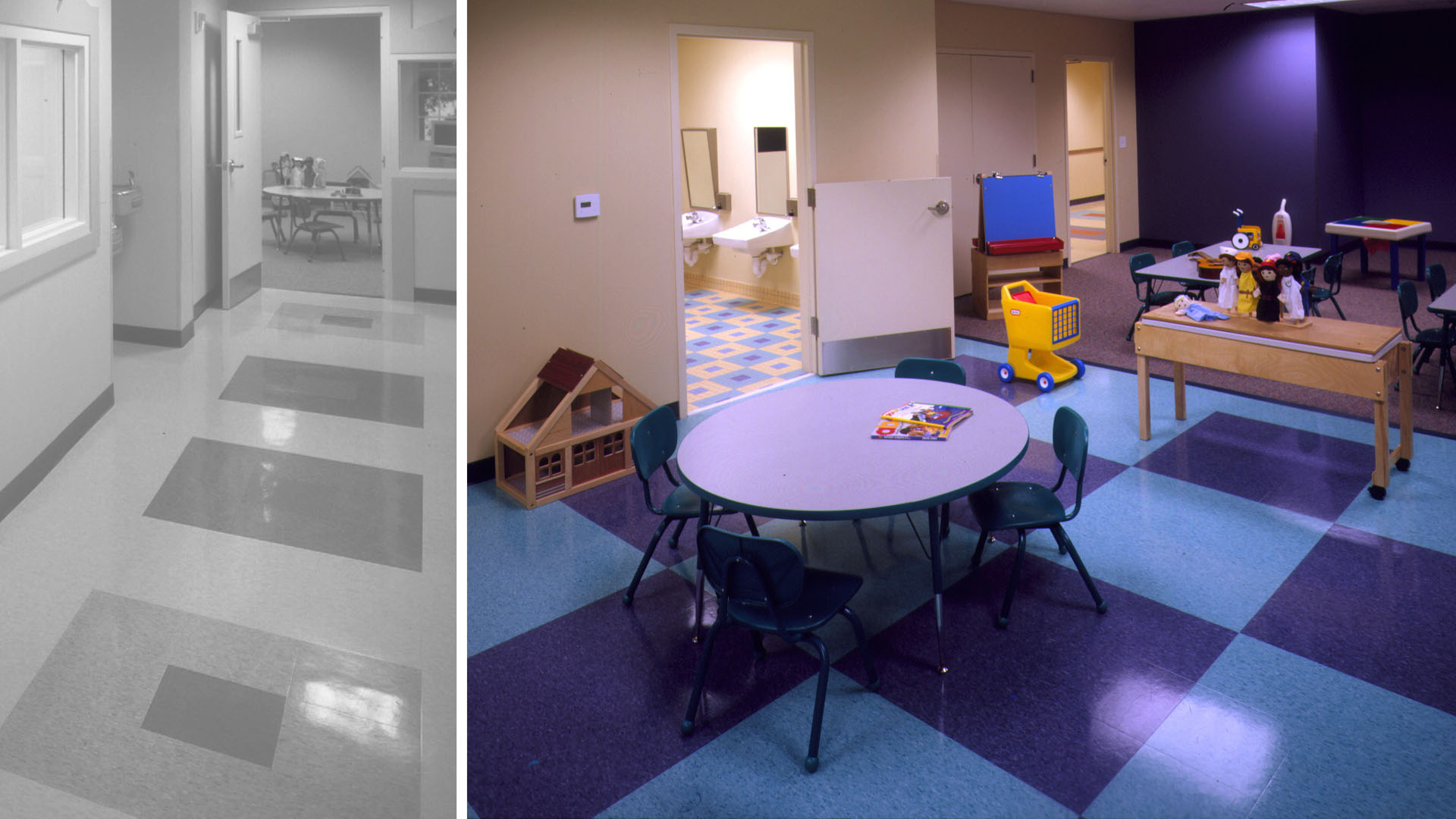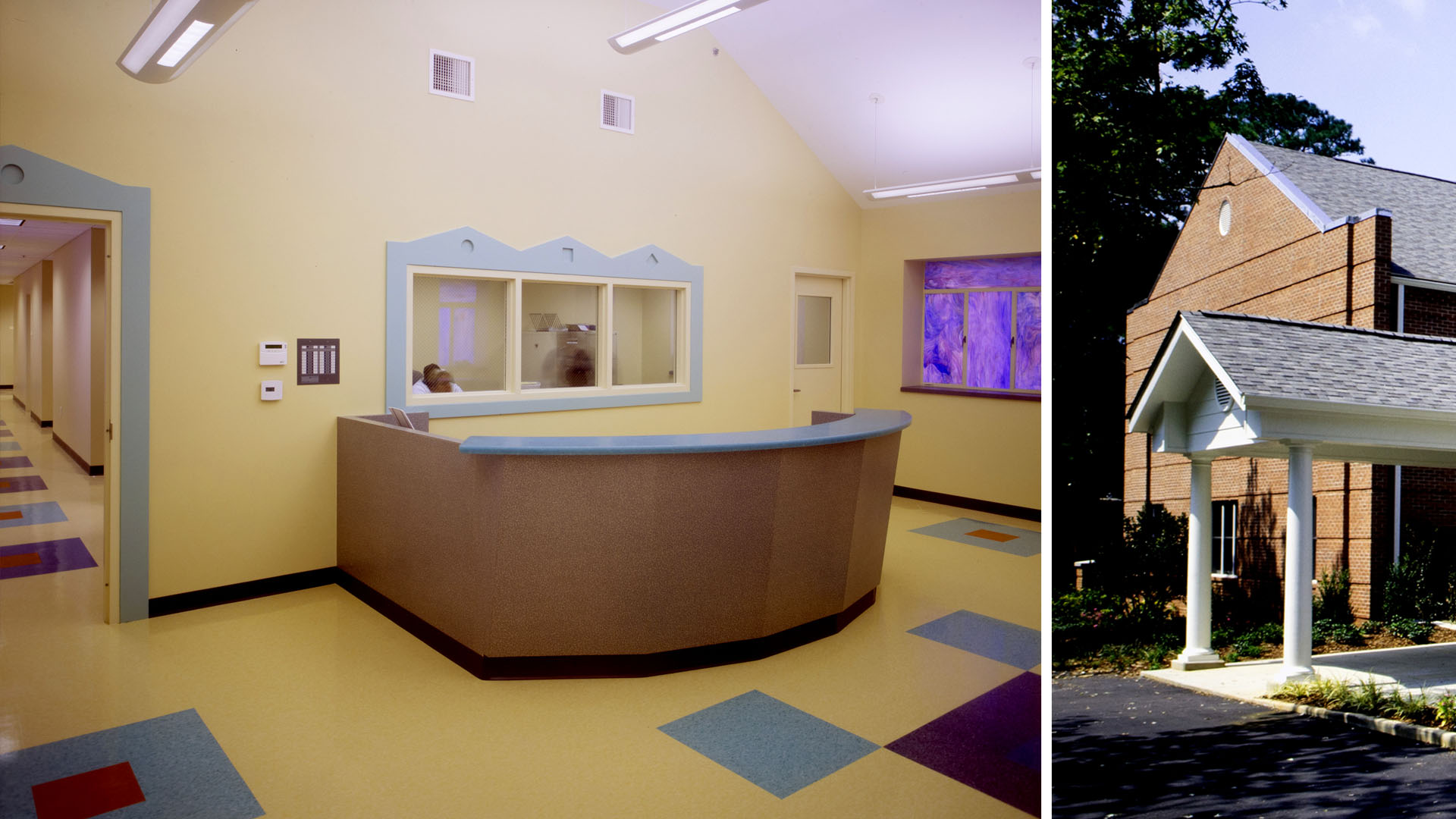 The custom-designed reception desk, along with colorful, whimsical details set the mood for pre-kindergarten children. The renovation included a central gathering space, office space, classrooms, and a commercial kitchen. An outdoor playground area was designed to accommodate various age groups.