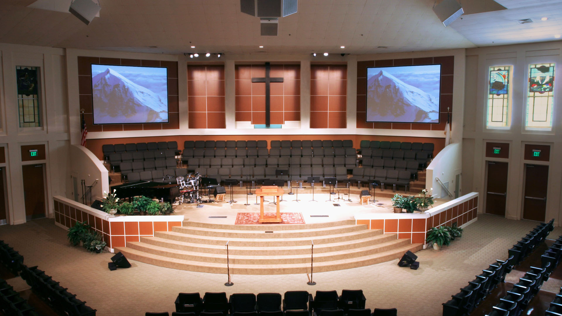 Renovation of the existing sanctuary increased seating by 20%. The main pulpit presentation was re-envisioned with large integrated video projection screens that improved views for the entire congregation.