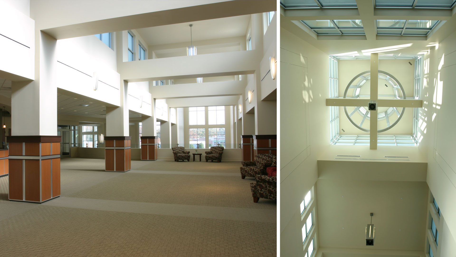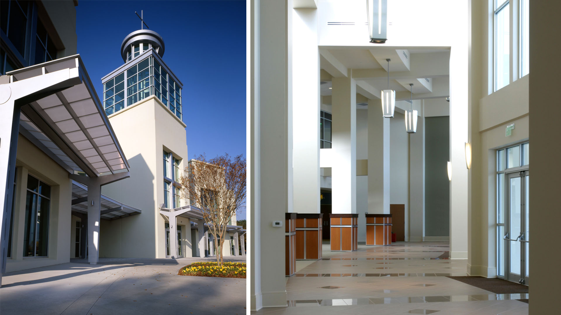 A new two-story entrance and lobby connecting the sanctuary to the new two-story Children’s Education wing provides the much-needed fellowship space. Two children’s theaters were designed to provide the youth with a superior worship experience. The large, flat floor theaters are sized for Awana circles. Youth begin and end in small group rooms, sized for specific age groups. The Adult Education Building also saw renovation to education spaces.