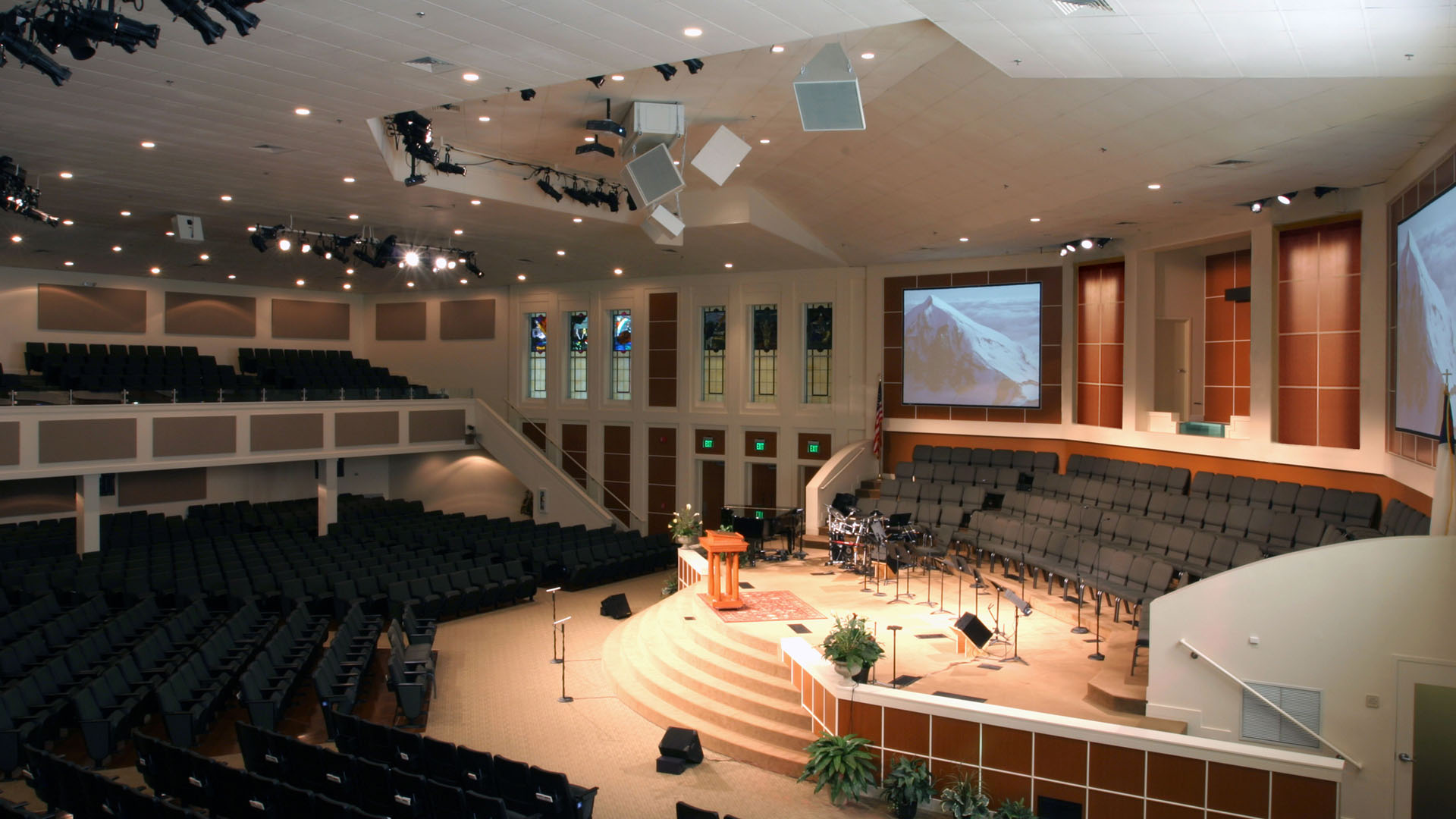Renovation of the existing sanctuary increased seating by 20%. The main pulpit presentation was re-envisioned with large integrated video projection screens that improved views for the entire congregation.