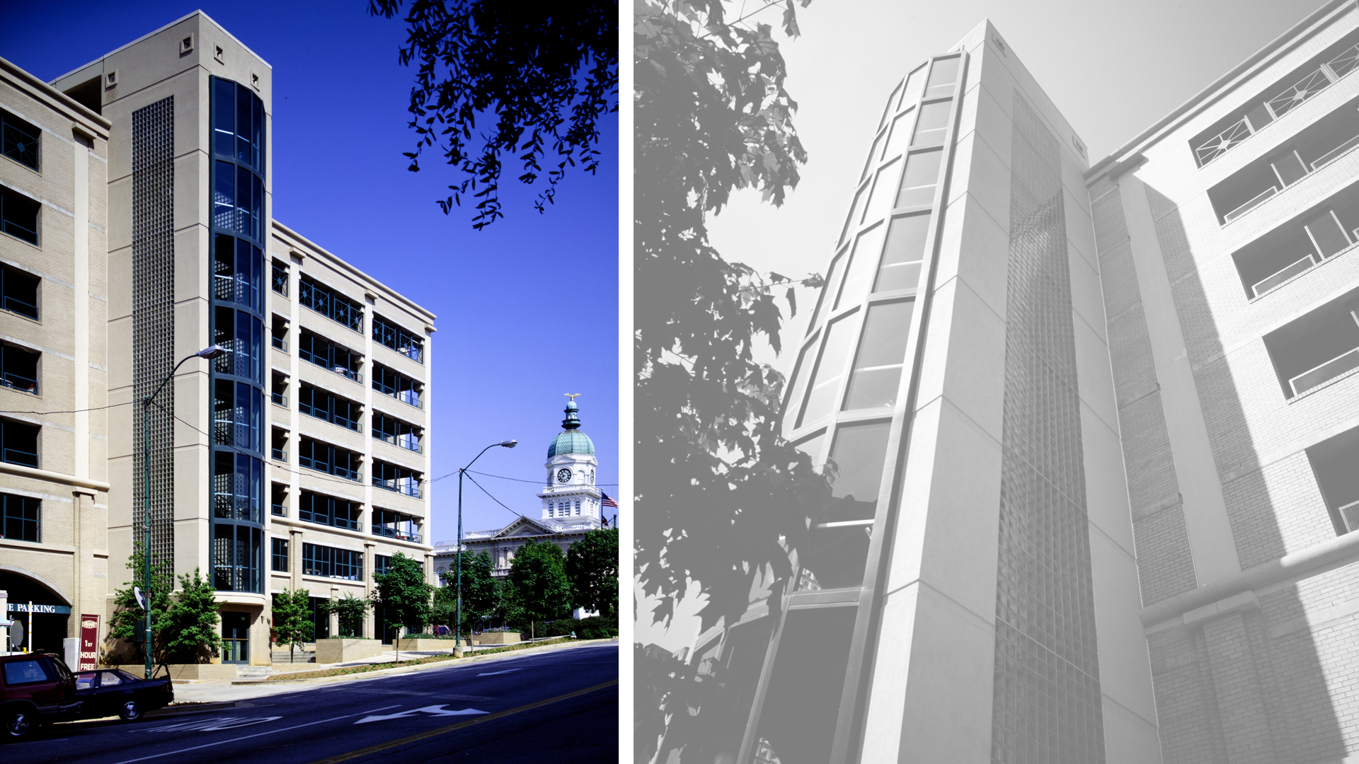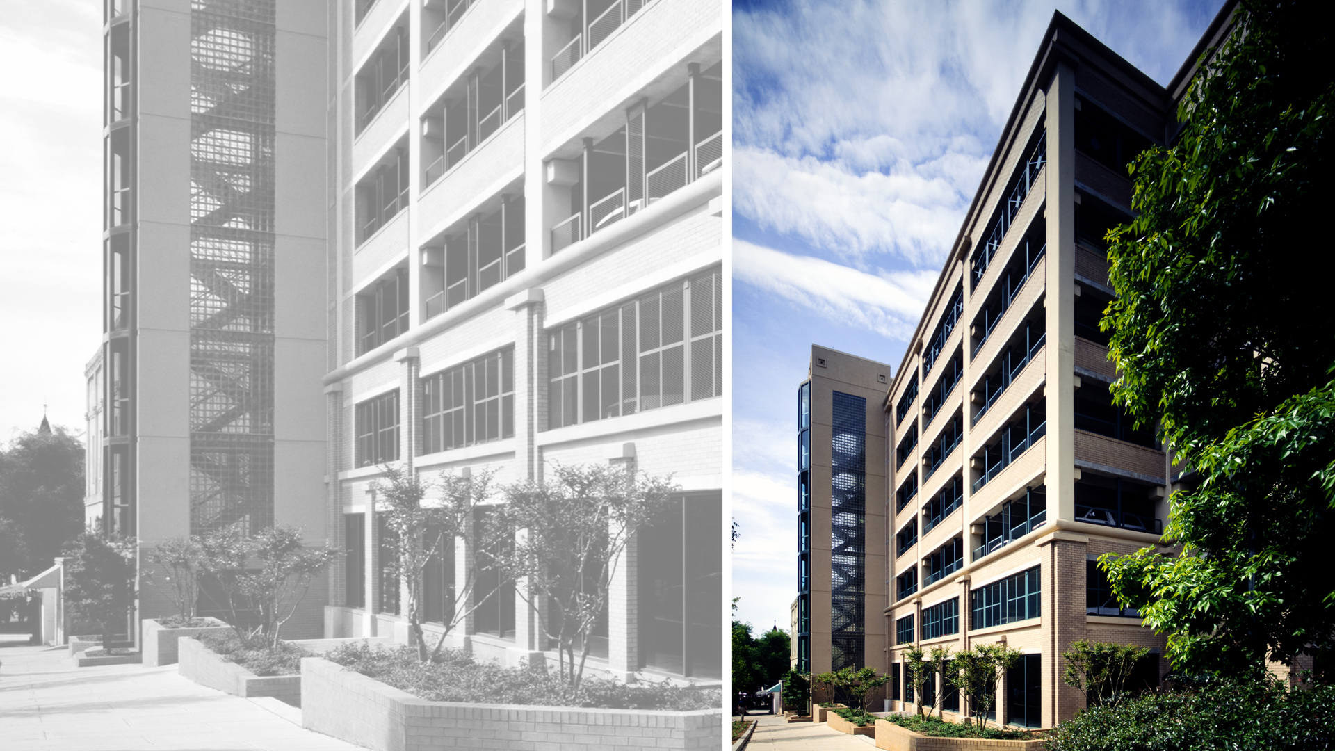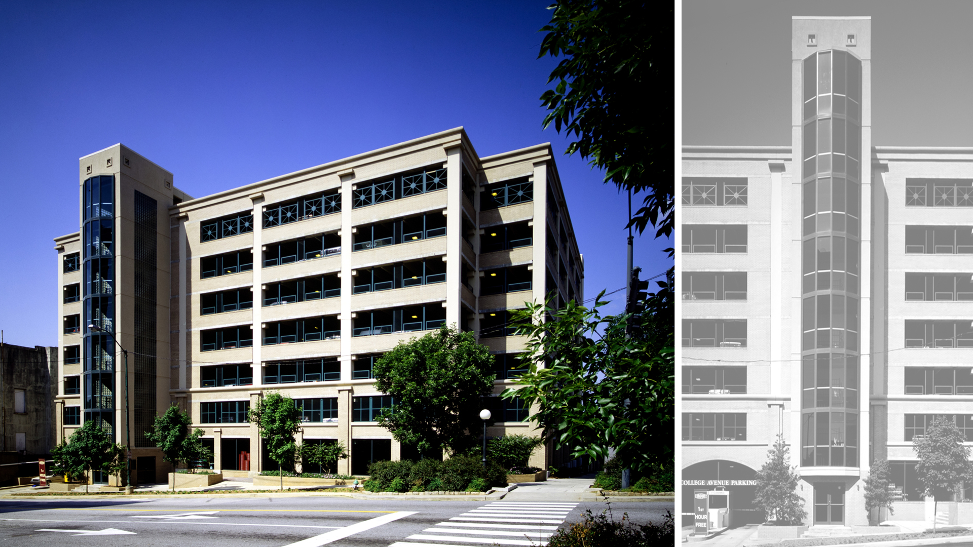 This compact, 8-level parking deck accommodates 345 cars. Designed for the historic district of downtown Athens, POH+W Architects chose proportions, window patterns, and materials like those of nearby buildings. The exterior consists of brick and precast concrete over a reinforced-concrete frame. The deck received a design award for Outstanding Achievement in design from the Georgia Chapter of the American Concrete Institute.