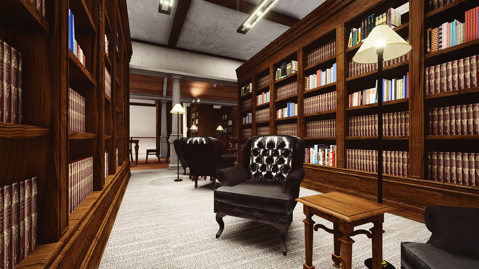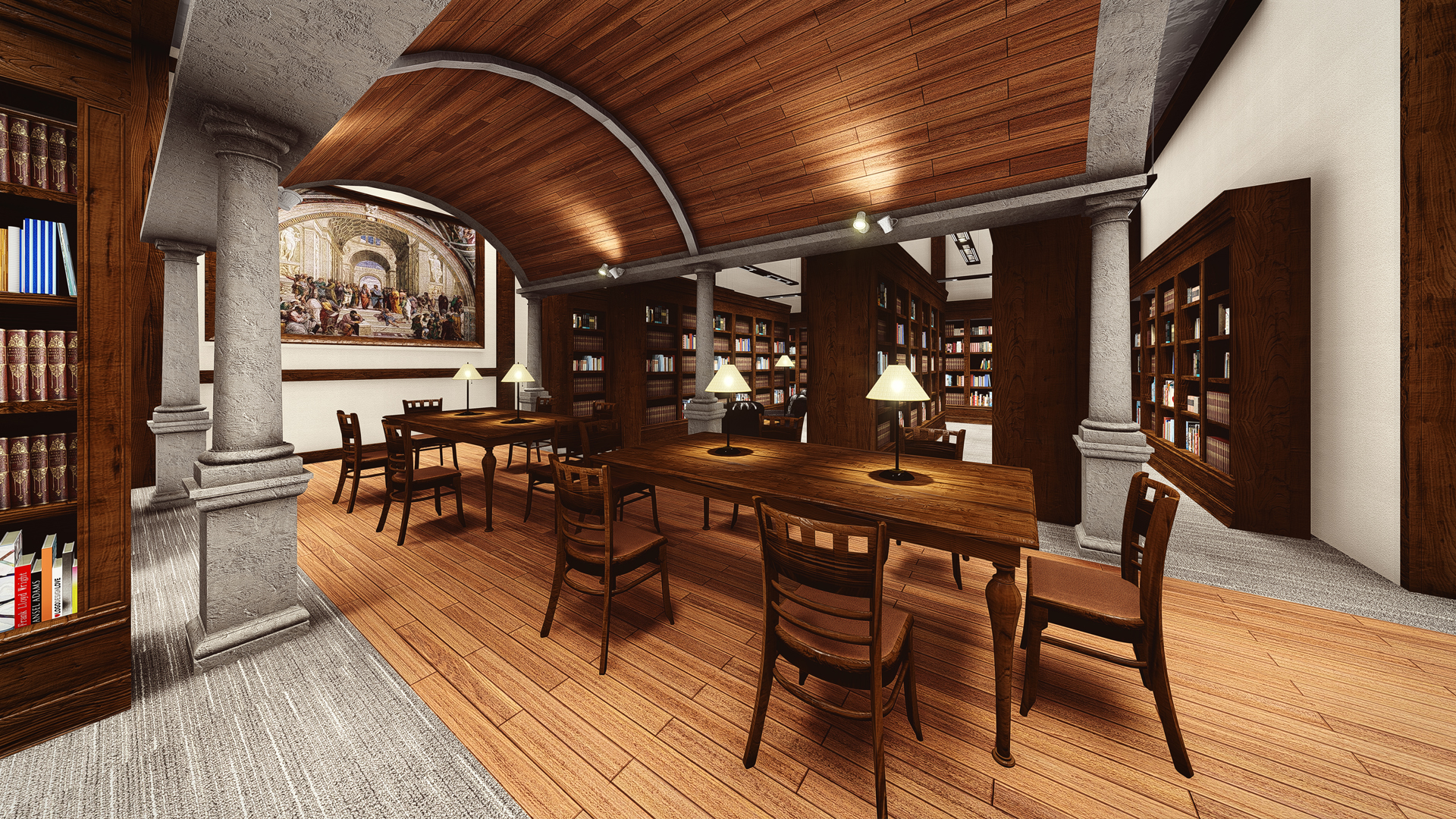 The library is publicly accessible and provides a variety of reading options including large tables and individual study carrels. The interior is designed as an elegant repository and uses materials complementary to the existing courthouse.