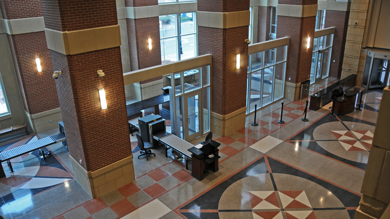 The Security Screening Lobby Entrance anchors the corner of the urban downtown setting. The main lobby is unexpectedly daylit with an enormous energy efficient skylight and large street level fenestration. Queuing and Screening equipment placement was studied to provide the optimal configuration. Historically patterned terrazzo floor and massive brick piers make for a memorable experience.