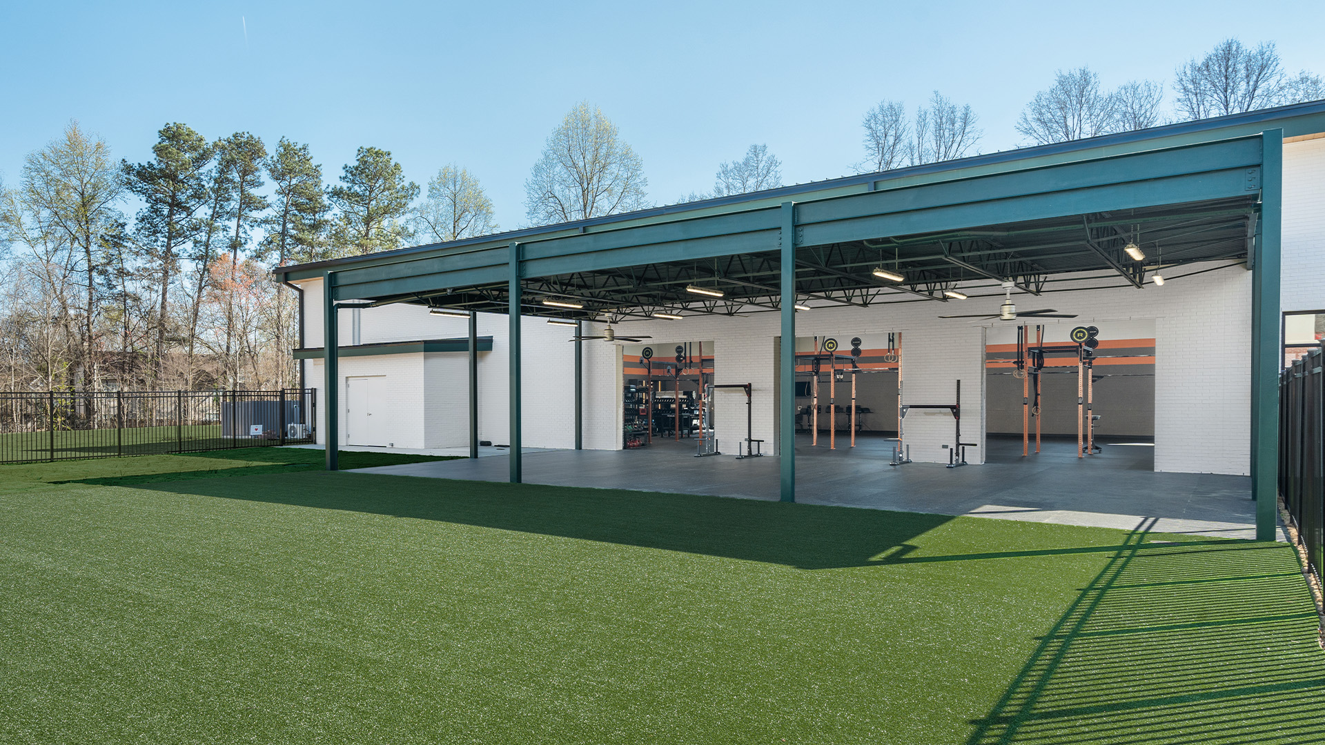 The exterior features a striking combination of two-story painted brick veneer, corrugated sheet metal accents, black-framed storefront windows, and a standing seam roof. An expansive outdoor training area enhances the facility’s versatility and connection to the surrounding environment.