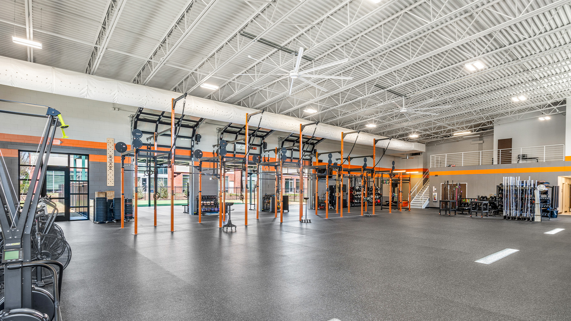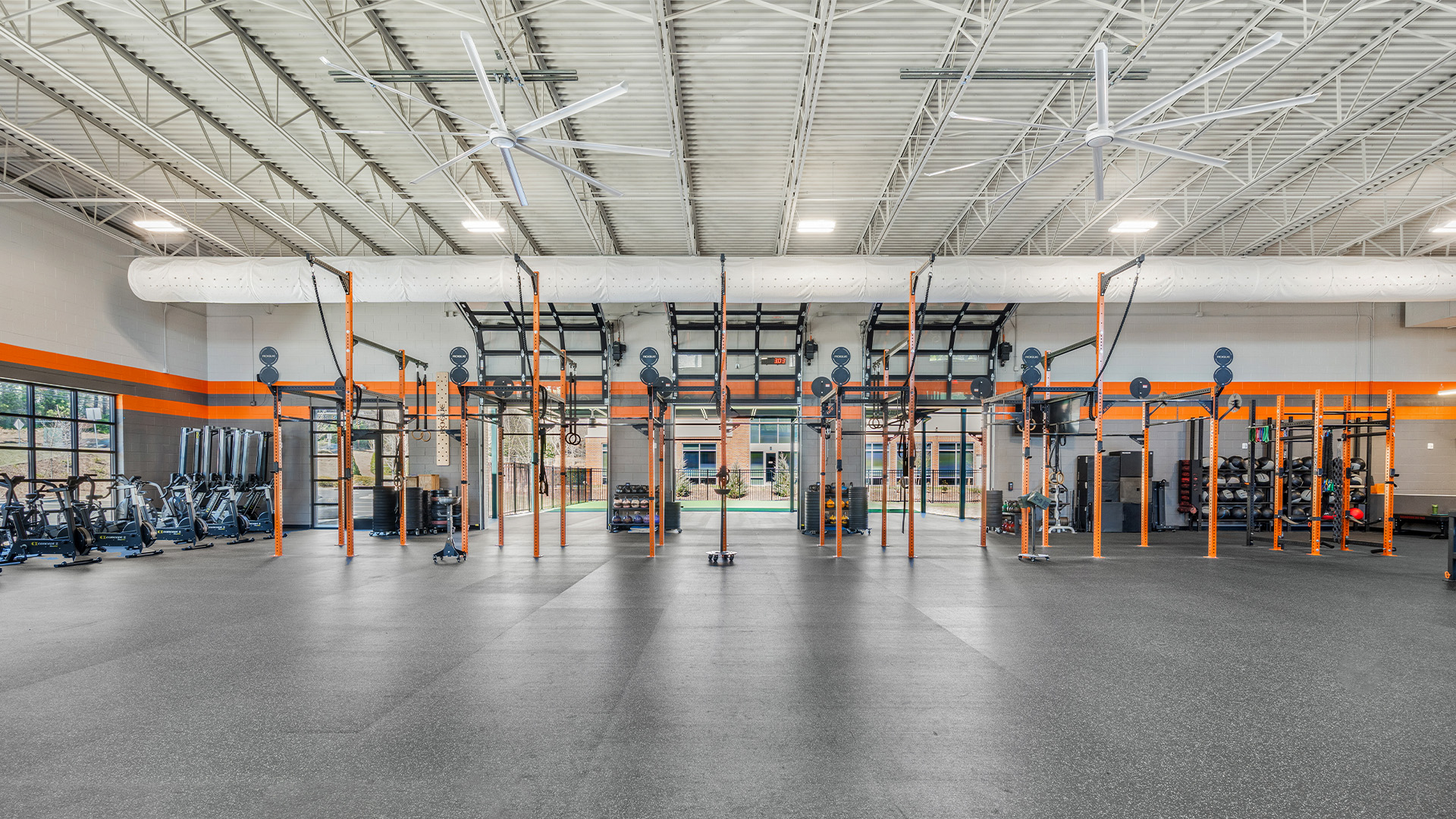 Inside, the space is outfitted with durable rubber flooring and anchored workout equipment on the main level. The second floor houses private offices and cardio equipment, including exercise bikes. Three large roll-up doors open the facility to the outdoors, blending interior and exterior spaces.