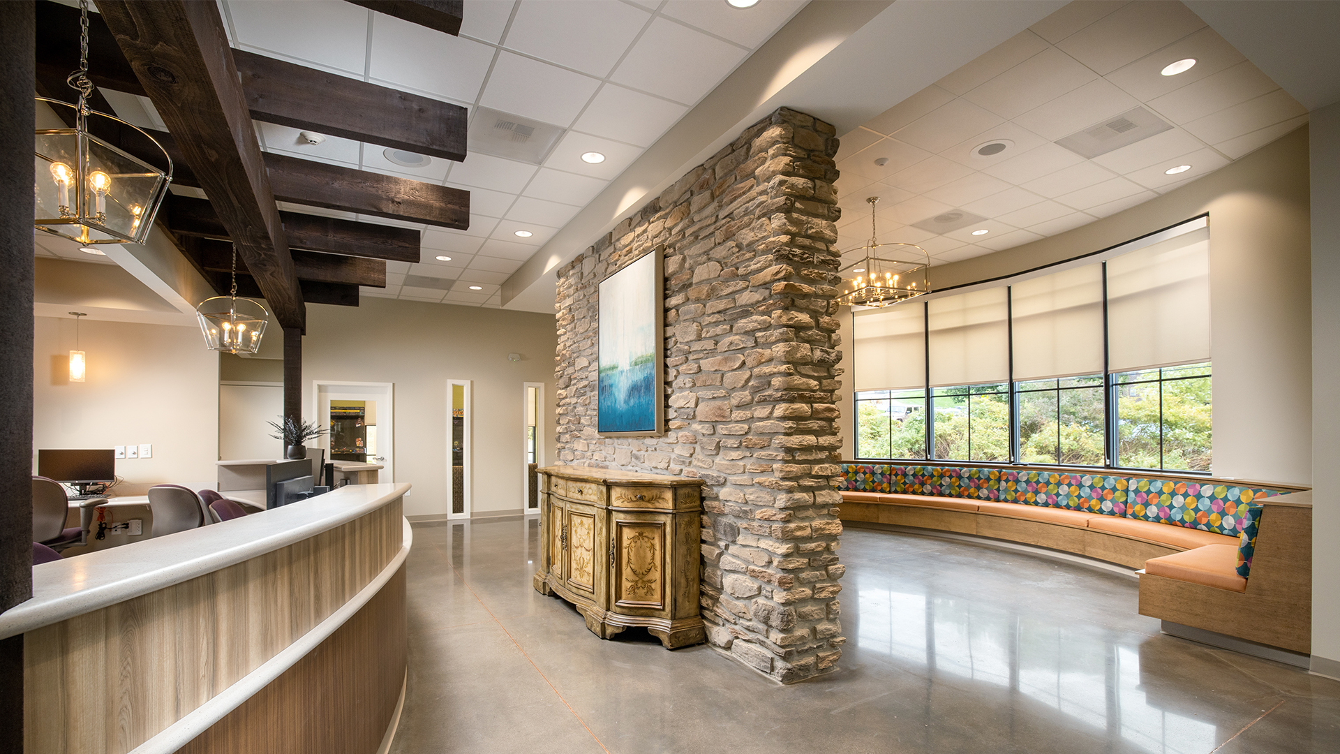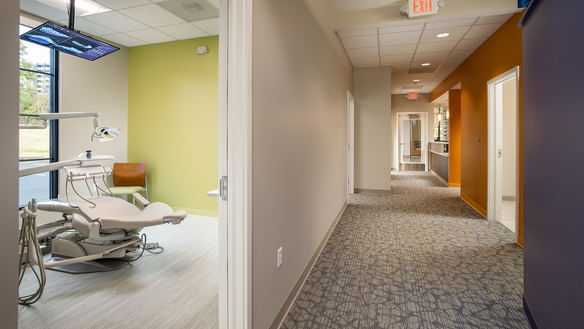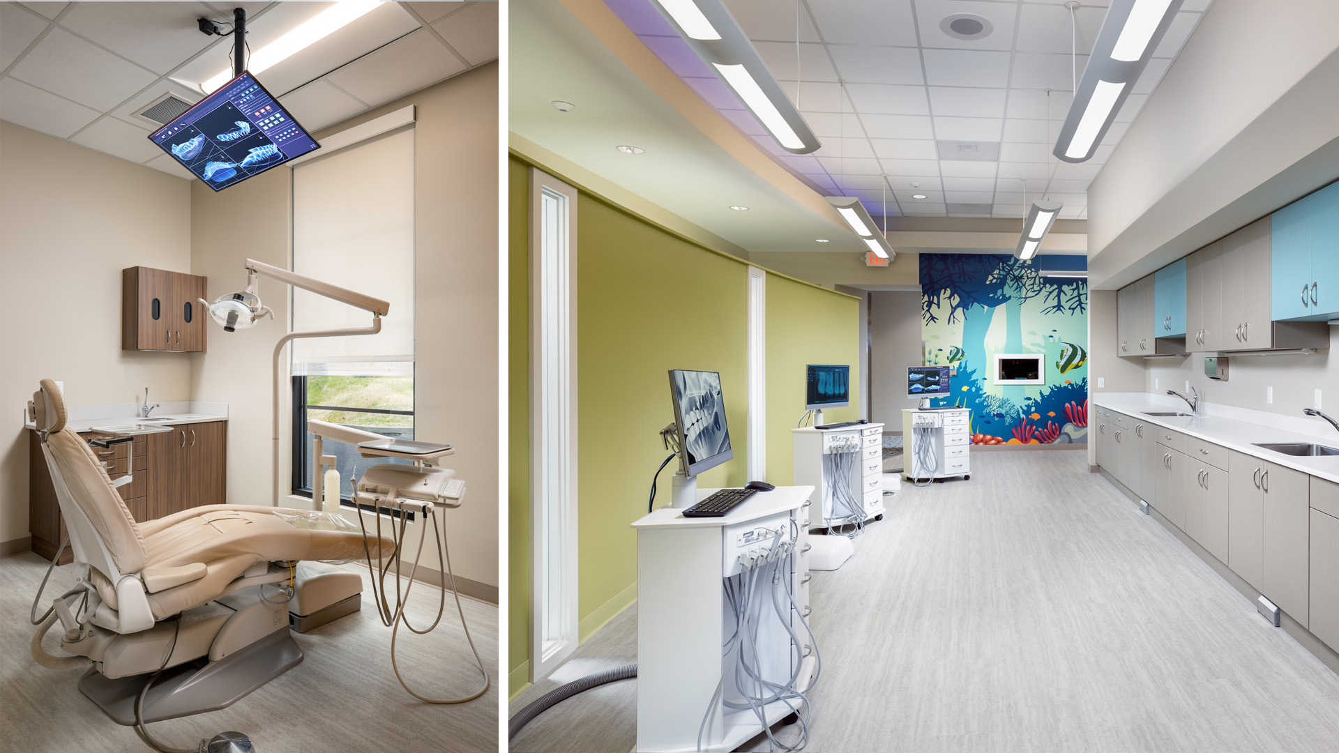 The office includes space for both the primary Dentistry practice as well as a partner Orthodontist practice and is centered around a large open exam room with private patient care rooms on either side. A large welcome space in the waiting area includes built-in seating and generous natural lighting, while a play space (with arcade games) is located just off the main waiting area where children can play while in sight of their parents.