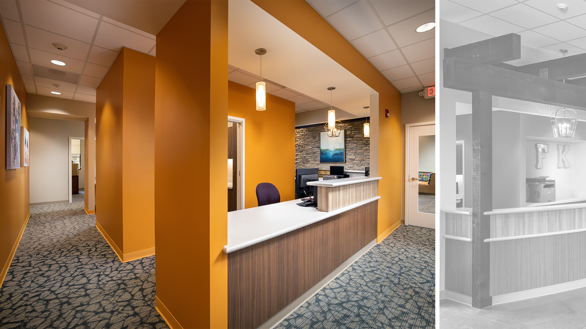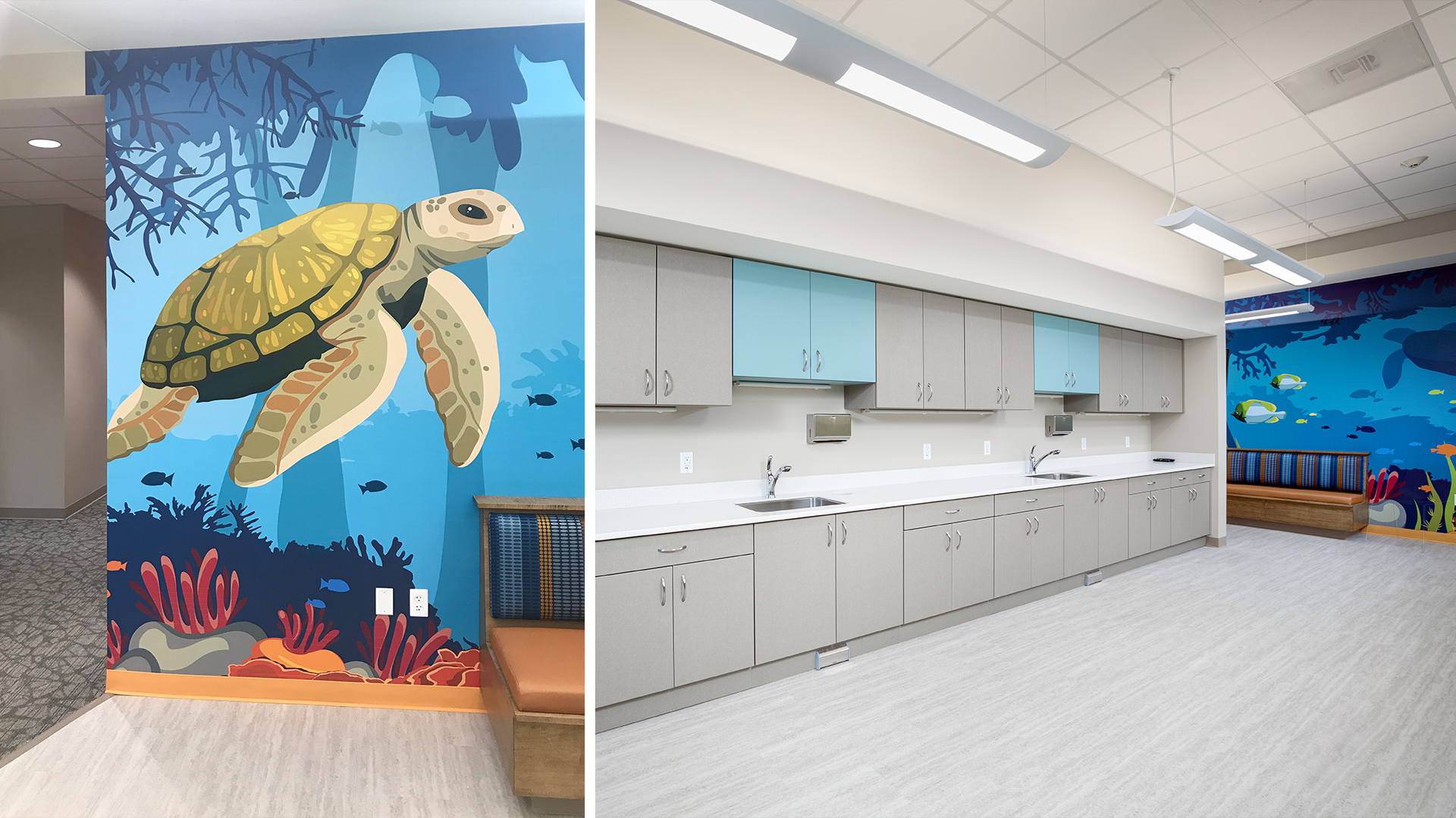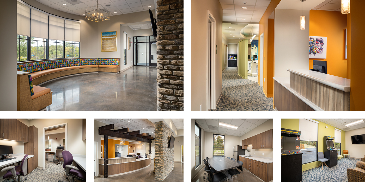 POH+W Architects designed the new Monroeville location for Dentistry for Kids. The new children’s dental office is designed around the concept of feeling at home and making young patients comfortable throughout their visit with the use of warm hues, creative artwork, and coordinating fabric tones.