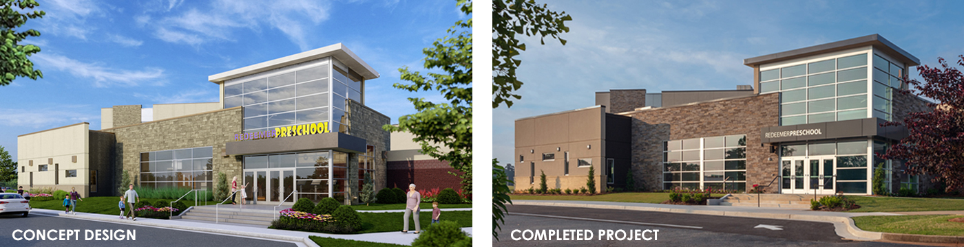 POH+W Architects designed the Redeemer Kids Preschool for the youngest children in the First Redeemer Church congregation. Worship for children has become an increasingly important aspect of religious communities as they strive to provide engaging family experiences. This addition will allow parents to attend worship while their kids actively participate in meaningful activities.