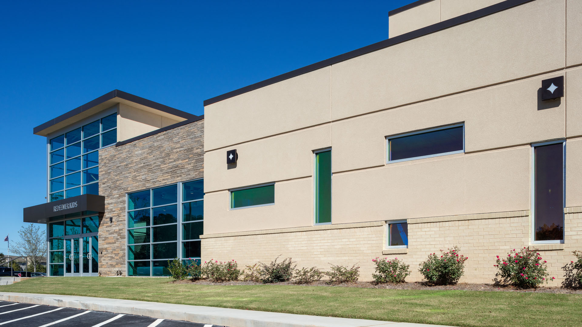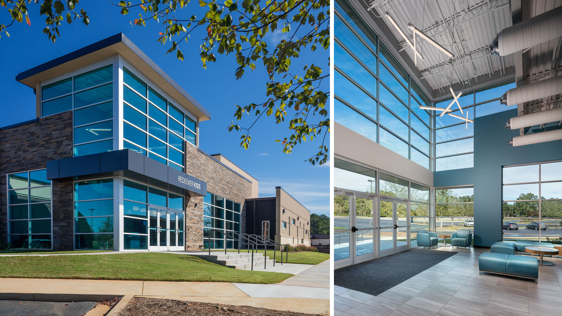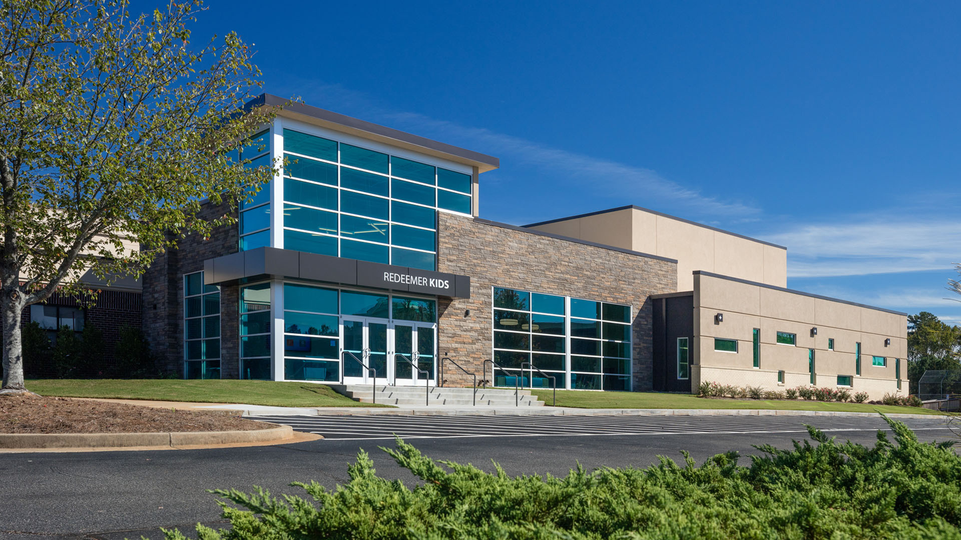 A successful children’s worship experience is a central priority for the pastor and church leadership at First Redeemer Church in Cumming Georgia. While the Children’s program consists of several components, the space for the worship experience, the focal nurturing foundation, needed improvement. Before the addition, the kids traveled outside the building, to cramped portable modules for a great worship presentation housed in less than ideal space. The existing children’s wing also lacked adequate space for the critical child check-in/out process, frustrating for parents. As the congregation continues to grow, classroom space for different age groups was also needed.