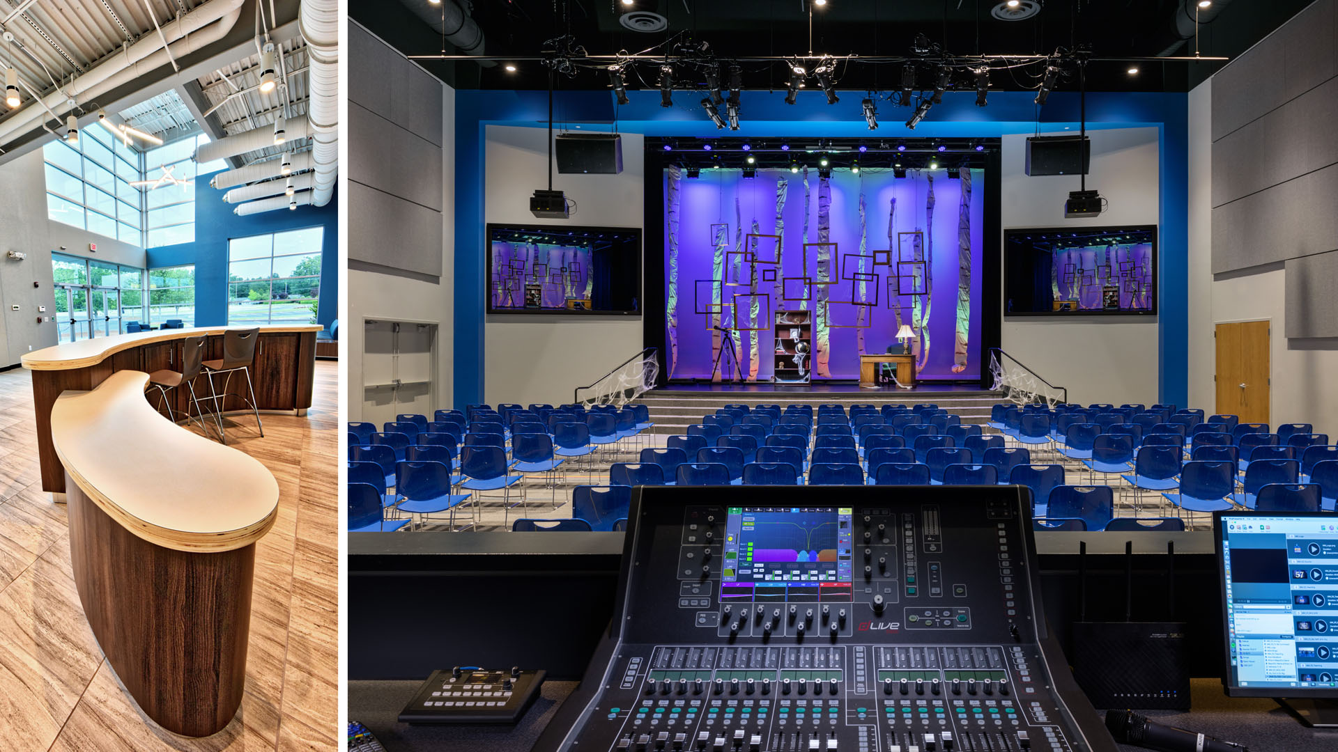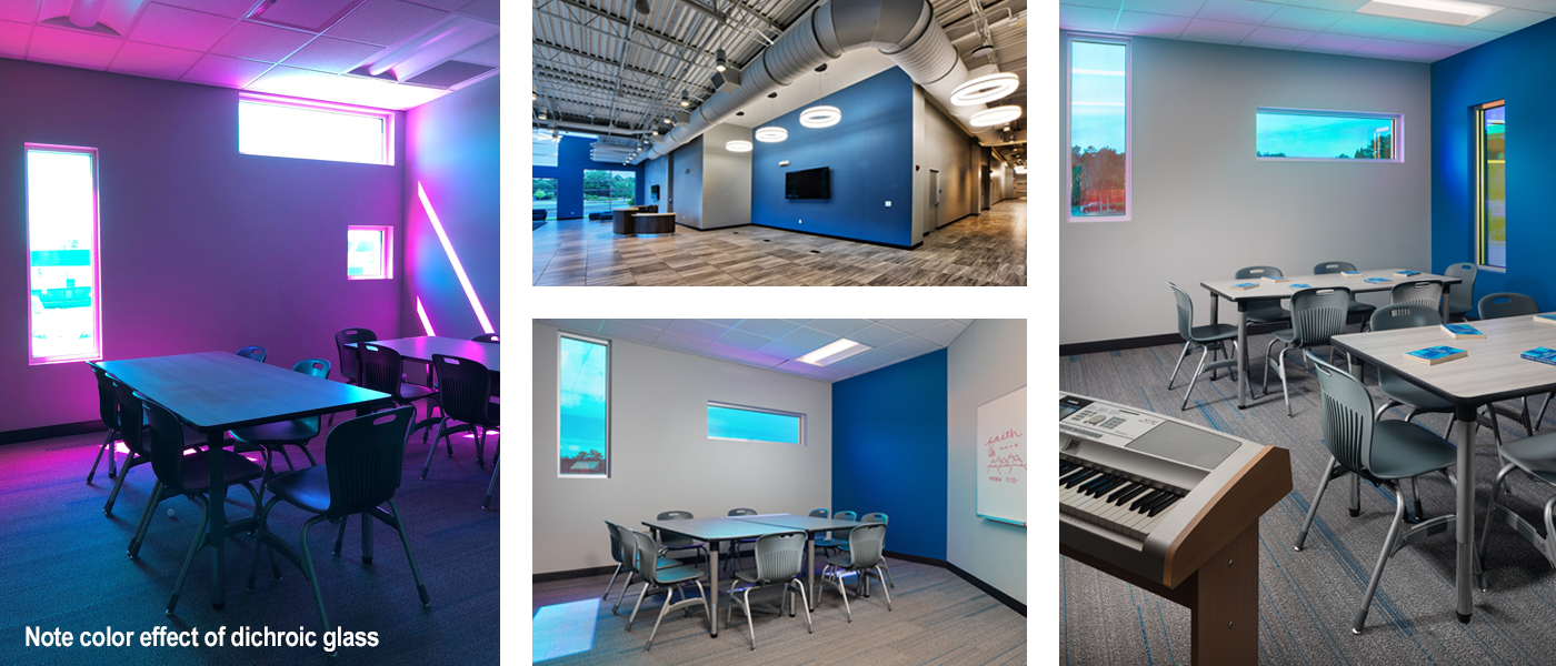 The focus of the addition is the Children’s worship space. With a raised stage in a flexible theatrical environment, the space is designed to provide the best worship experience. This flexible space also features a flat floor and high ceiling so the space can be scheduled and utilized for other church events and activities. In addition, a separate large multipurpose space provides for a variety of activities. These large multi-purpose areas provide the dedicated worship space and flexibility that is so important to the church.