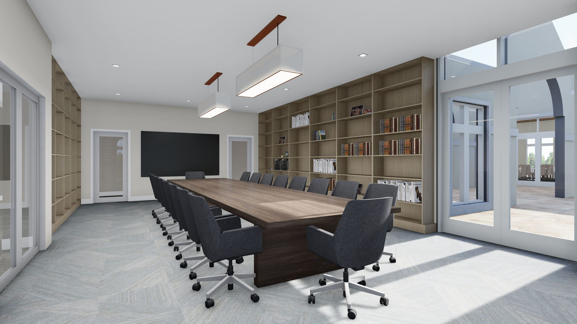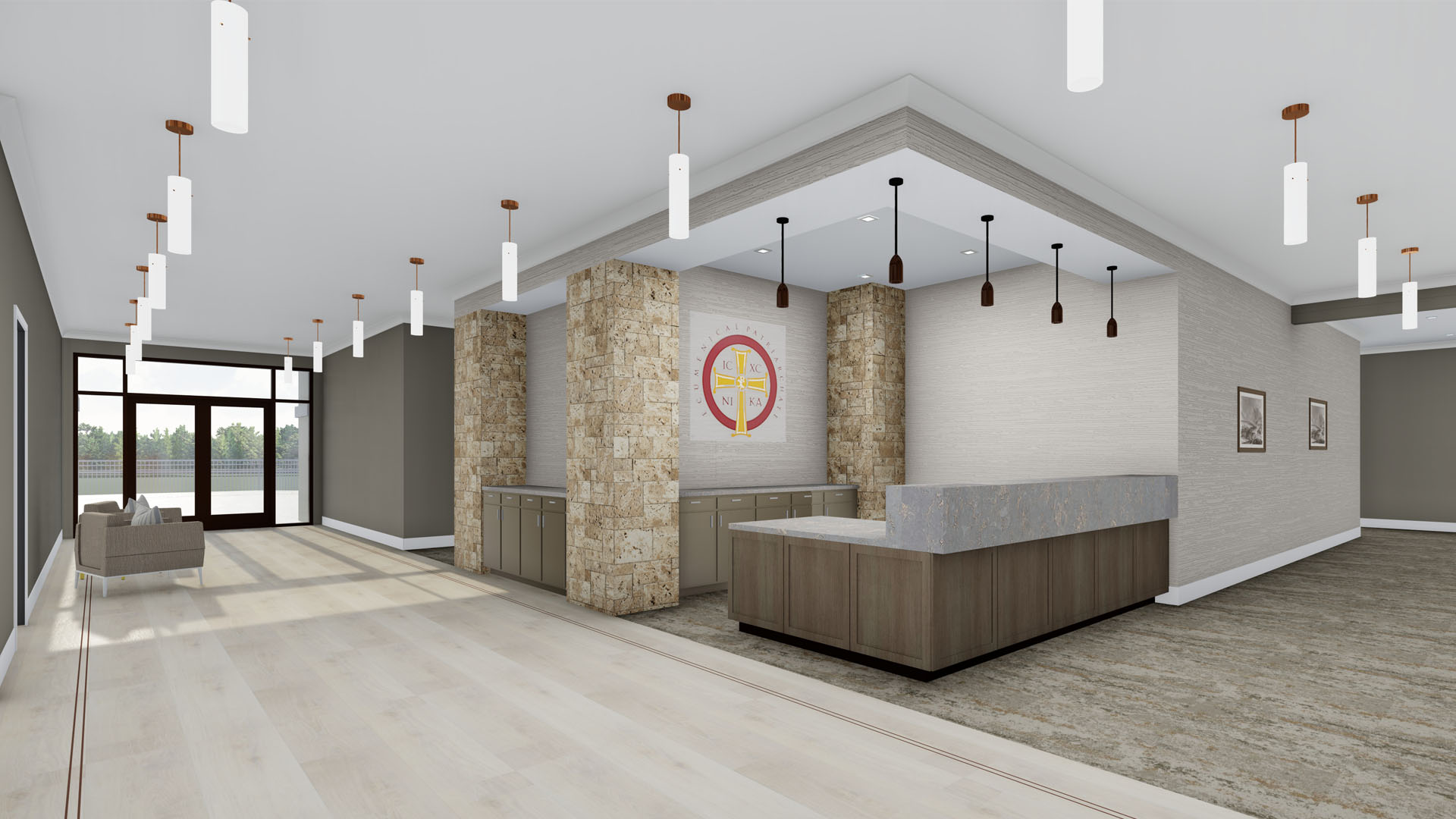 POH+W Architects’ design for the Greek Orthodox Metropolis Center and Residence supports a variety of abilities. The 11,000-SF, two-story center includes a chapel, sanctuary, main hall with full catering service facilities, a library, main offices for the Metropolitan, Chancellor, Philoptochos, and Deacon, while also featuring a flexible office and meeting space. Both the outdoor gathering terrace and the residence will enjoy uninterrupted wooded views. A continuous canopy and path anchor the two-story residence to the primary facility.