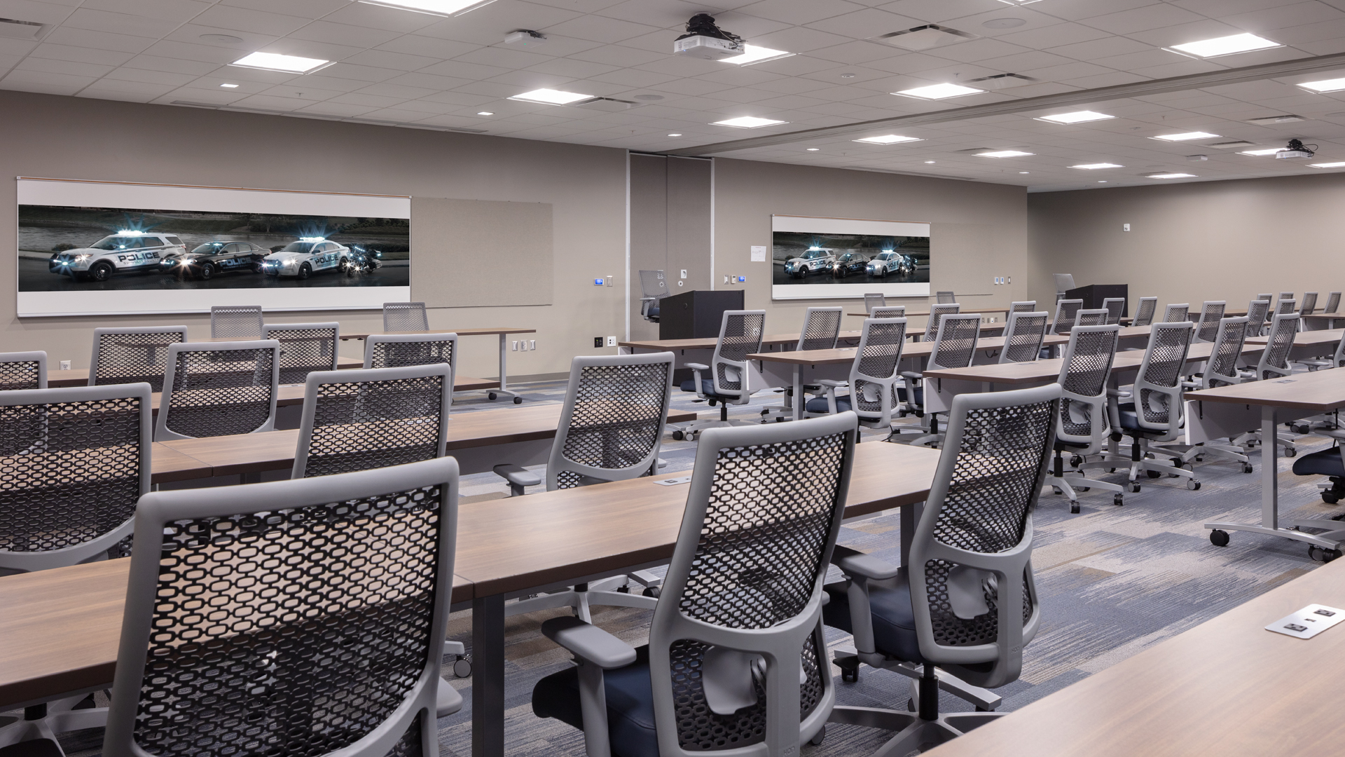The new exterior entry offers the opportunity to operate the new expansion independently of the existing facility. This was planned to take full advantage of the new multi-purpose venue. The multi-purpose space offers flexibility with several reconfigurable options. From hosting ceremonial events for 350 participants to a variety of tactical training exercises. Retractable bleachers can serve an additional 100 spectators during larger assembly events. The expansion also accommodates flexible large and tiered classrooms, faculty offices and workstations, a large breakroom with seating for over 60 people and extensive locker rooms with showers.