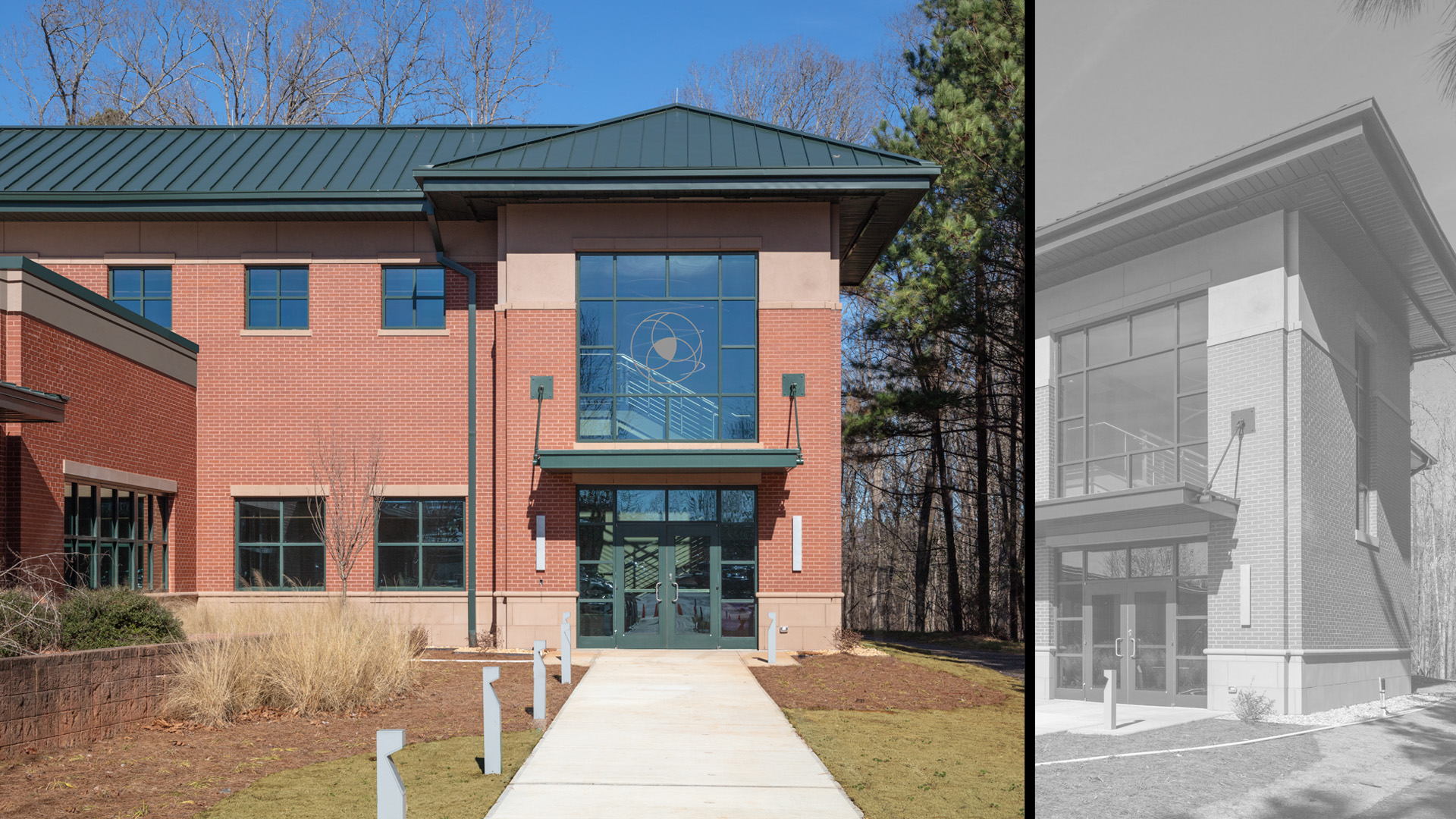 POH+W Architects design for the building expansion solved the challenge of a thoughtful connection to the existing facility without disrupting the extensive sloping metal roof with large soffits. The new building addition design cleverly connects under the existing soffit. This design approach avoided a potentially costly re-roofing repair situation on the existing facility.