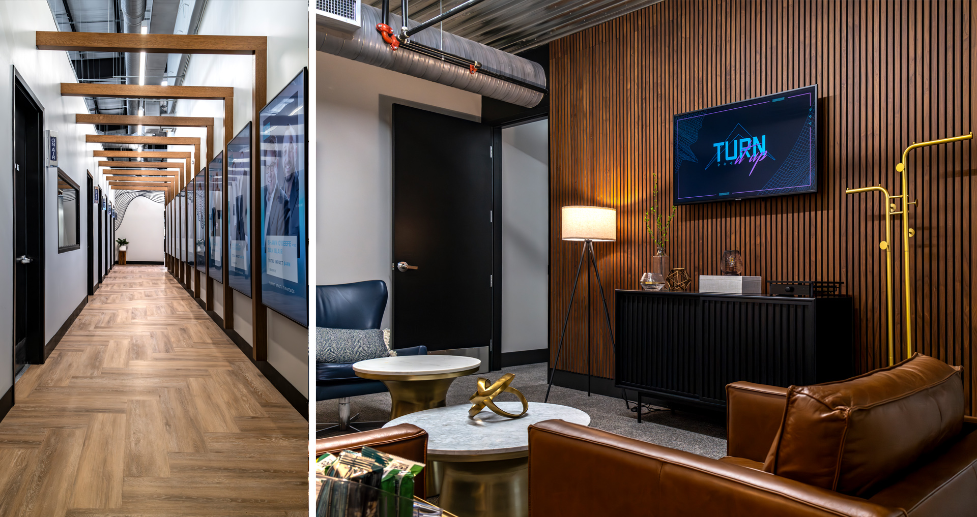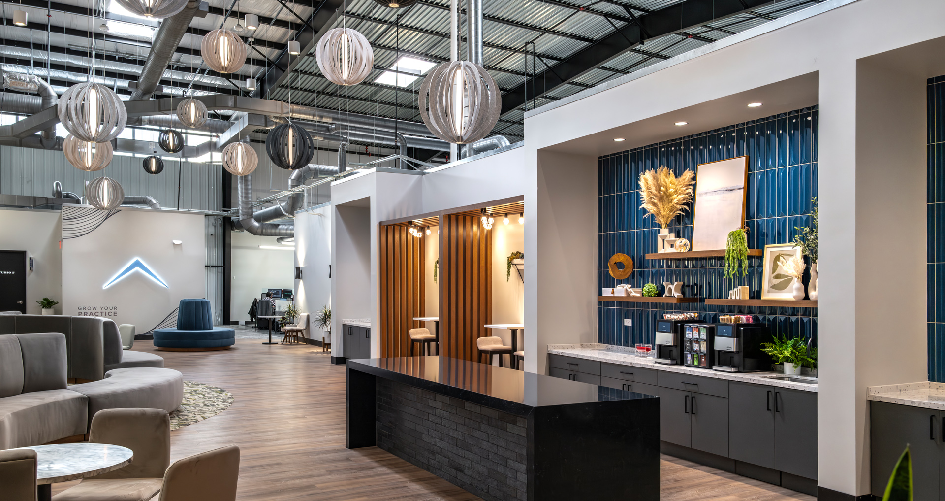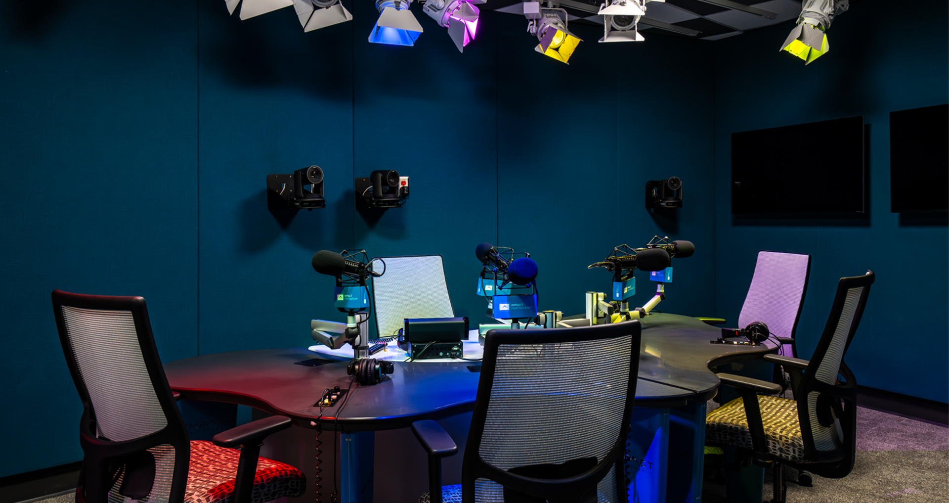 POH+W Architects designed new TV, Radio, Podcast studios and associated control rooms within an existing office and warehouse space for Impact Partnership. A structural grid was designed to accommodate specialty studio lighting. The hospitality/visitor area includes decorative lighting, natural lighting, wood accents with café tables, soft seating, break, and island areas along with upgraded finishes to create comfortable gathering areas for training and events.