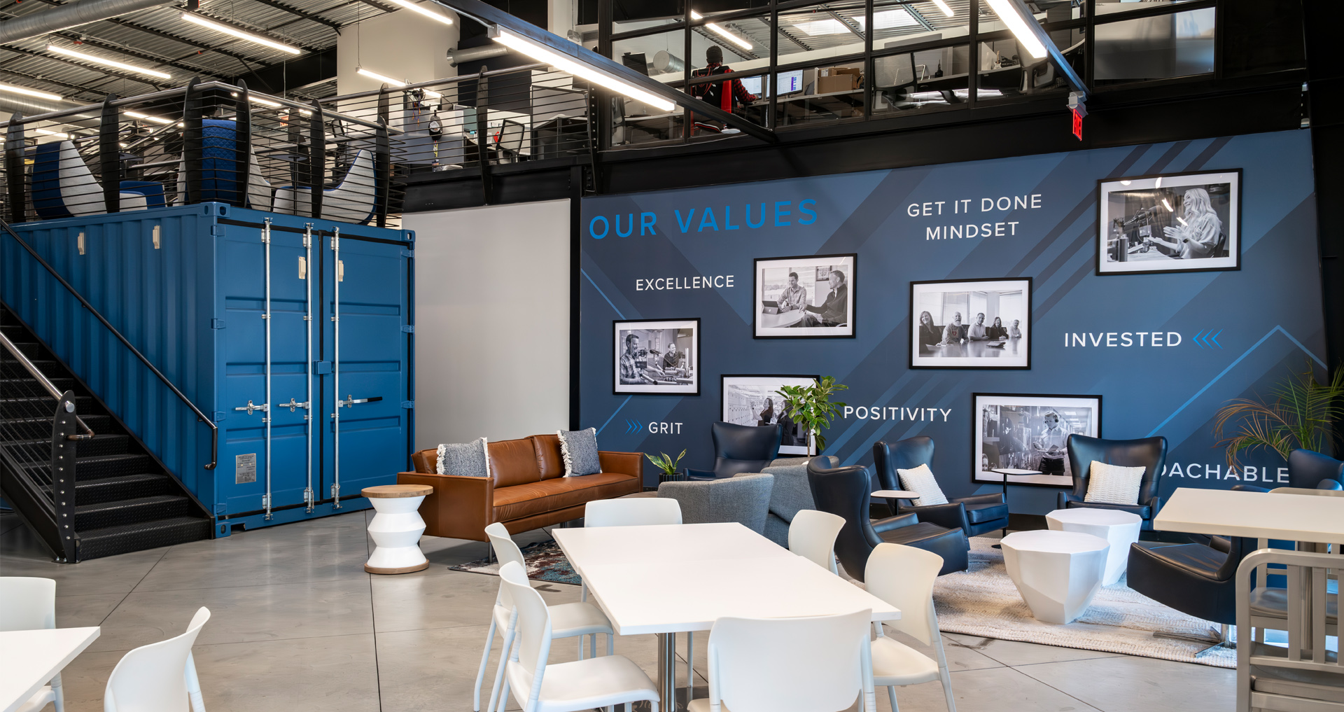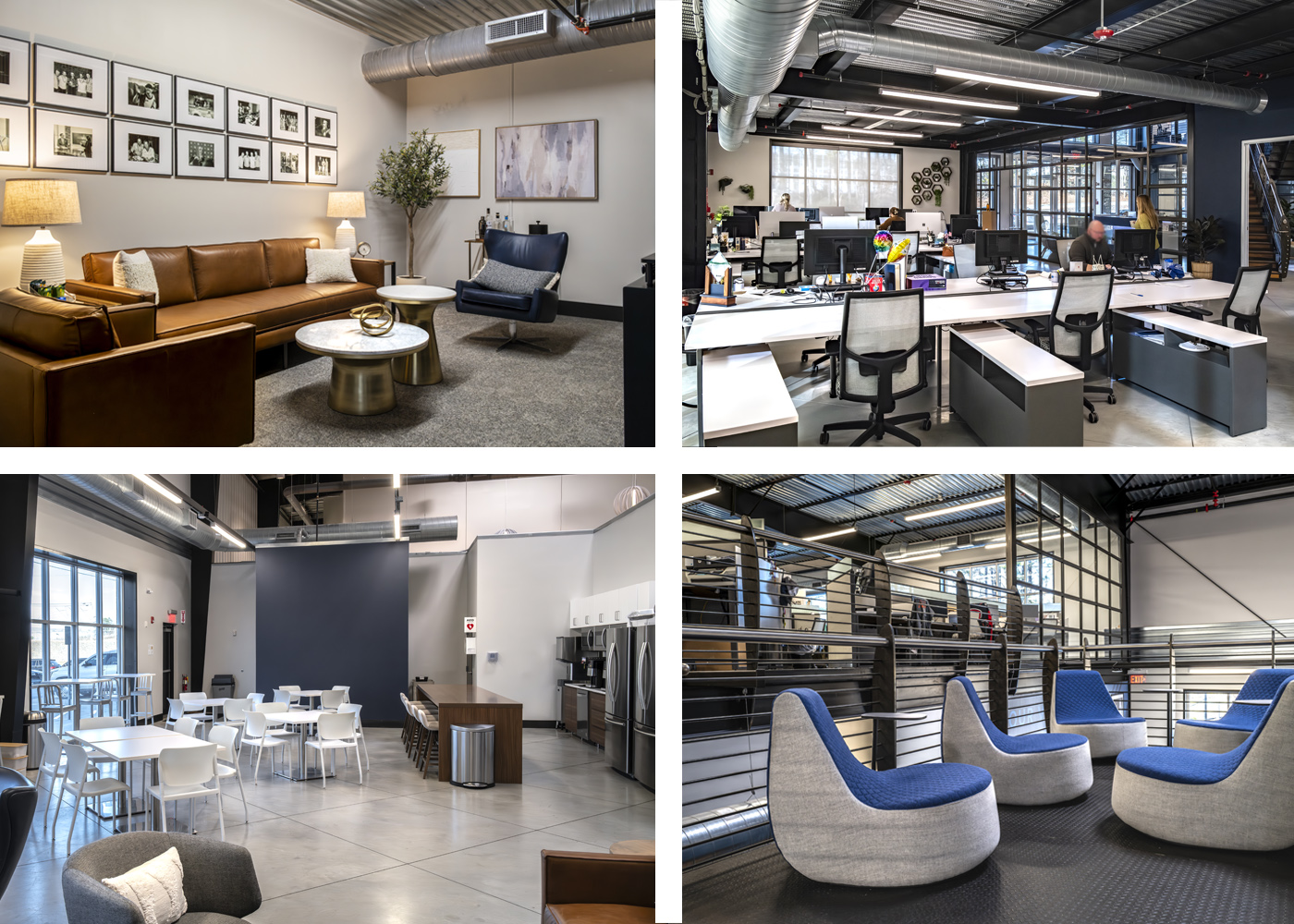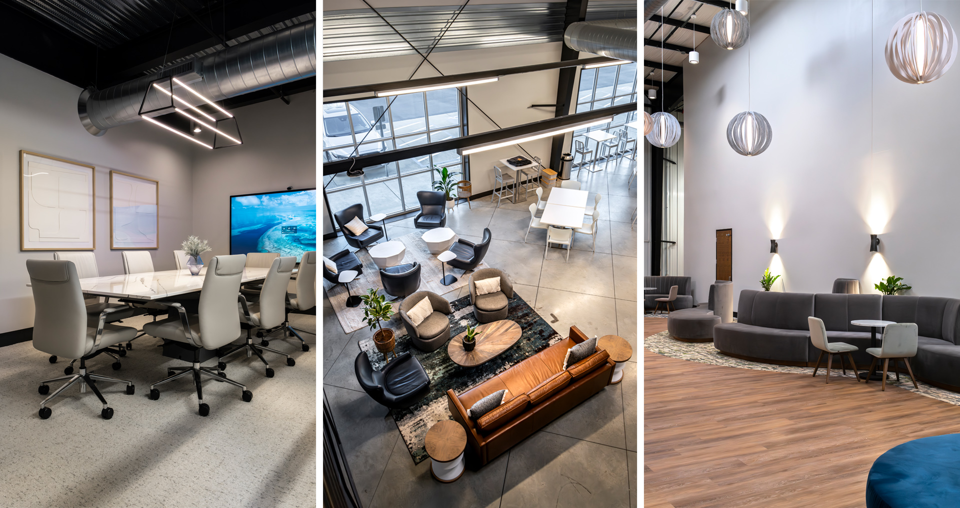 POH+W Architects designed new TV, Radio, Podcast studios and associated control rooms within an existing office and warehouse space for Impact Partnership. A structural grid was designed to accommodate specialty studio lighting. The hospitality/visitor area includes decorative lighting, natural lighting, wood accents with café tables, soft seating, break, and island areas along with upgraded finishes to create comfortable gathering areas for training and events.