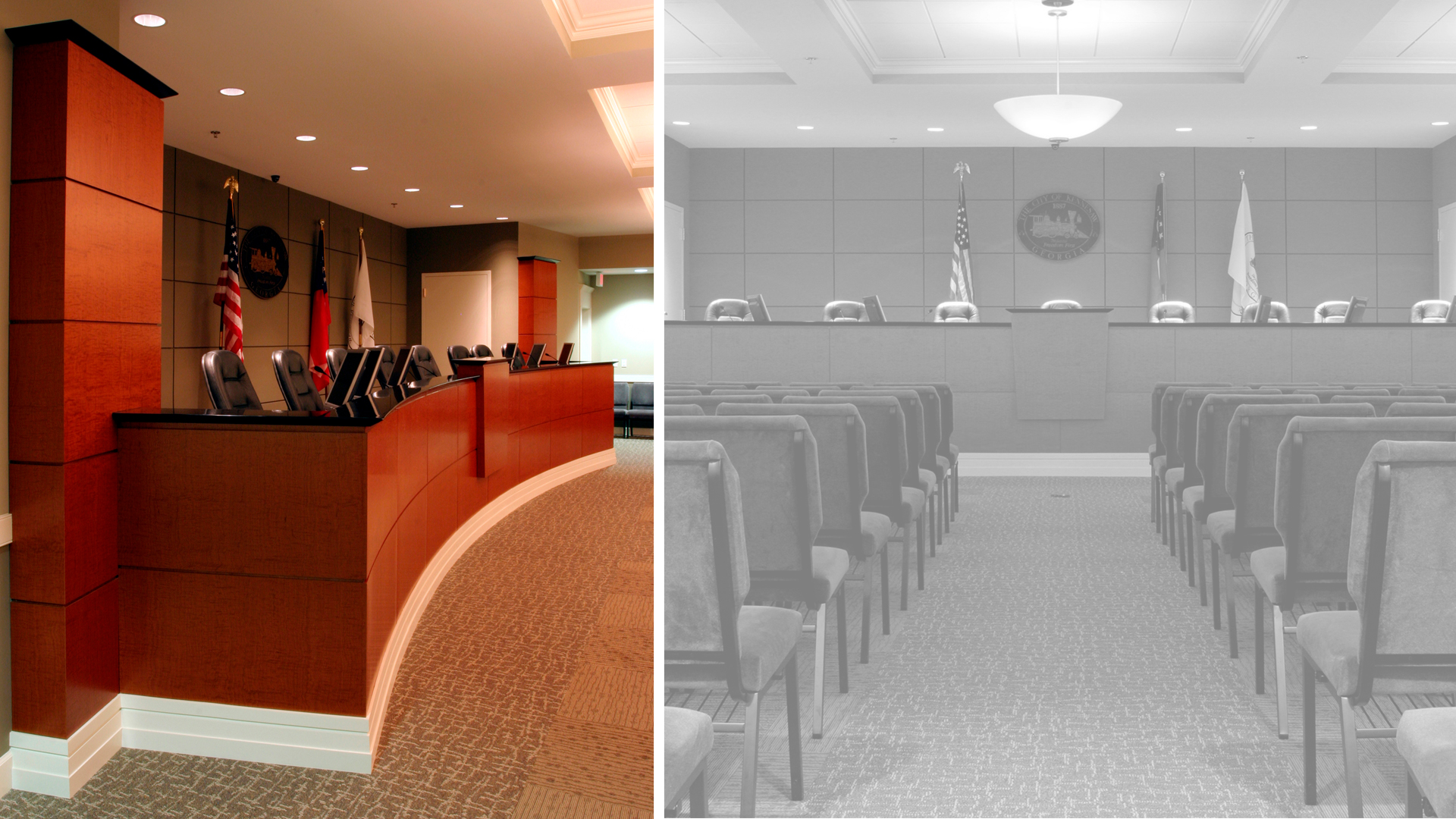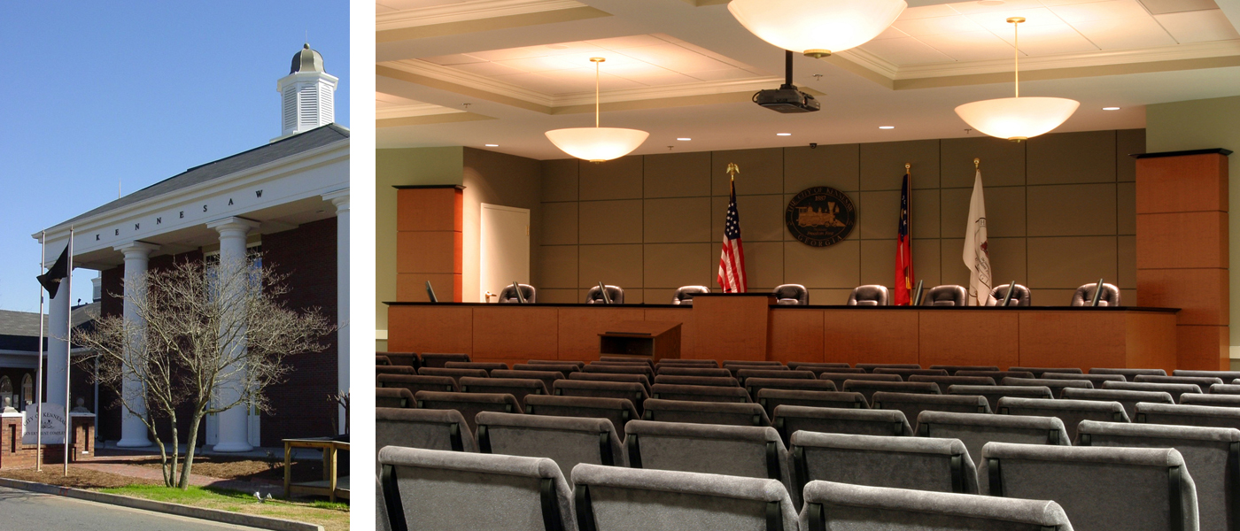 Located in the historical district of Kennesaw, the addition needed to have a character appropriate to its function and respect the architecture of the existing building. While the existing facility is mostly based on an Early Classical Revival architectural style it also has elements from Neoclassical, Greek revival, and Italianate. The POH+W Architects design used traditional elements to complement the architecture established on the original City Hall. The function of the Courthouse certainly lends itself to a traditional, established composition that emphasizes the permanence of the justice system and the importance of the city council chamber. While the Municipal Court and city council will share the courtroom, the renovation also allows for a new main entry to the City Hall complex administrative offices.