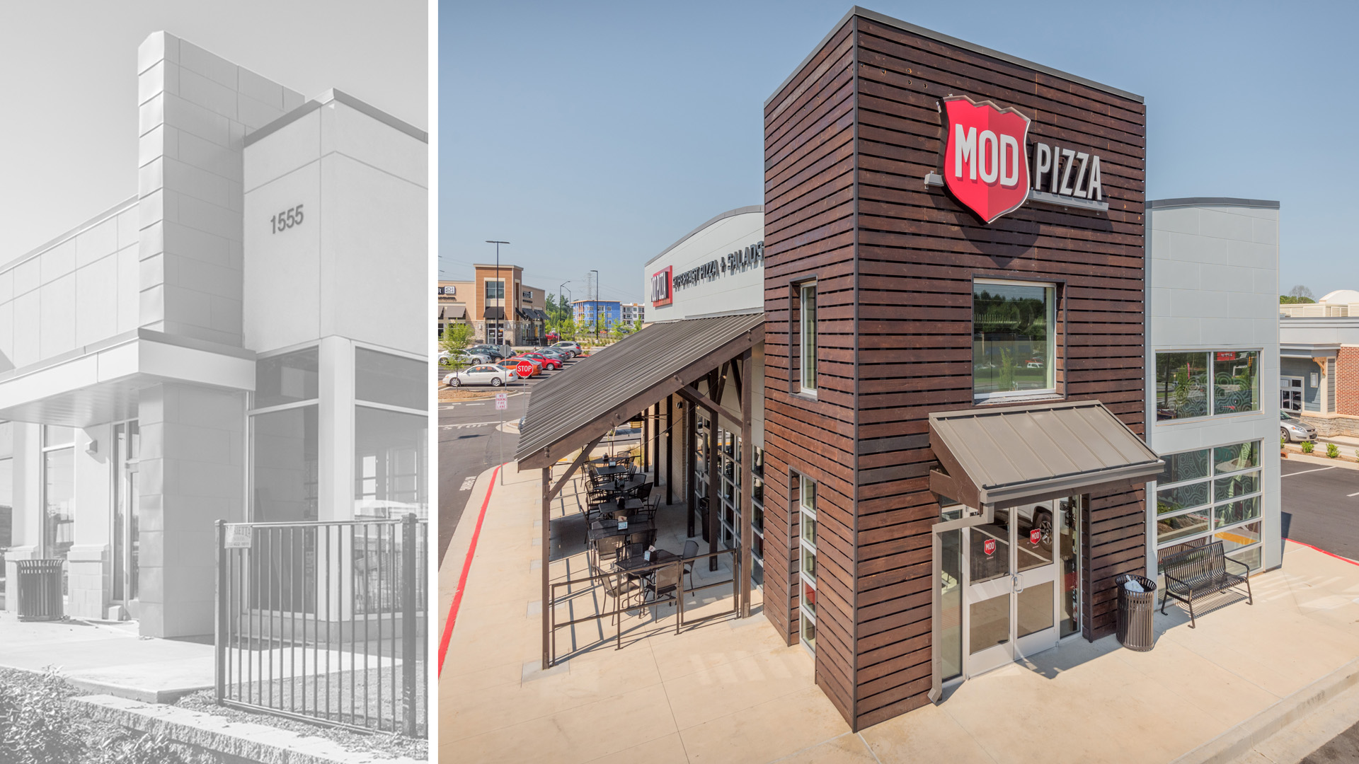Built on the site of a former rock quarry, the granite once procured from this area and the wooden scaffolding used in the extraction process heavily influenced POH+W Architects’ design for this local retail center.