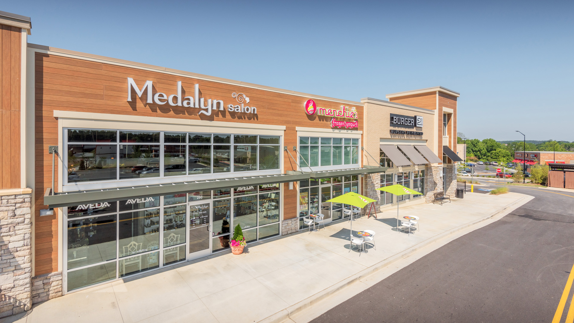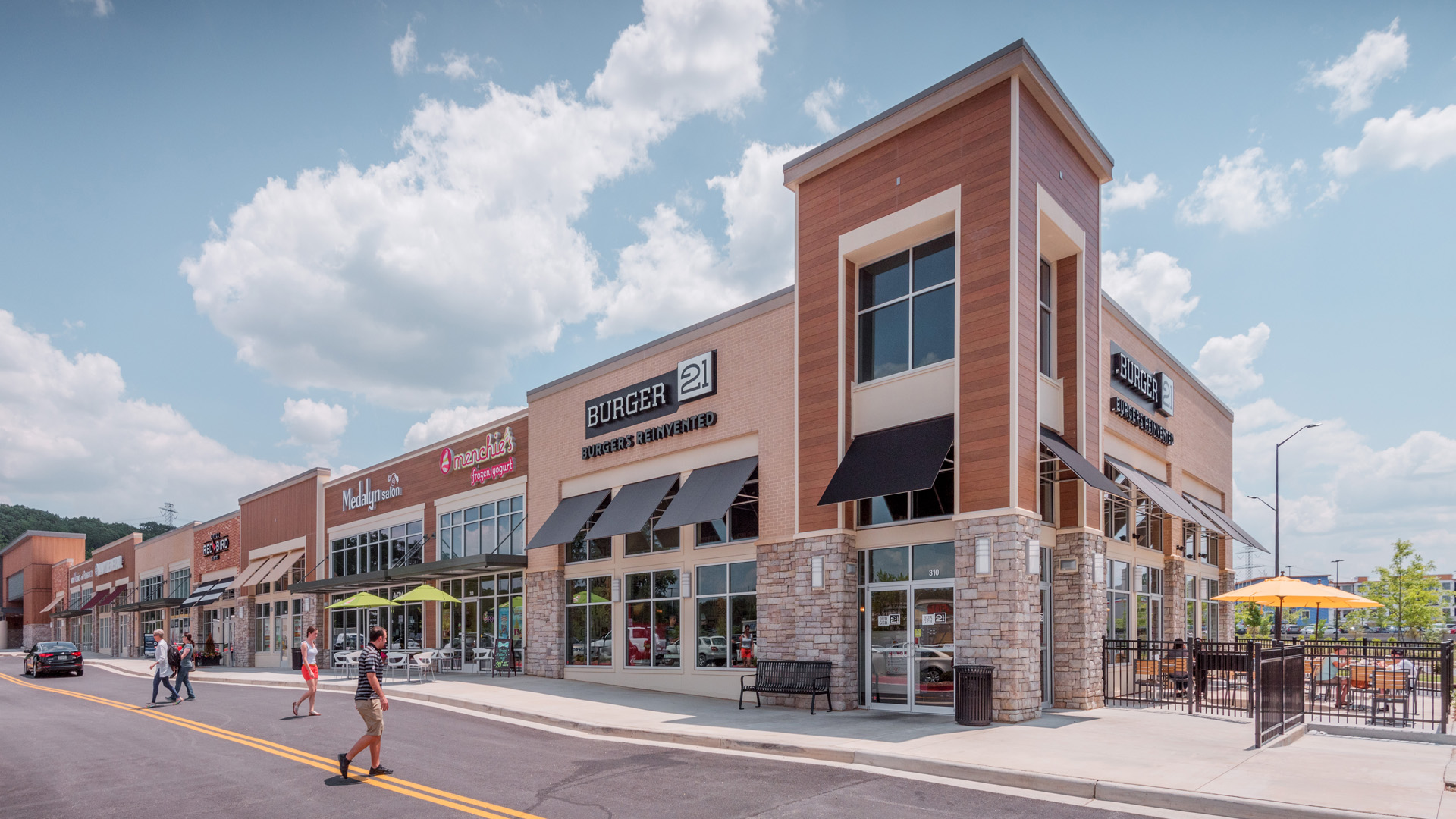 Stone pilasters and accents paired with rich wood siding are the only clues to this site’s former life. A variety of windows, awnings, canopies and brick vary the streetscape.