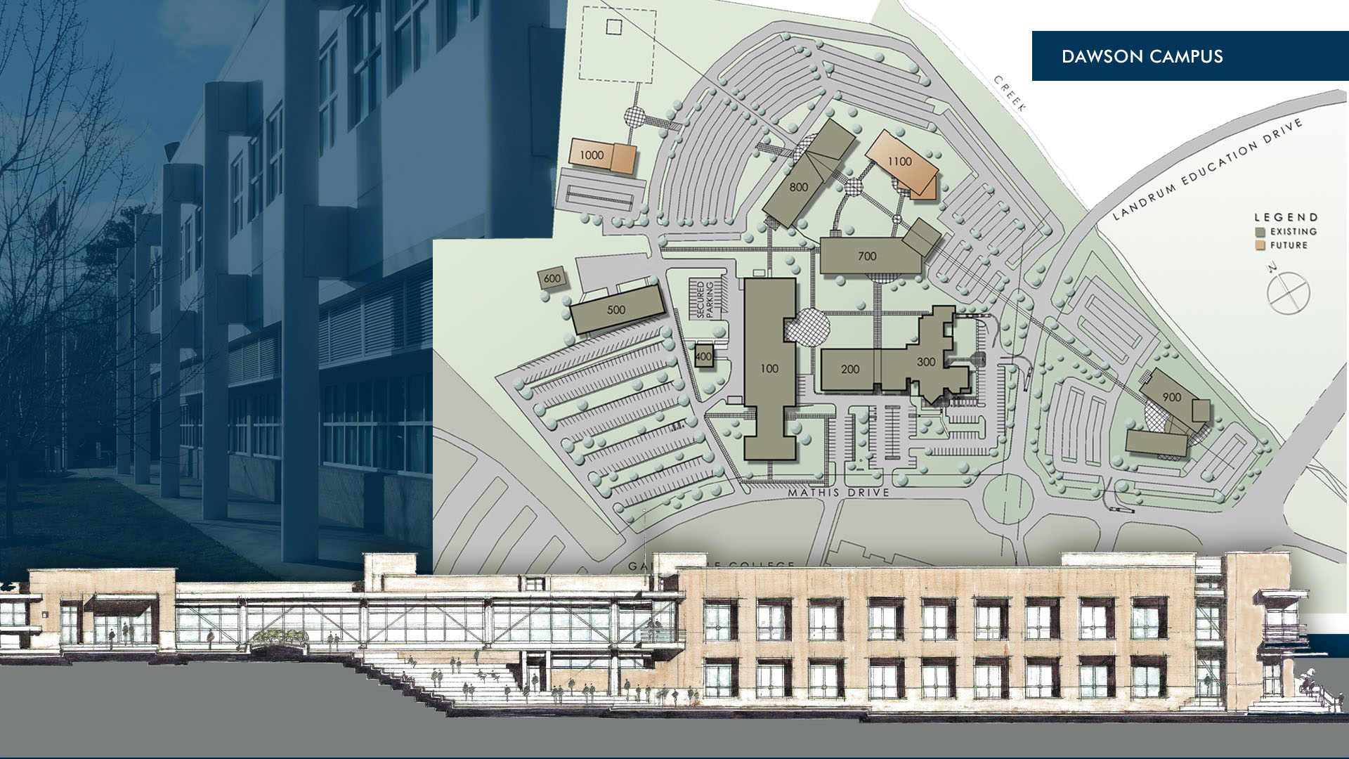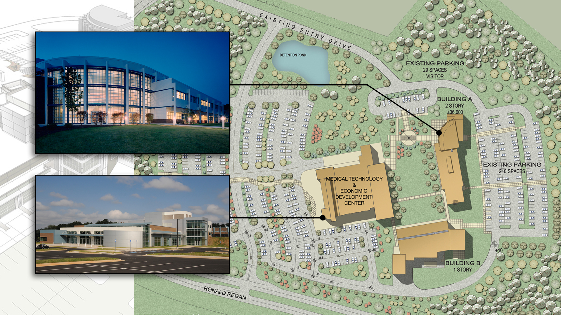 The programs offered at the college suggested a two-building solution. A pedestrian campus quad, bounded by the two buildings, left open the ability of a future third building to participate in the campus.