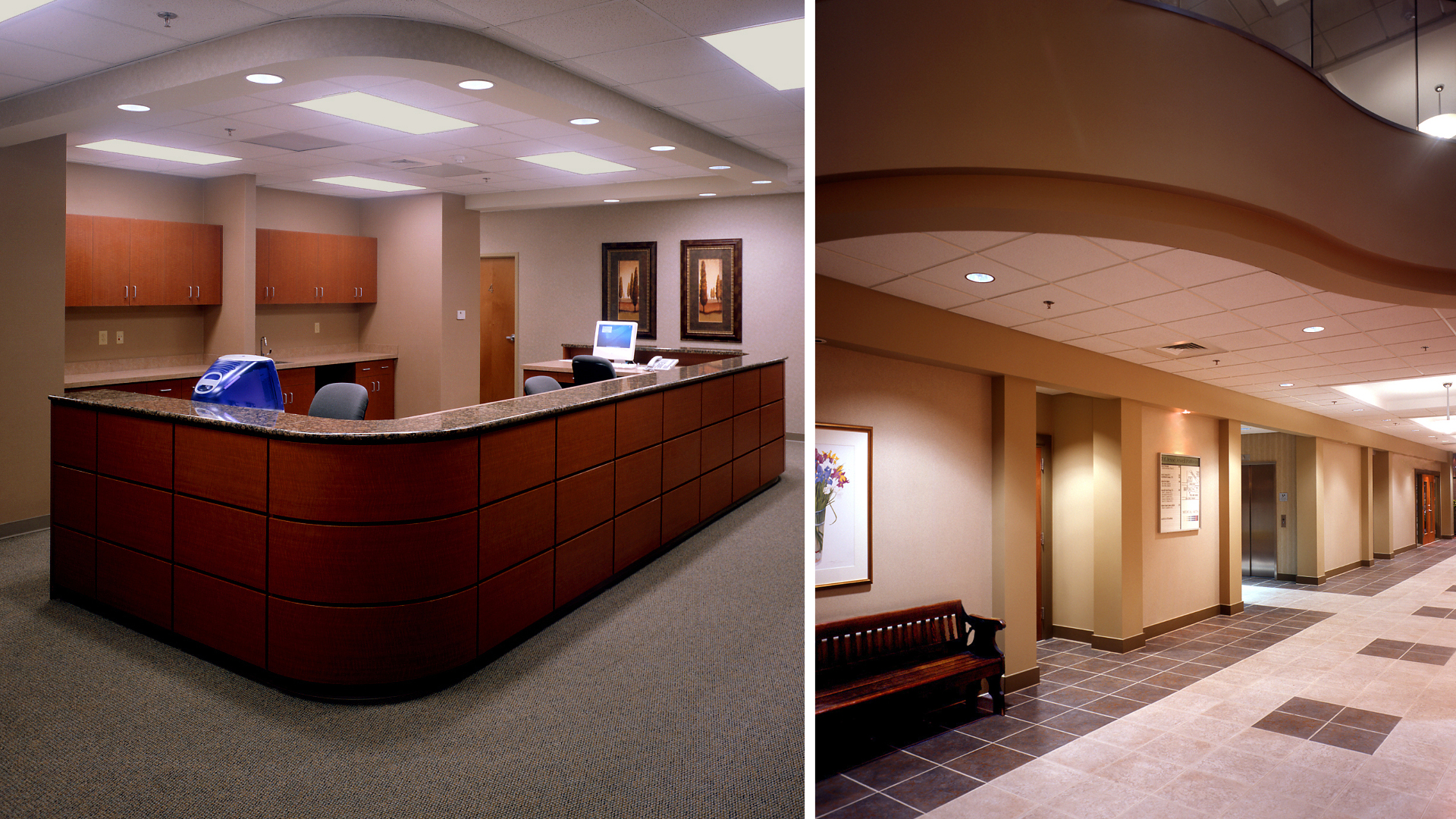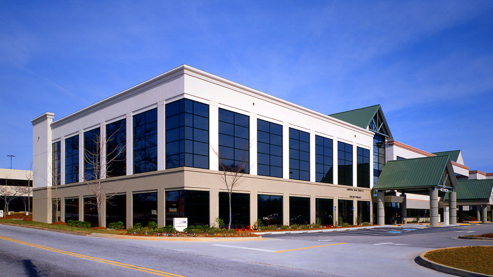 POH+W Architects designed the addition to this existing medical office, thoughtfully connecting the buildings through a 2-story atrium. The functional framework maximizes leasing flexibility and allows single or multi-tenant occupancy per floor. An elevated, conditioned pedestrian bridge connects the 3-story parking garage to the new building.