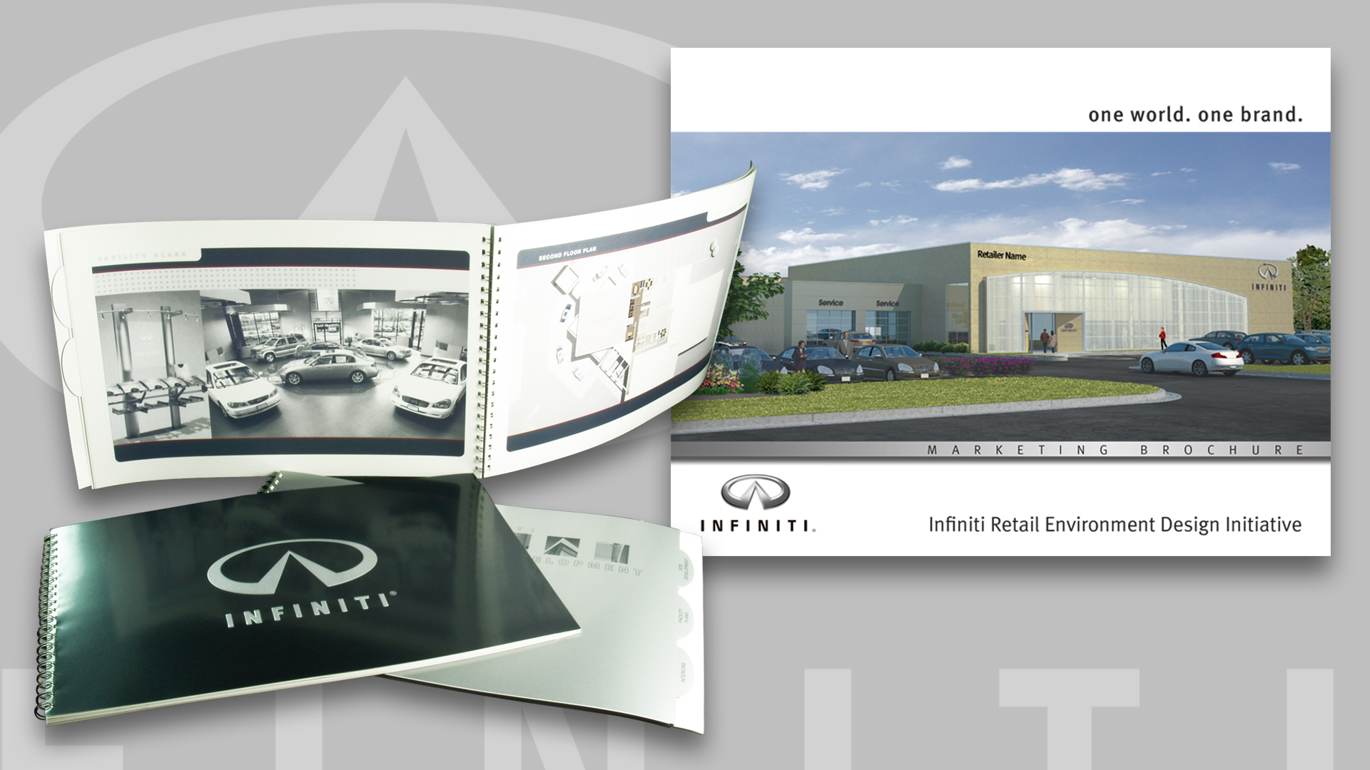 Our Infiniti brochure was designed to assist the dealers with color finish and fixture selections at their dealerships. The brochure was planned from the outset to accommodate quick updates of new colors or fixture changes to the dealership facility design. The cover features a deep embossed silver Infiniti logo skillfully printed with a deep metallic gray background. Rounded tabs were design to help with content organization while giving a thoughtful nod to the circular shape of the Infiniti logo.