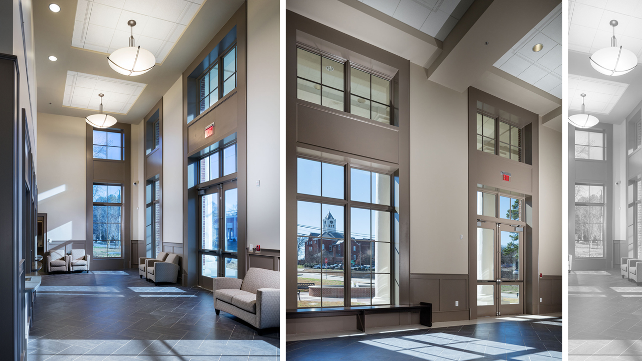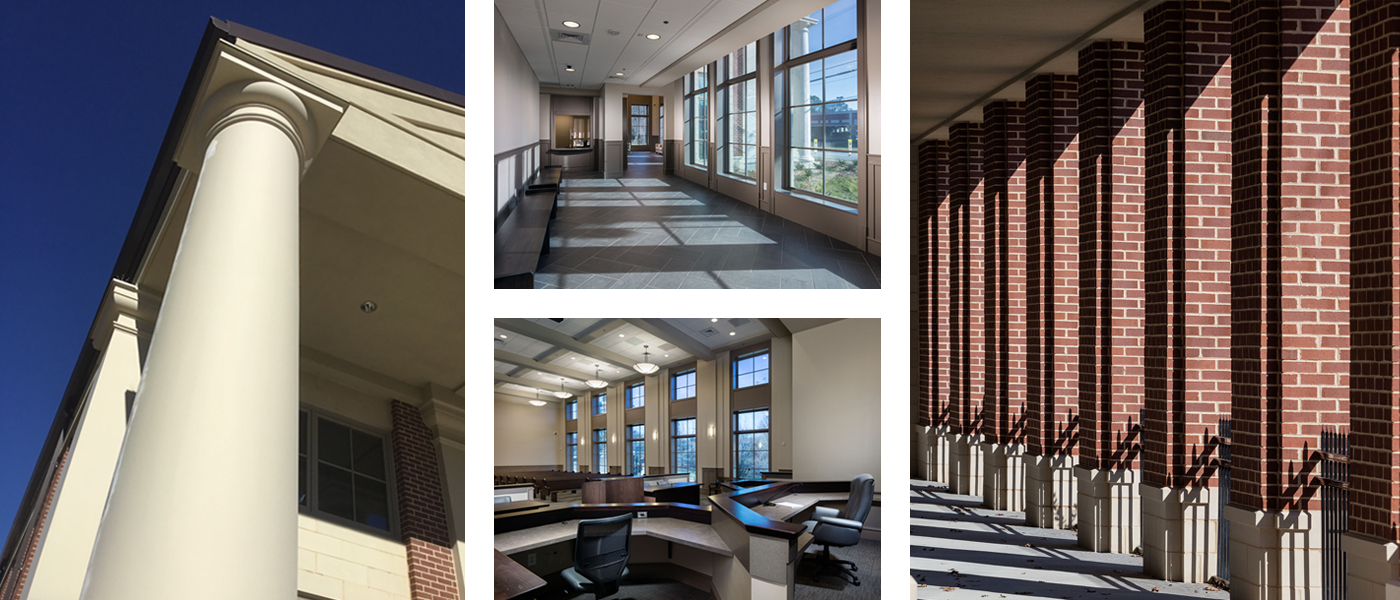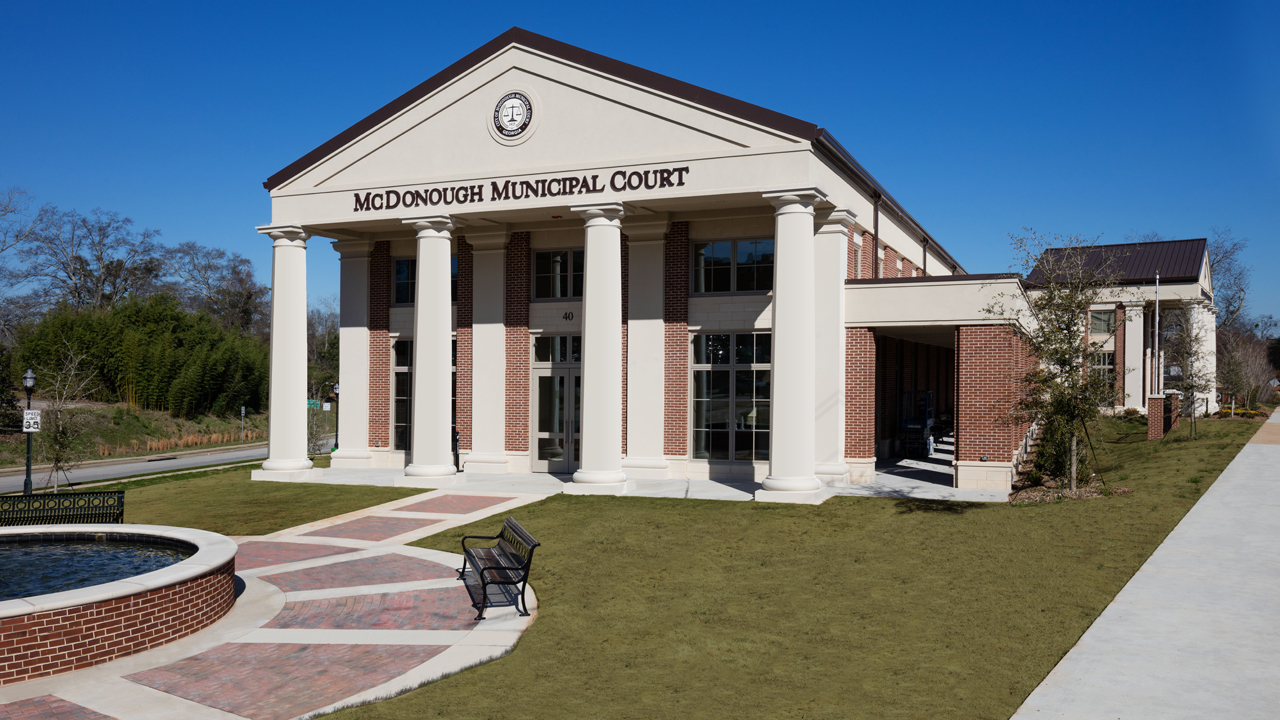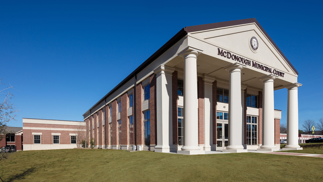 On a narrow site, one-block from the historic downtown, sits the new McDonough Courthouse. POH+W Architects positioned the civic building to face the quintessential southern city square. The familiar temple form of the new court building ceremoniously participates in the historic downtown. While the court entry is anchored by a plaza and fountain, the Clerk office entrance is positioned with convenient access to parking.