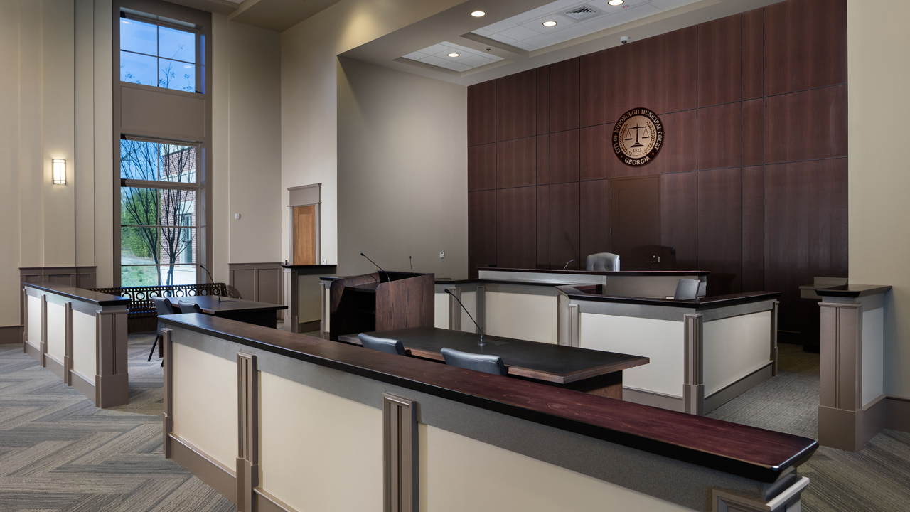 The traditional courtroom is focused on the judge positioned at the center. High ceilings and natural daylight are welcome amenities to the impressive room. The clerk’s office is efficiently configured for flexibility into the future.
