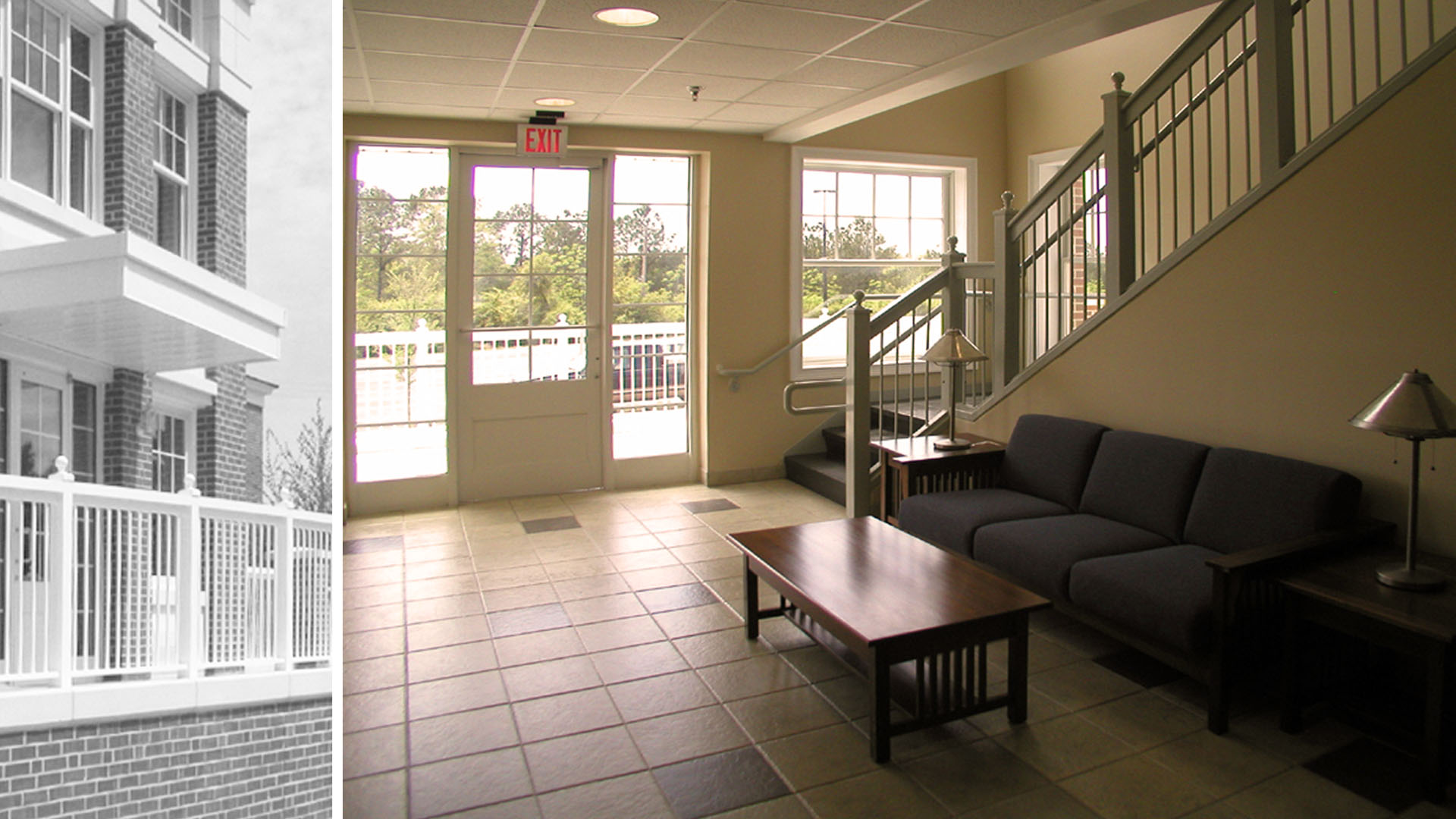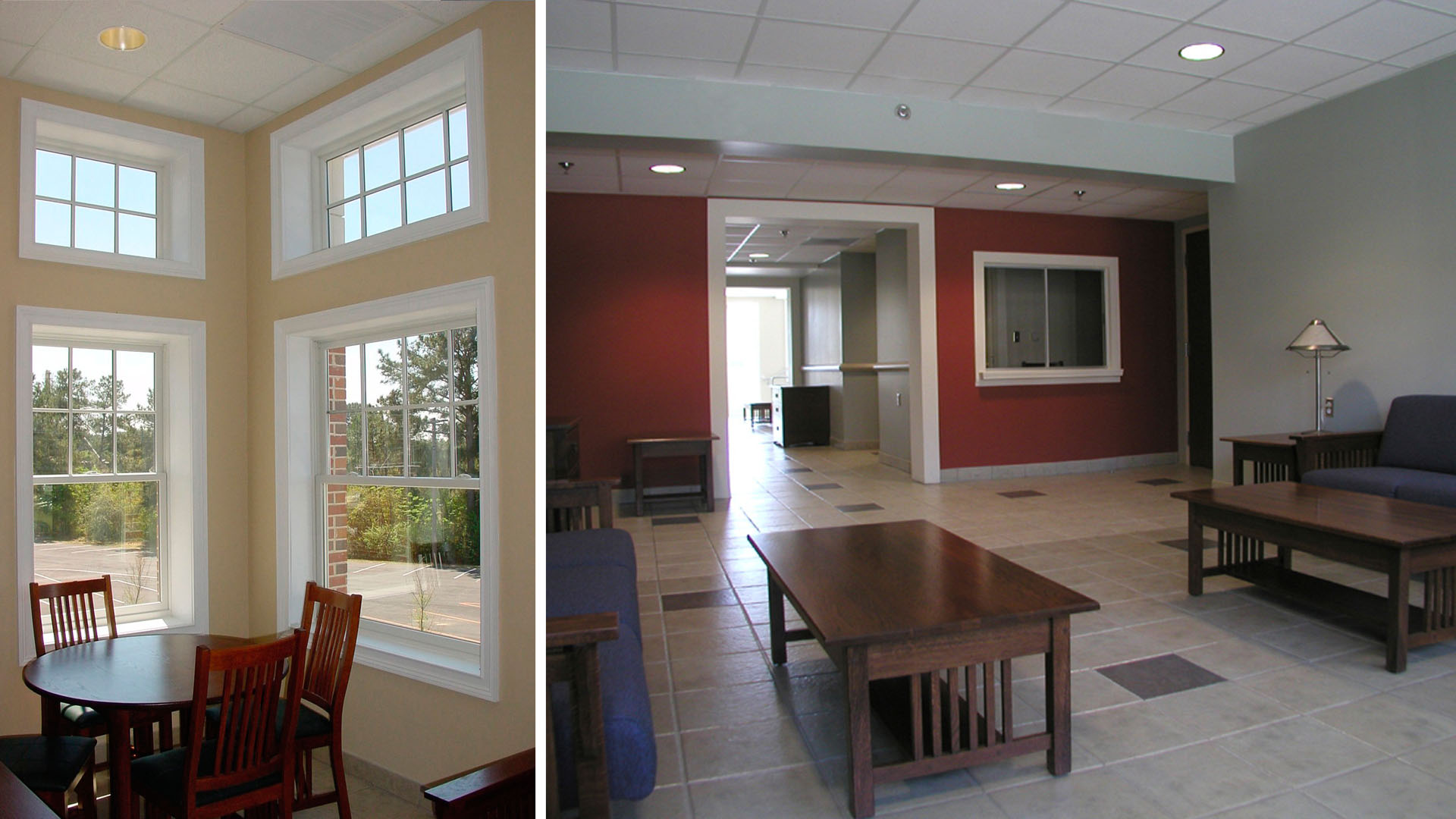 POH+W Architects creatively designed the layout of the interior that resulted in a 10% increase in the number of rooms over the original design. ADA accessibility to and throughout the existing building was sensitively accomplished on the rear of the building with a compact addition. The small addition provided a transition from the parking lot to the main level with a ramp and an elevator and monumental stair to the second level. A resident assistant apartment was also designed into the building.