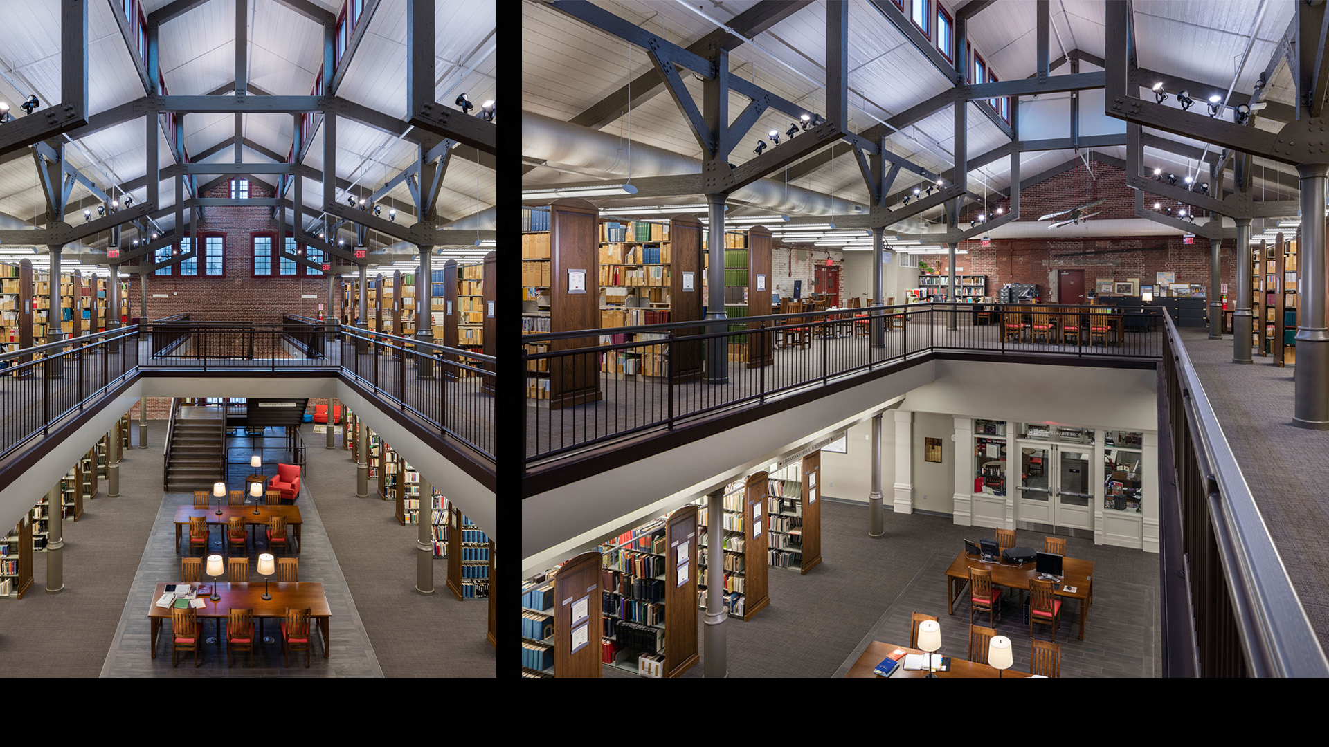 The design team felt it was important from the out-set that the interior coordinate with the historic nature of the envelope. The new library space would benefit greatly from natural light. With historical documentation of its former features, the design team reimagined the space as a connected, light filled inspiring space. New wood trusses were designed to recreate the former clerestory. New steel columns, articulated with details to emulate iron columns from a former era hold up the new trusses. The existing brick walls remained exposed to reveal their patina and tell the story of their past. The architectural team cleverly developed a stair design, completely open to view, to transform and become a fire escape in the event of an emergency. The team focused on patron flow through the library, arranged stacks to optimize material display, and organized strategic locations for key staff. Other modern materials were recruited to further complement the historic fabric. A wood floor grounds the area under the atrium and pressed vintage copper ceiling tiles continue the historic theme.