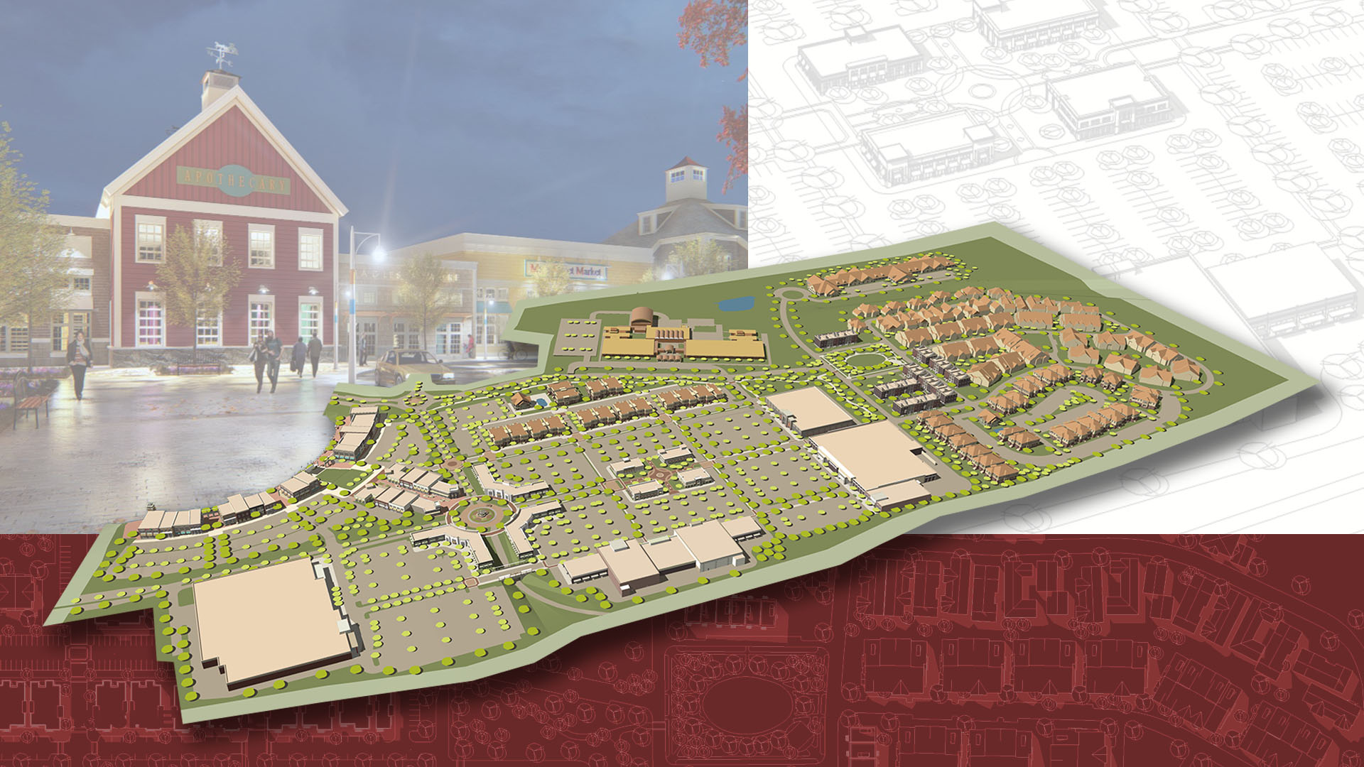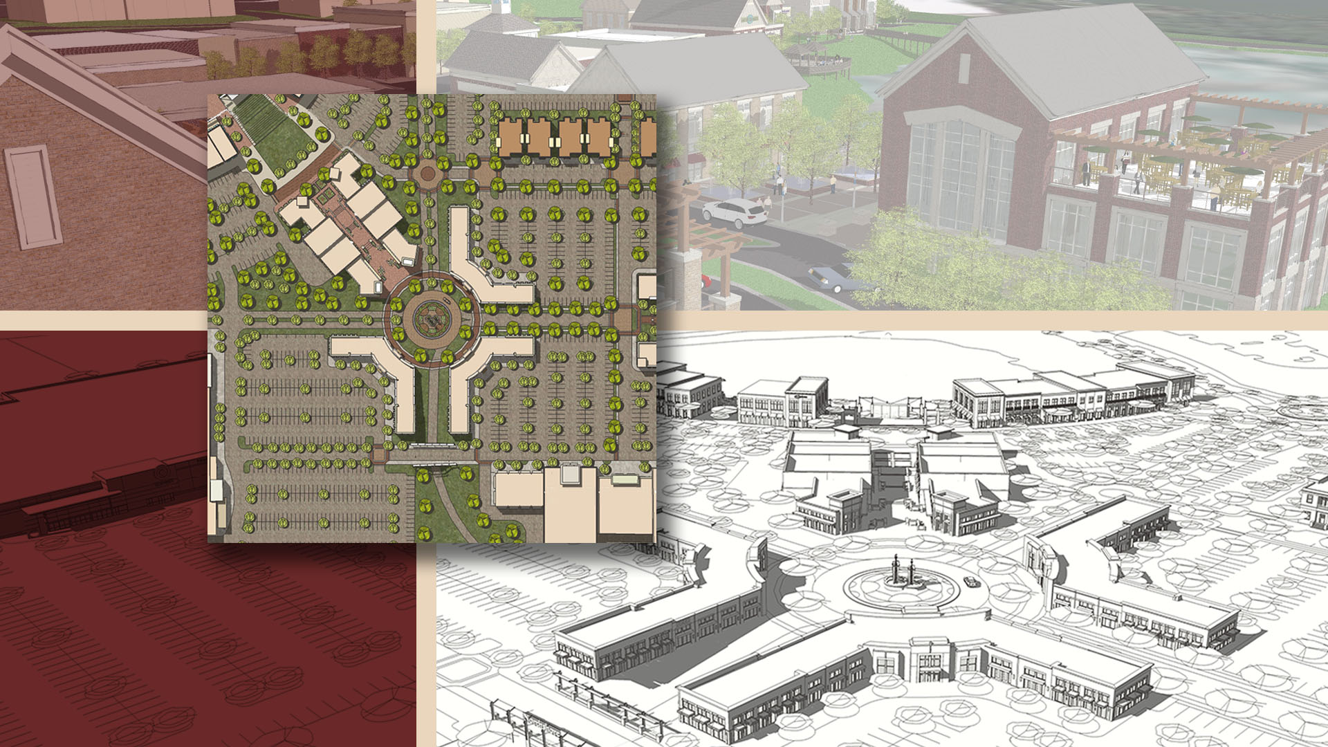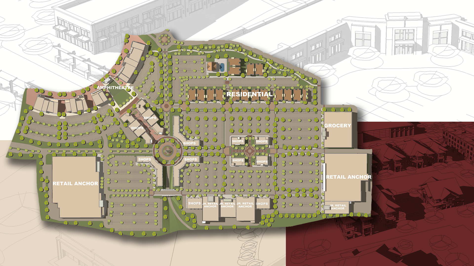 The parcel for phase 2 is situated around an existing pond which they want to develop as a retail/hotel and restaurant community of buildings that use the pond as the focal point. The developer hopes to attract multi-story restaurants that will feature decks and roof gardens overlooking the pond. The site is challenging in that it is narrow in width and has a 35’ drop in grade. The design team had only a few days to pull together images to show tenant’s what it can look like. Phase 3 is consists of a parcel adjacent to the Target building. It is more of a typical retail layout with various mini anchor tenants and a proposed two-story medical office building and fitness center anchoring the back portion of the site. The client attended the ICSC (International Council of Shopping Centers) Convention in Vegas in May and hopes to attract tenants to their development.