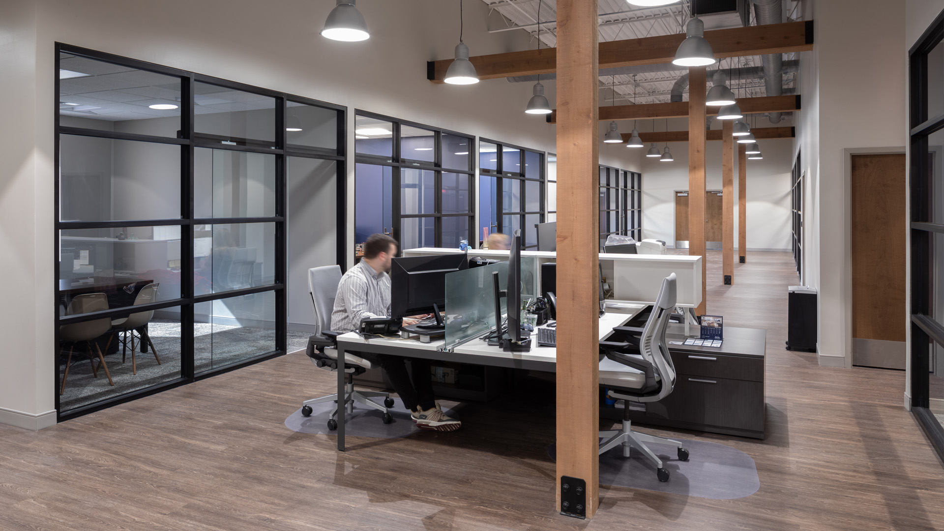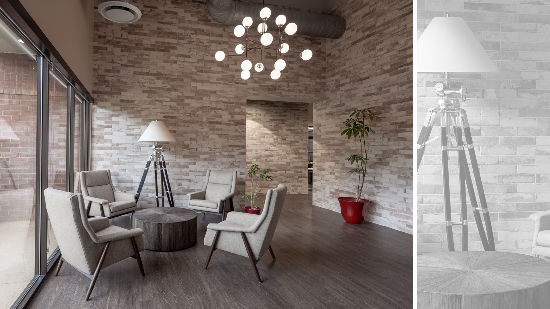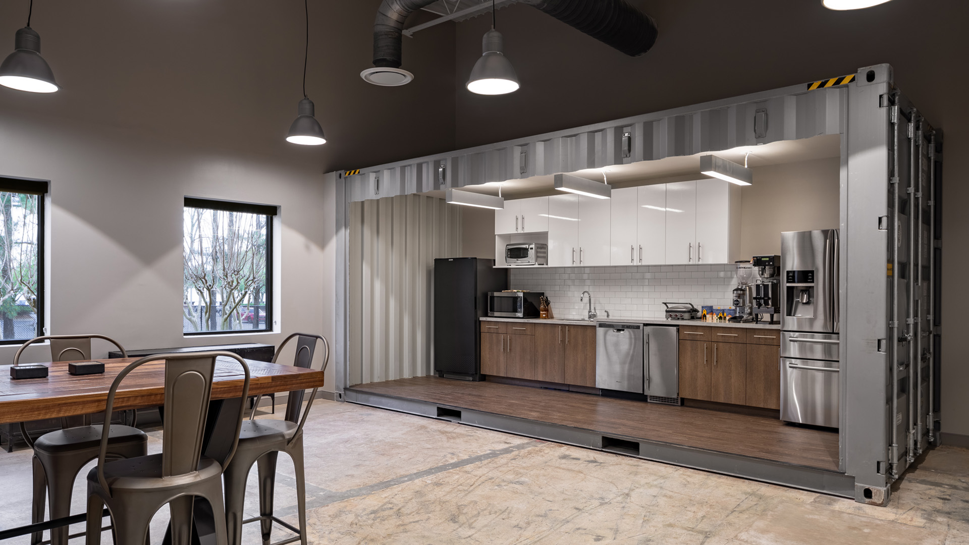POH+W Architects designed the renovation of an existing office building for the headquarters of One Source Relocation Services, a real estate relocation company located in Roswell, GA. The renovation involved changing a 1990’s building to an open office space with multiple conference rooms, offices, in-house dog play area for employee's pets and future expansion space. The client wanted an industrial, sleek modern feel to the new space with offices that open to a central core space to encourage collaboration. This dated, existing space was totally transformed by adding brick tile to walls, cedar beams and exposed ducting along with offices with sliding storefront doors and walls to give the space a completely open feel. POH+W introduced the unexpected by bringing in a shipping container as a feature in the staff breakroom. The side panel was removed and used to make a canopy over an additional refreshment area. With an indoor dog area for staff to bring their pets to work, this makes for a work environment that is totally first class.