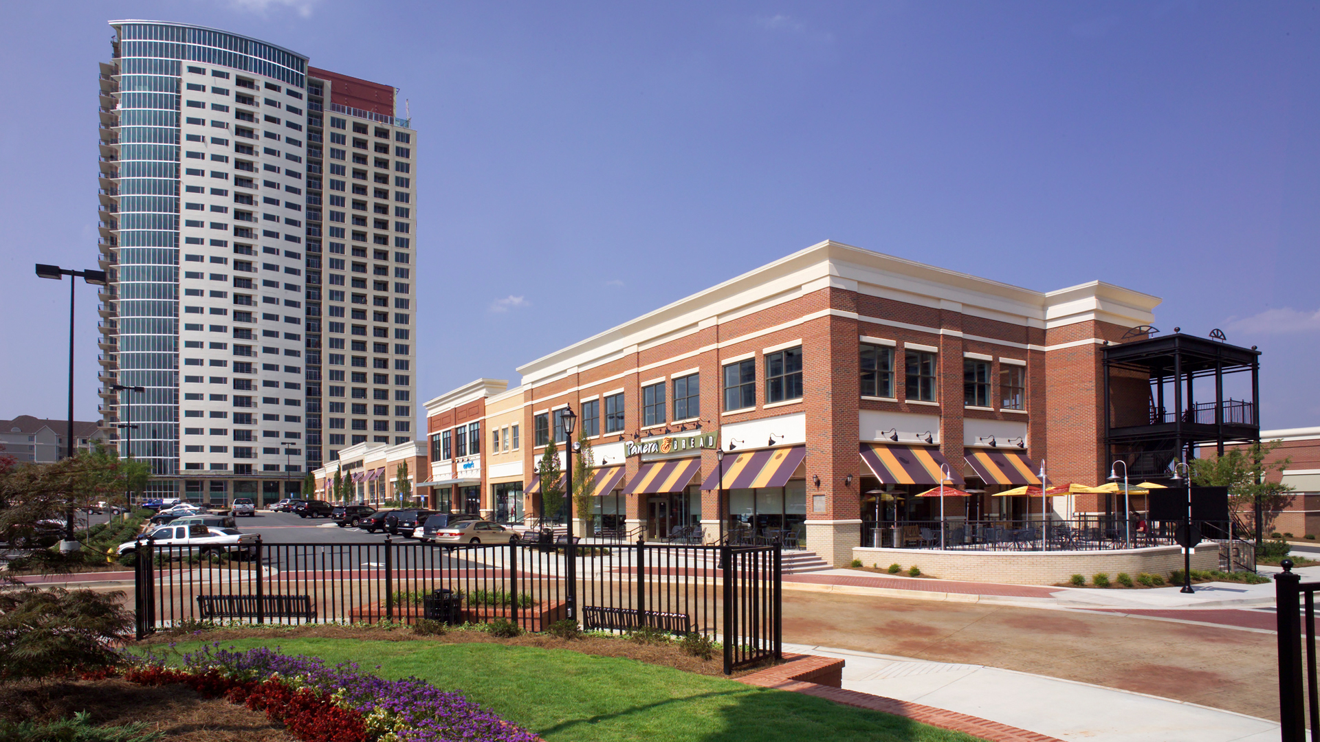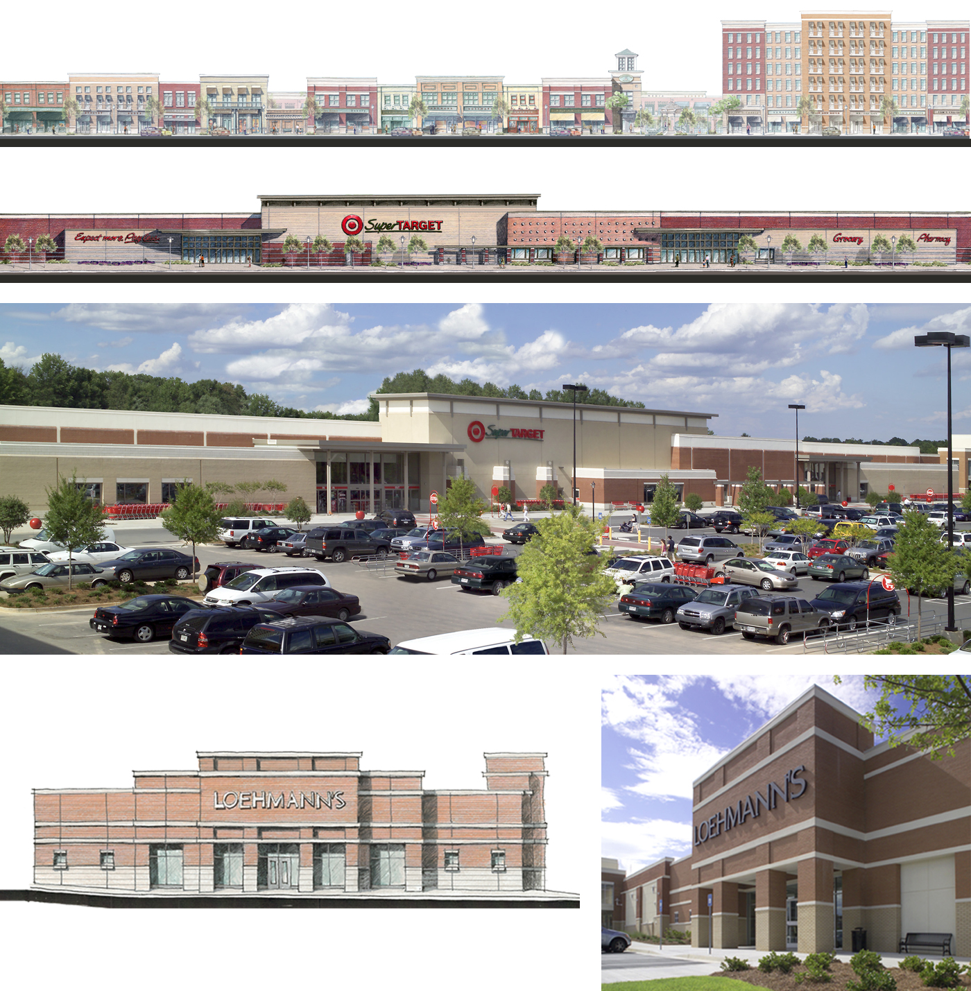 Designed with reminiscent aspects of a 1940’s retail district, the design features two residential buildings, complete with retail and office space to buffer the street edge. The walkable setting combines smaller retailers with national tenants, including Super Target, Office Max, Ross Dress for Less, Destination Home, and Loehmann’s, among a series of popular restaurants.