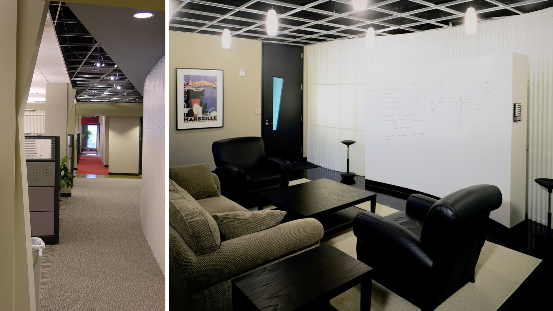 Tech companies require diverse types of collaboration spaces for their staff. POH+W Architects designed a full floor renovation for a young and spirited tech company. Workstations and personal space were reduced in favor of additional, unique meeting spaces. Soft conference rooms, resembling living rooms, with entire dry-erase marker walls to conventional conference rooms with table and chairs were designed. In total, 12 of these diverse places were created for sharing ideas and solving problems.