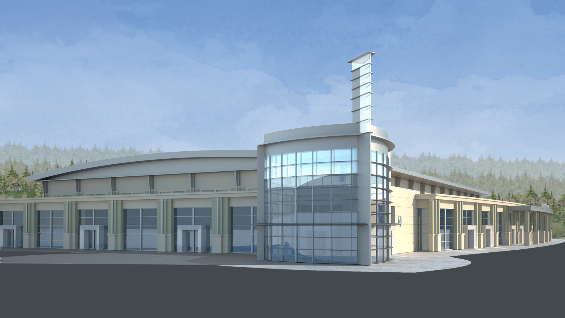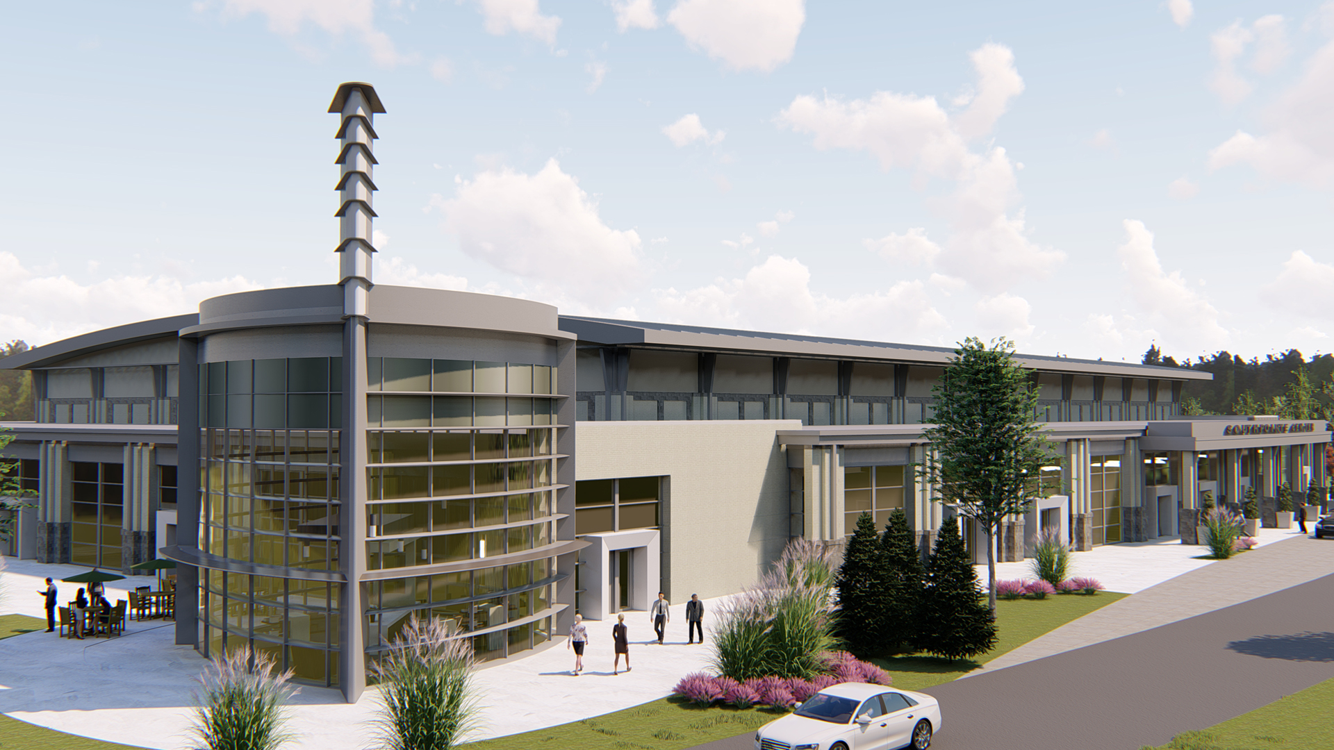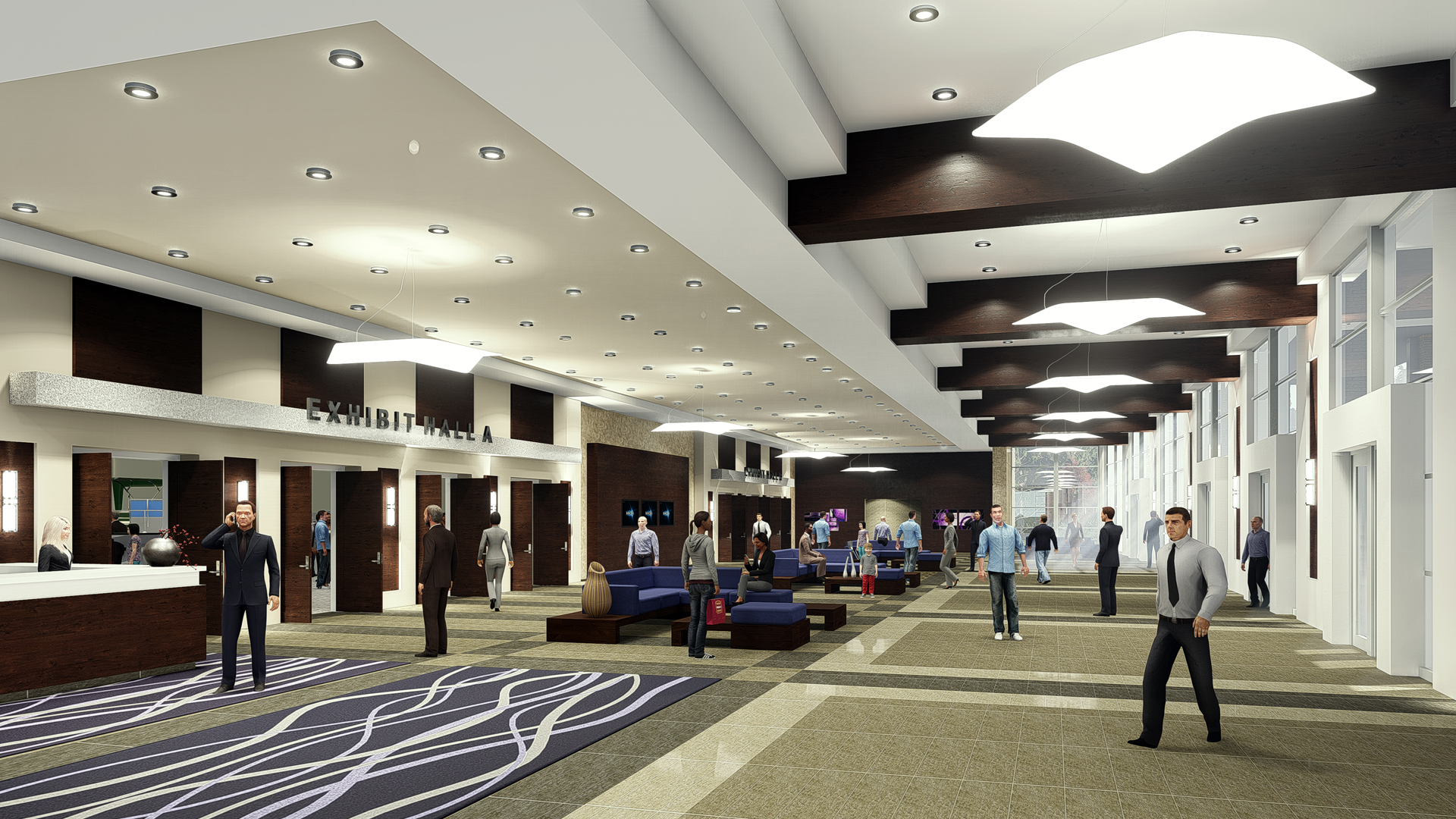 The modern corner tower hosts the café and anchors the lobbies that serve the ballroom and exhibit hall wings, creating a smooth connection through the center. Curved elements throughout the center direct, embrace, and welcome conventioneers.