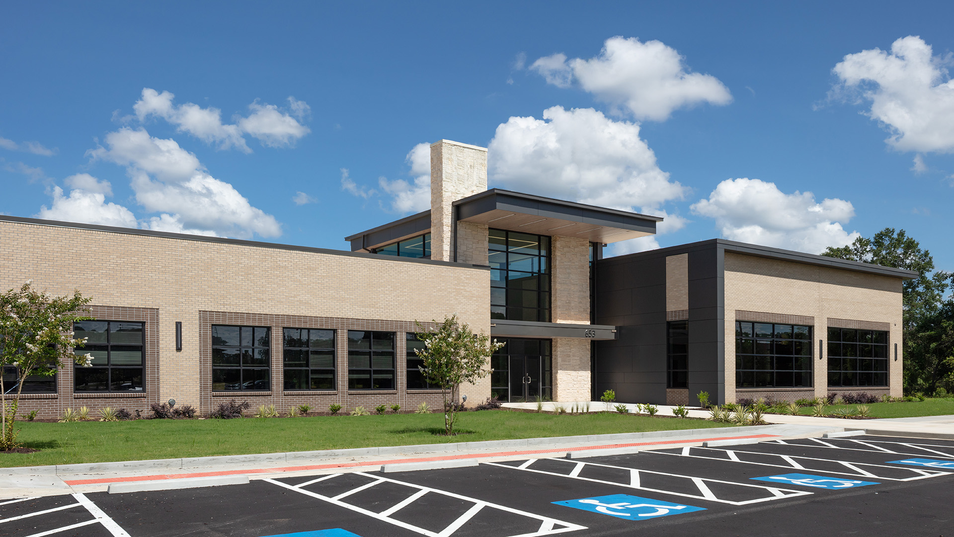 POH+W Architects designed this office building with a distinct aesthetic to reflect a progressive, technology-based company. The design includes deep horizontal and vertical wall and roof expressions, high ceilings, a clerestory entry and gallery, exterior covered employee dining space, and a contemporary materials palette including two-tone brick, high-efficiency windows, modular cementitious rainscreen panels, and thermally efficient TPO roofing.