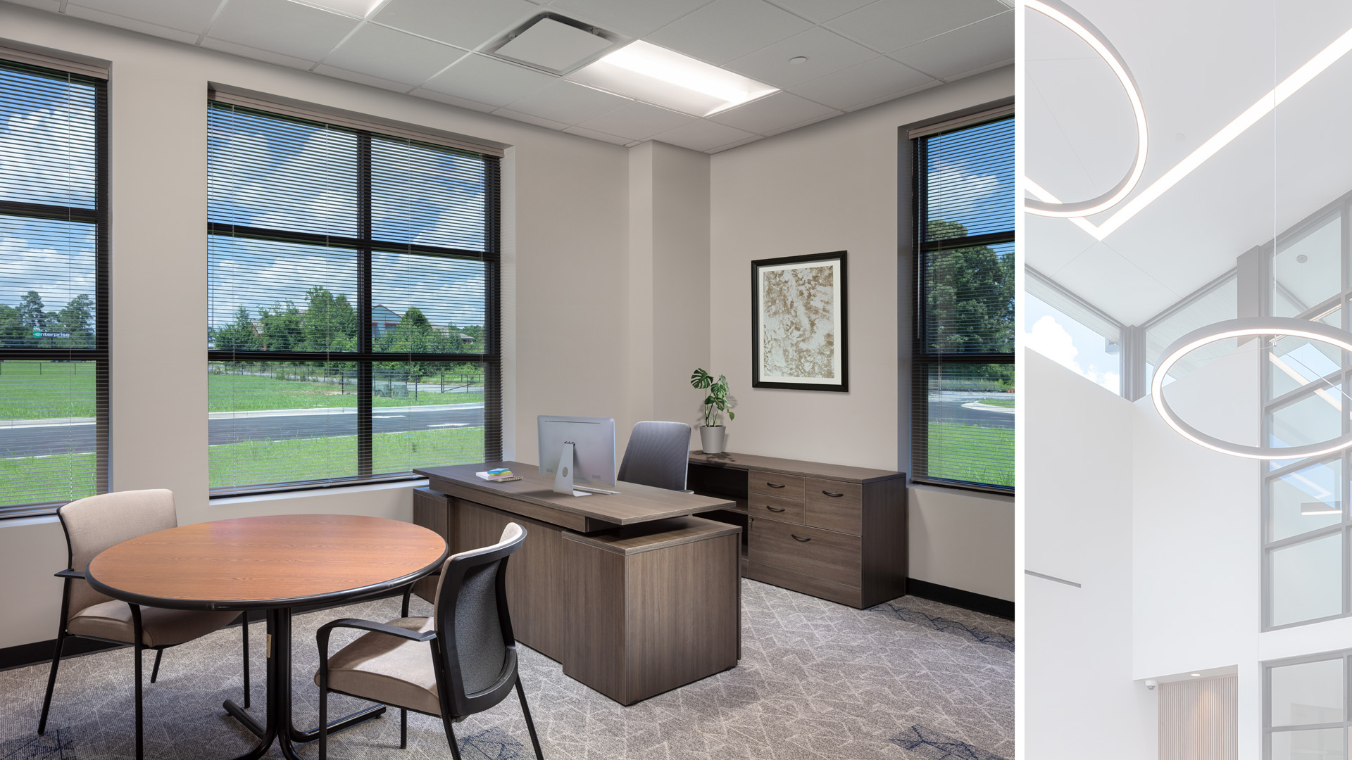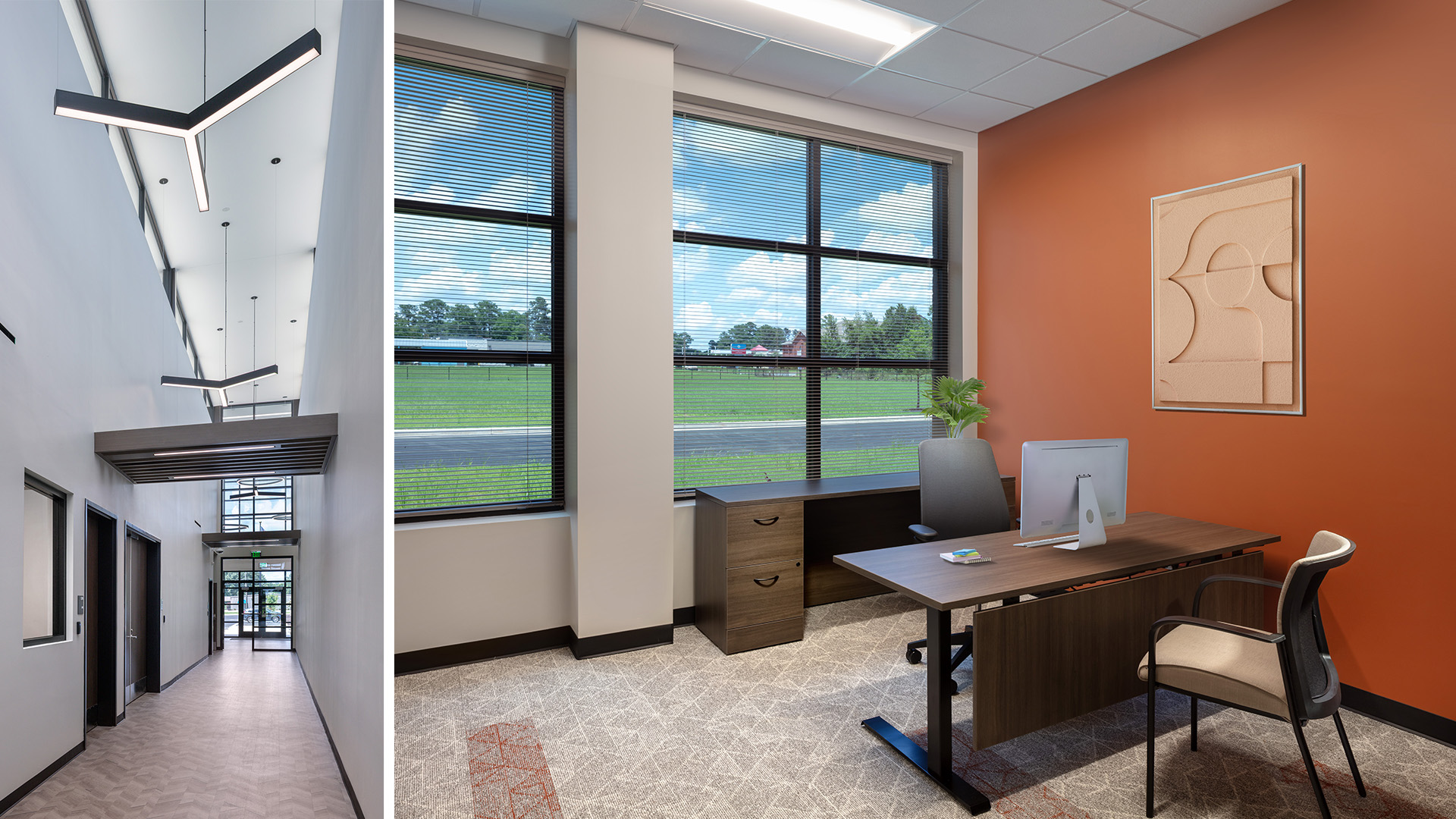 With the company’s expanding commissions with nearby defense organizations, the project incorporates the necessary spaces to offer services to their clients, such as soundproofed offices for private communications, spacious testing laboratories, large indoor/ outdoor breakroom & dining spaces, state-of-the art conferencing rooms, and inviting collaboration spaces.
