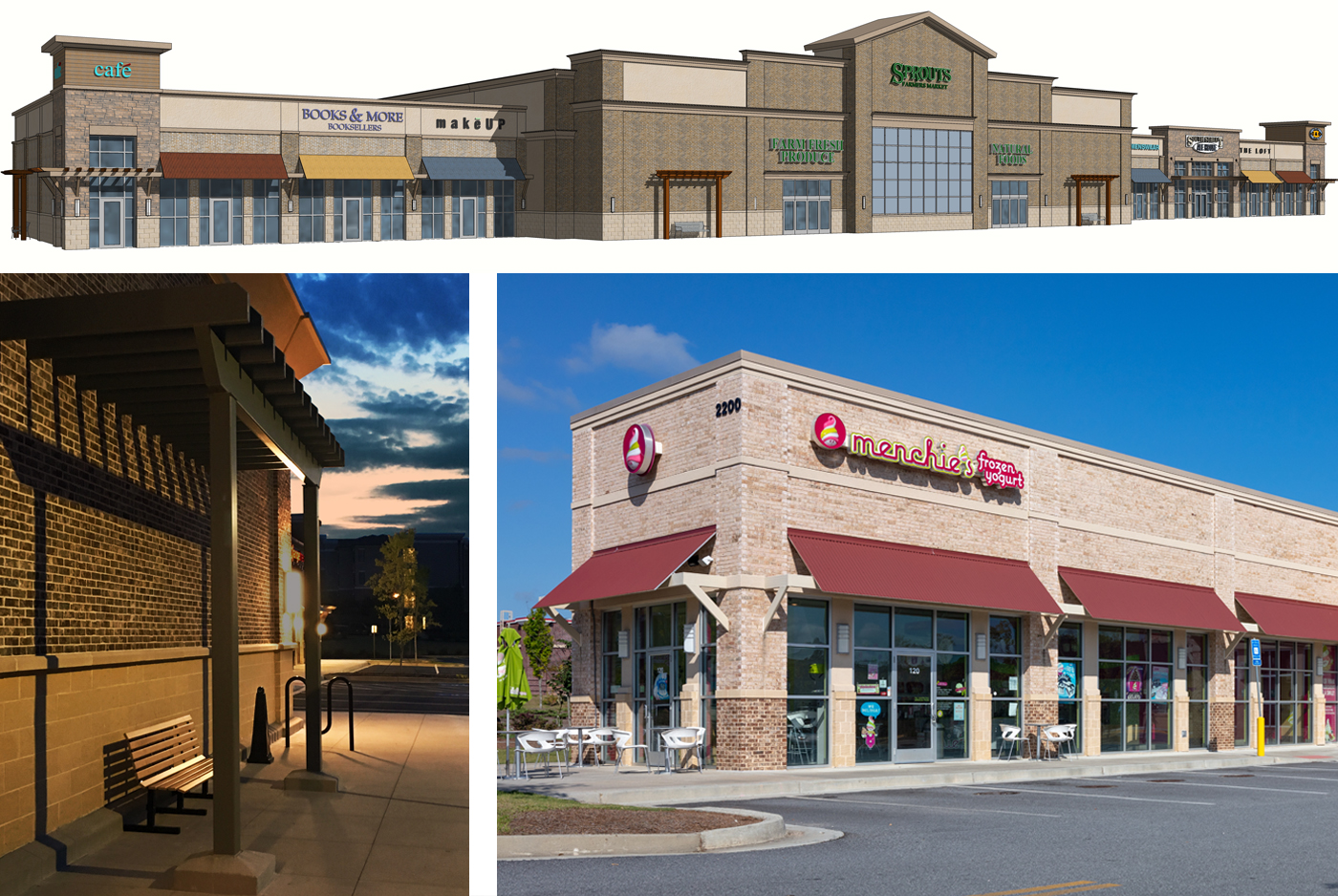 POH+W Architects designed the retail and restaurant spaces of Sugarloaf Marketplace. The development hosts an assortment of shops and restaurants, centered by Sprouts Farmers Market. The variety of awnings, decorative trellises, and brick detailing diversifies the street scape. Outdoor patios offer refreshing spaces for customers. The center benefits from the walkable, pedestrian scaled design.