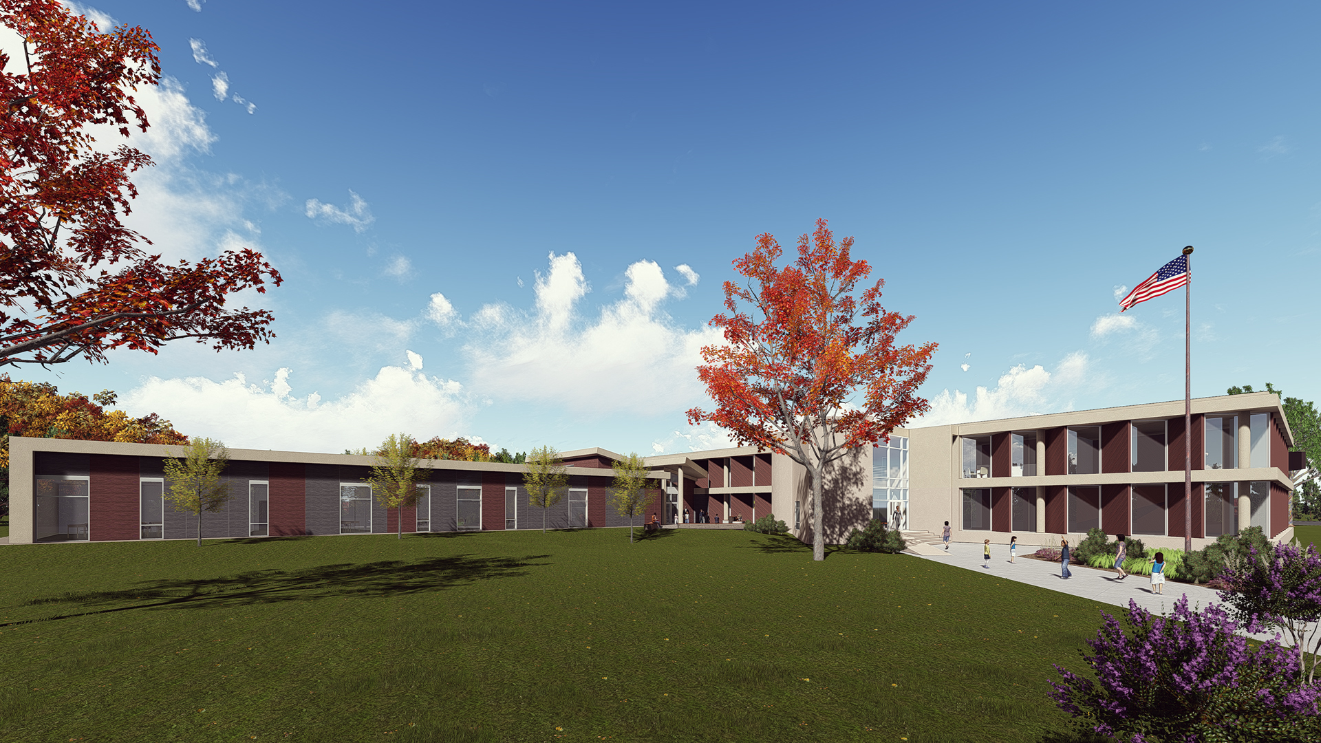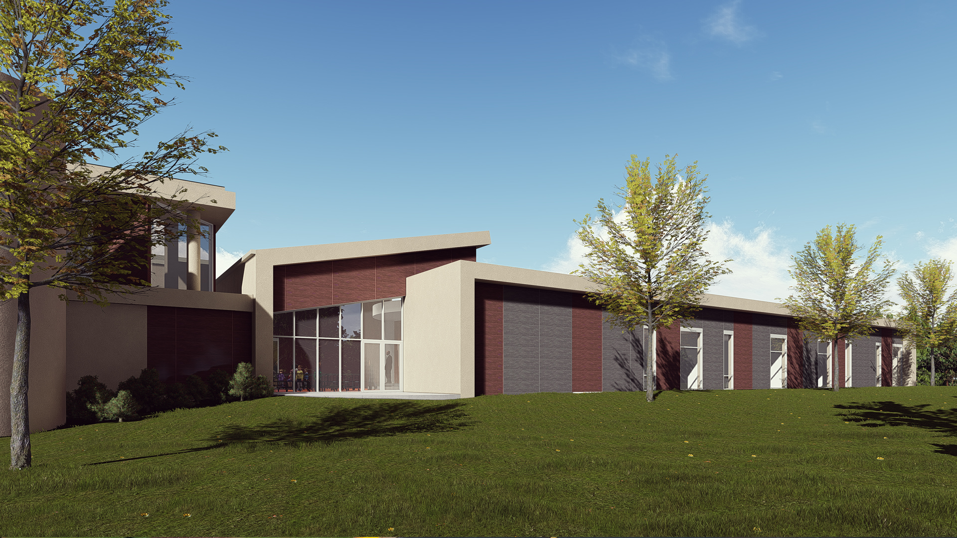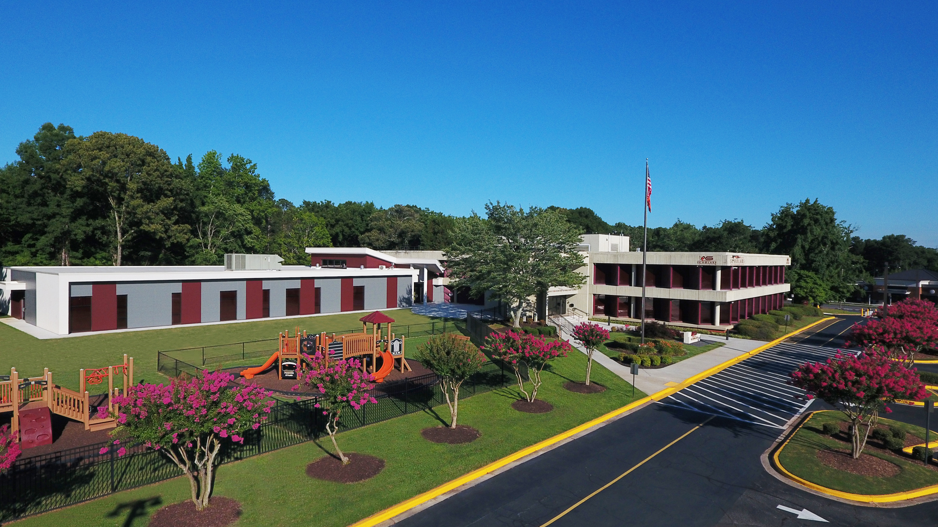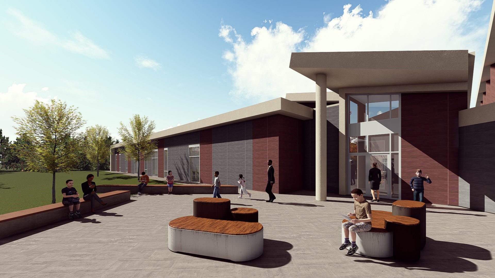Extensive safety and security features were developed for this conversion. A covered student drop-off and playgrounds are part of the many exterior design upgrades.