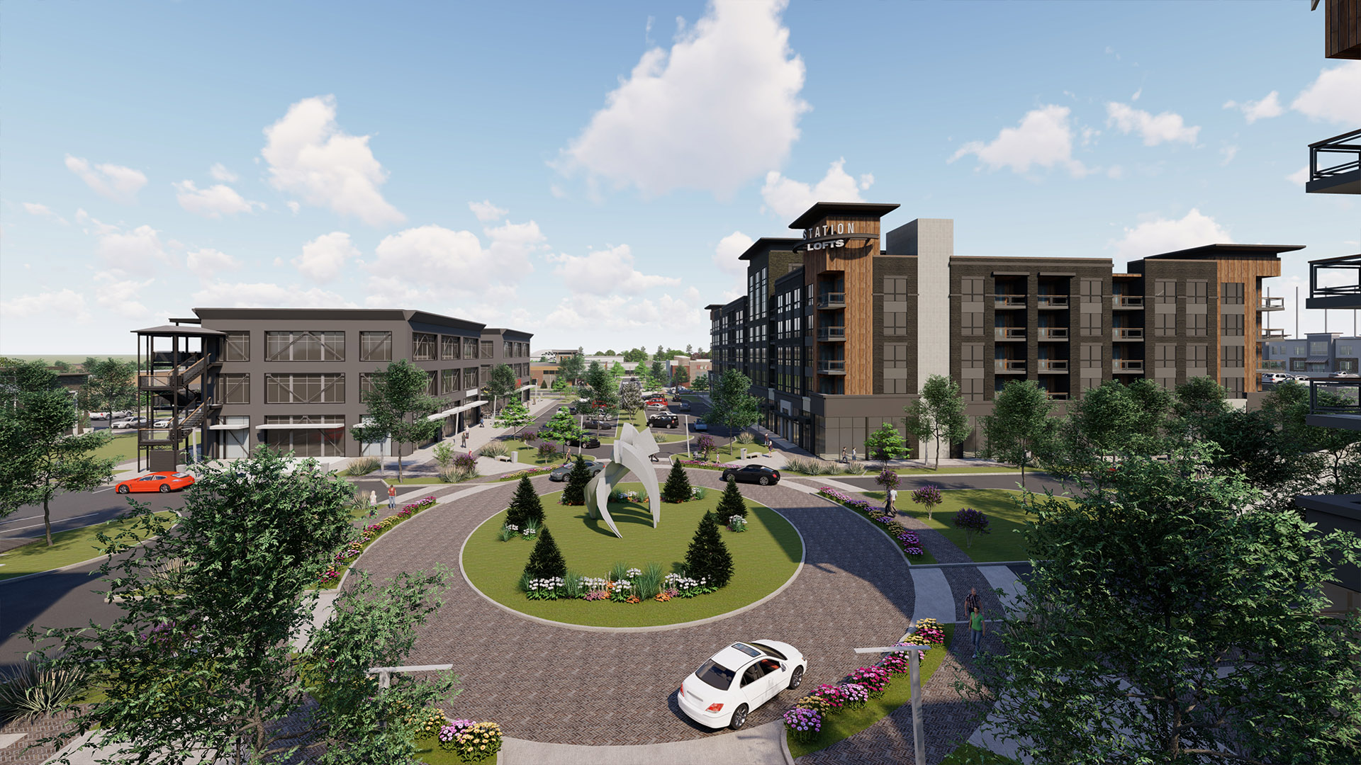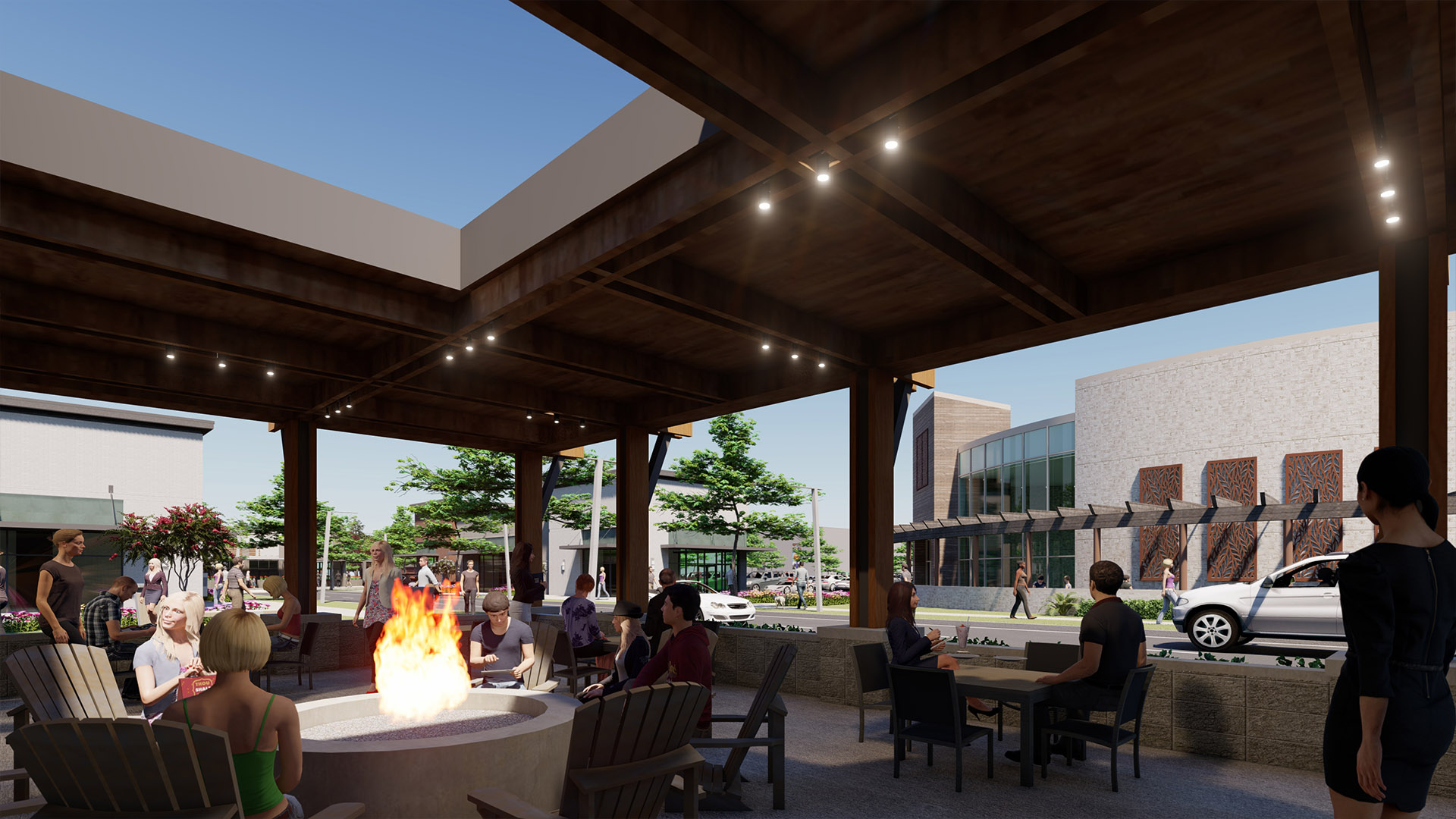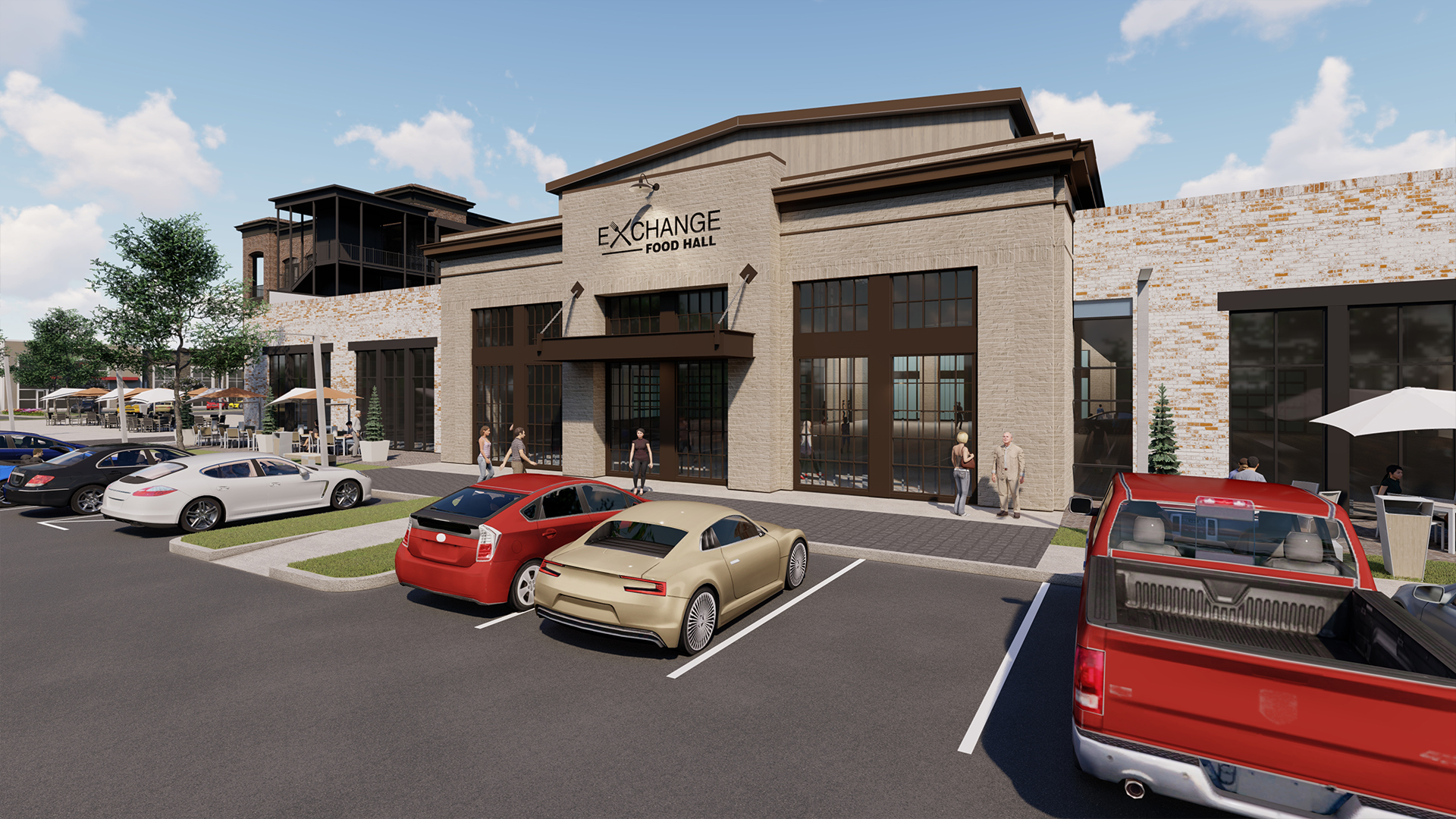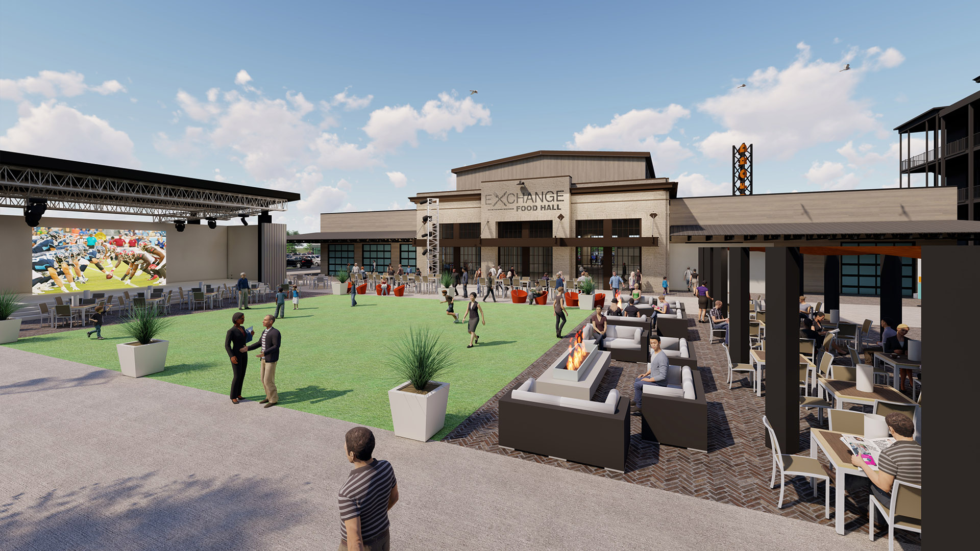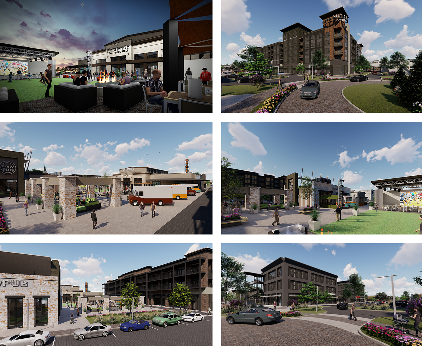POH+W designed the unique food hall experience to anchor the new development. Embracing a mid-century industrial flavor, the building was envisioned to recreate an adaptive-reuse envelope to contrast with its innovative offerings. Twenty-five unique and inspired food vendors will present distinctive dishes for visitors to explore. A blend of energetic environments are interwoven into the experience. A central dining hall forms the heart of the interior while the outdoor green space activates the development. The town green is designed to be a focal point where residents and visitors can gather in a common area ideal for demonstrations, exercise, live music, or streaming sporting events.