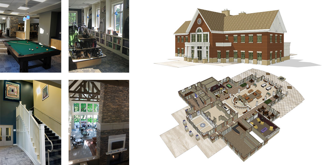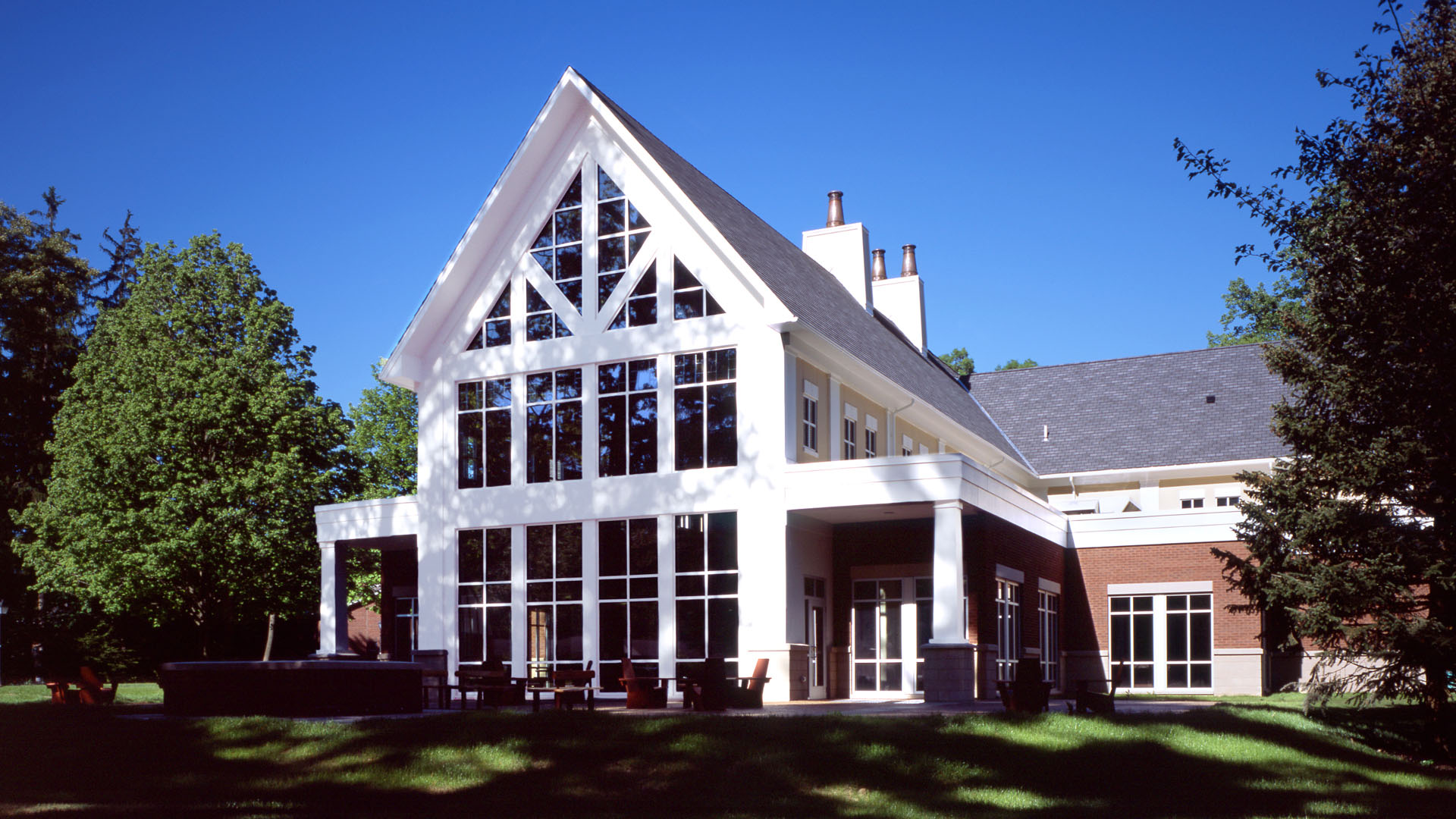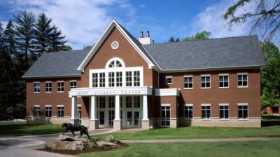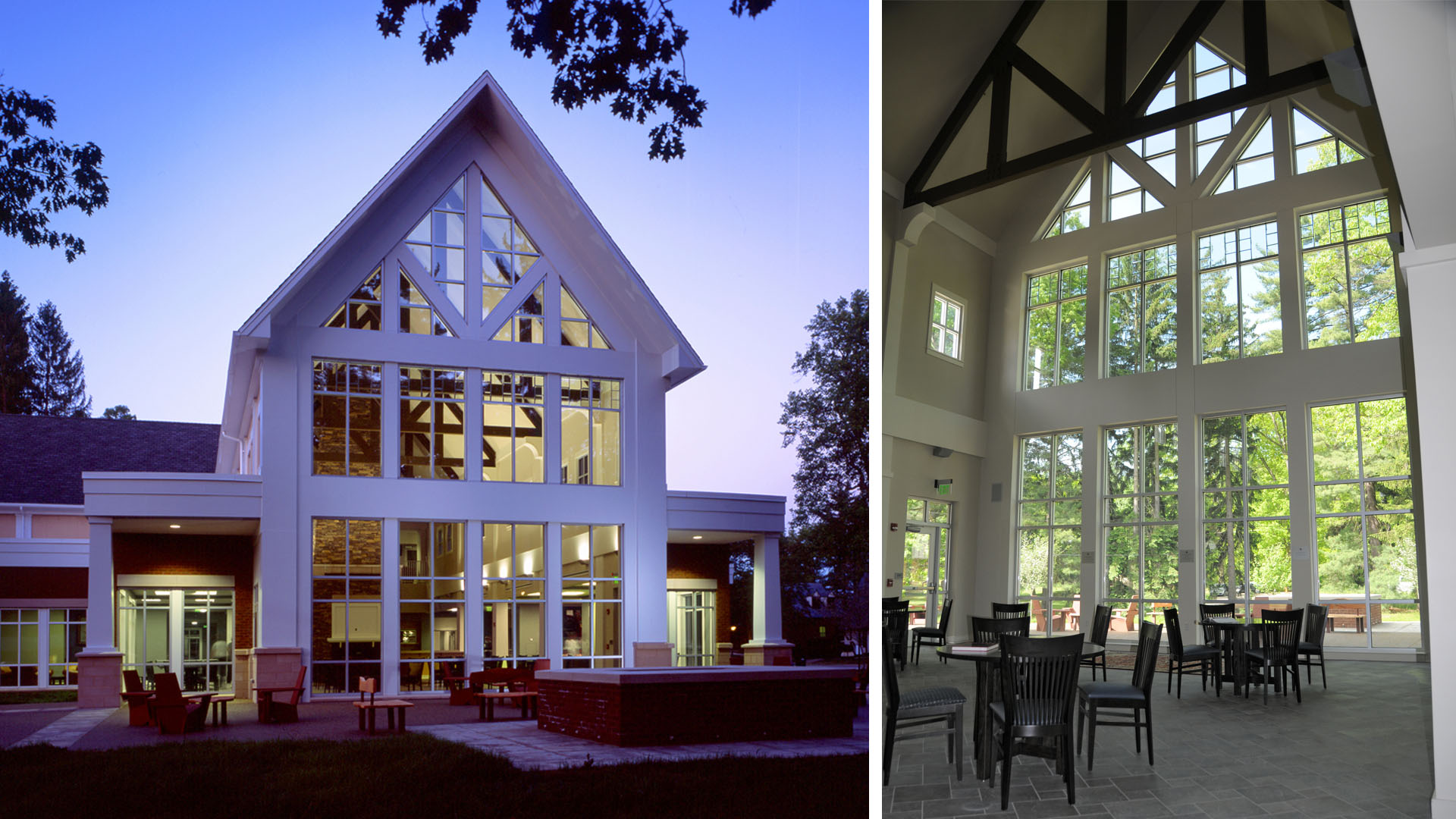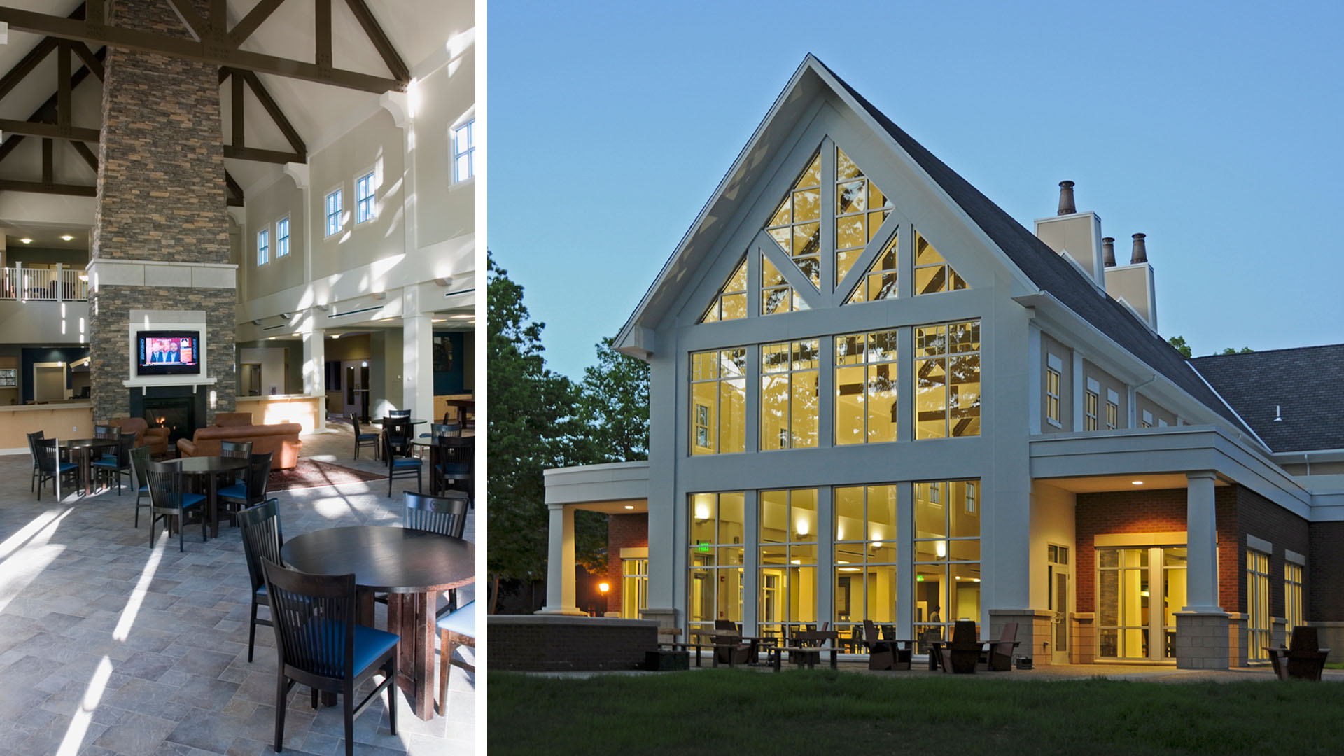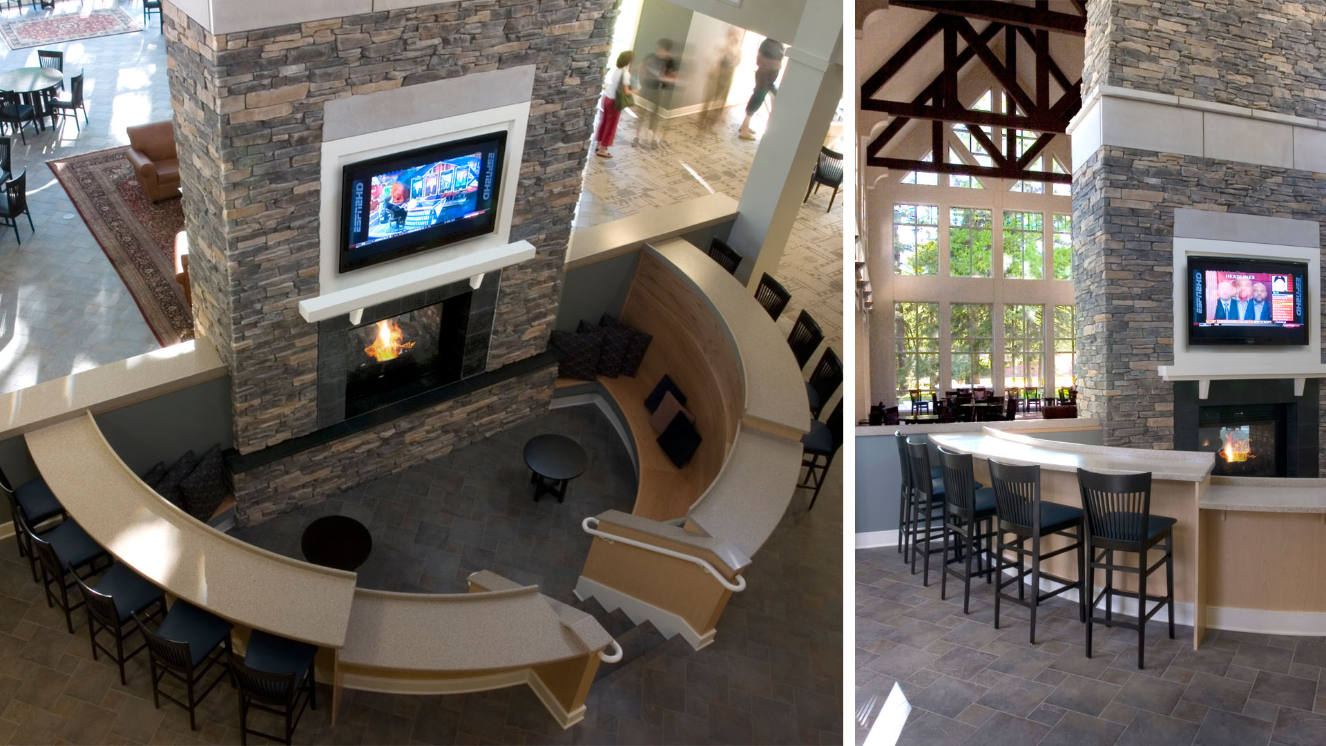 Students play games, watch TV, grab a snack and have fun throughout the center. A massive fireplace anchors the main gathering space. Enormous iconic windows look out upon the idyllic campus setting.