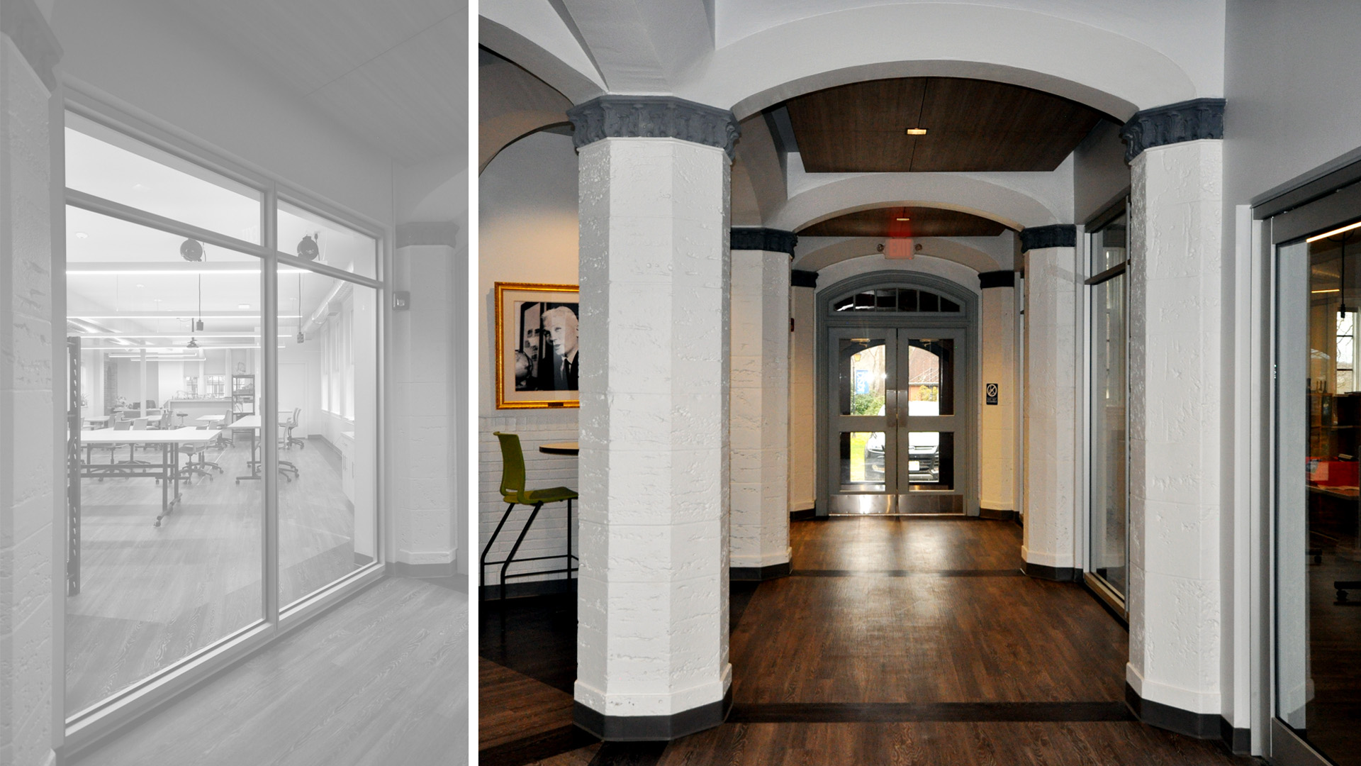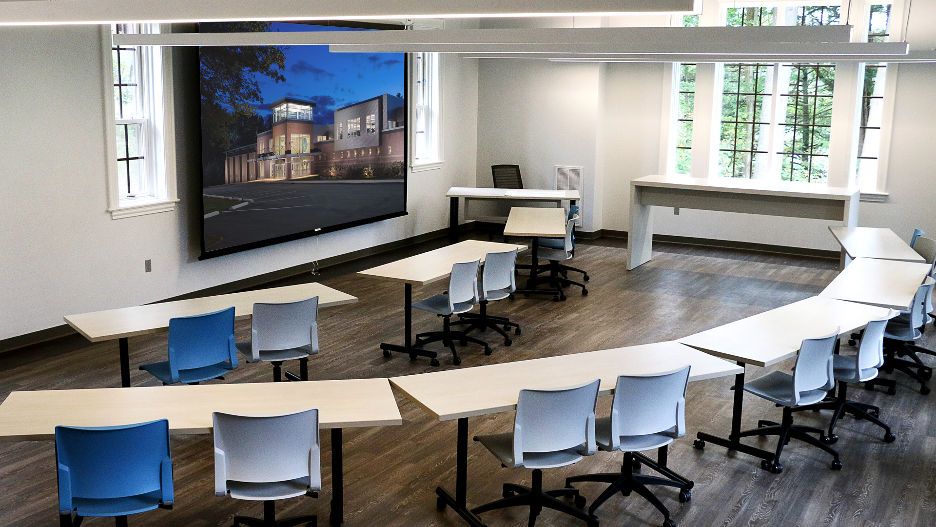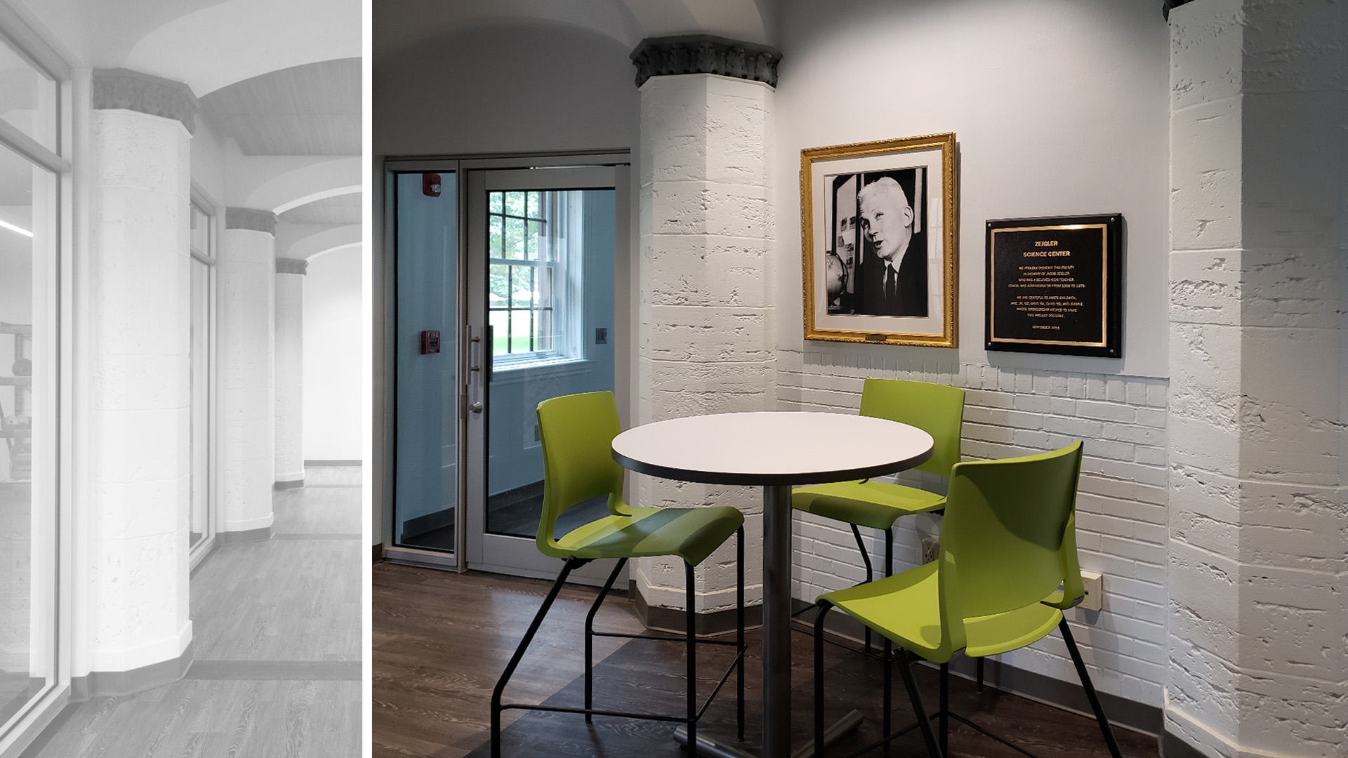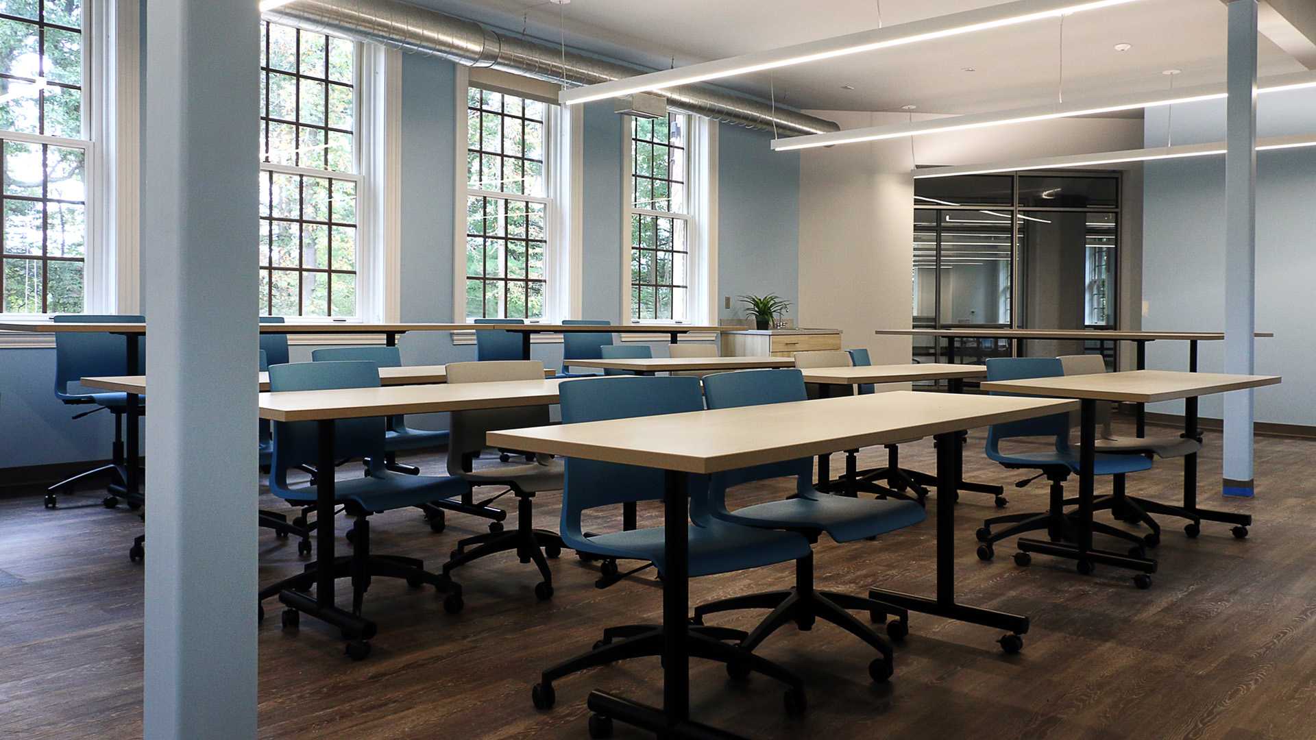 The design carefully preserved the historic exterior and certain elements of the interior, including the ornate columns and curved archways that serve as dedication to the original building. The project also refurbishes the Heath Hall science wing, updating the existing chemistry and biology classrooms to create an improved, functional space. Glass corridors link the two wings, presenting open views to brightly showcase the accomplishments and unique projects within each classroom. The thoughtful design enhances the connection to the outdoor learning space and to the other departments, emphasizing the unification of the campus.
