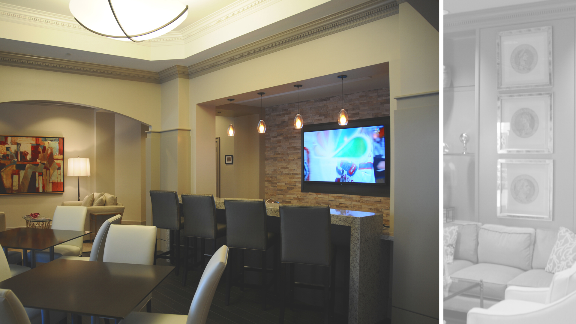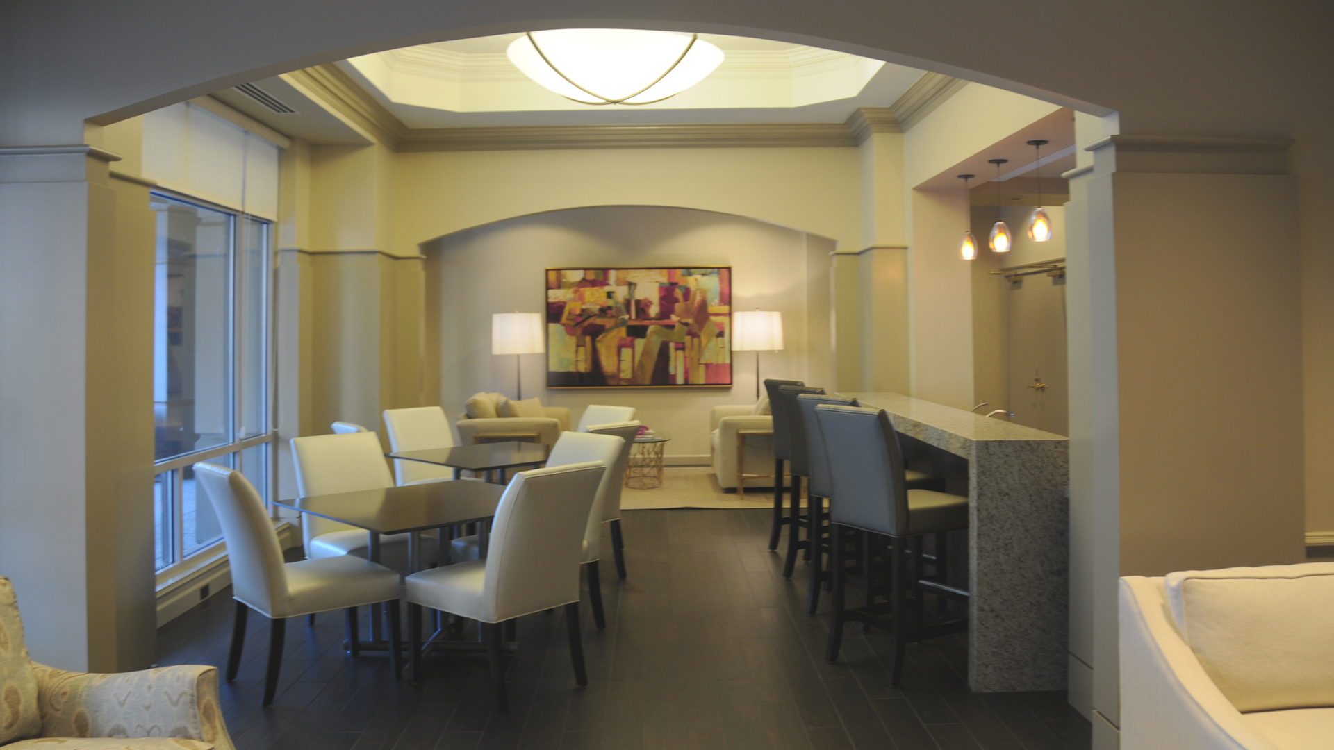 POH+W Architects’ design of the lobby, clubroom, and conference room renovations in this condominium building dramatically renewed the outdated spaces. The revitalized clubroom combined four under-utilized spaces to create the perfect social setting. The large windows present views of the courtyard while the space features a variety of intimate, comfortable seating to accommodate events.