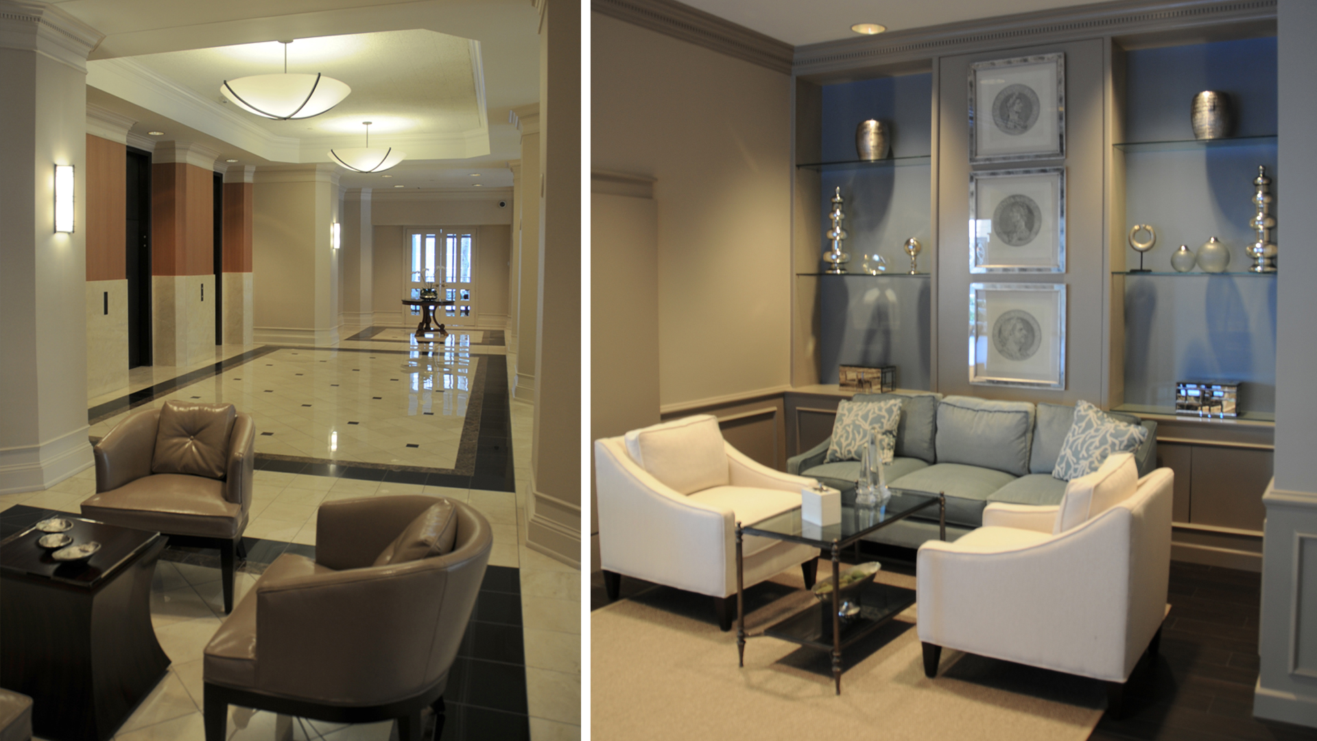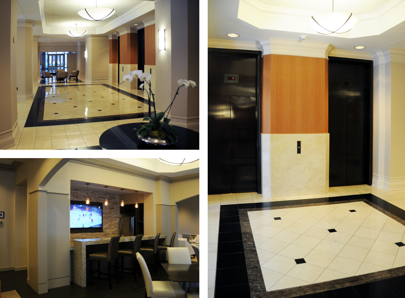 While maintaining the existing configuration, the lobby renovation offers a rejuvenated, classic look with marble wainscot, marble and granite tile floor, wood wallcovering, and new light fixtures.